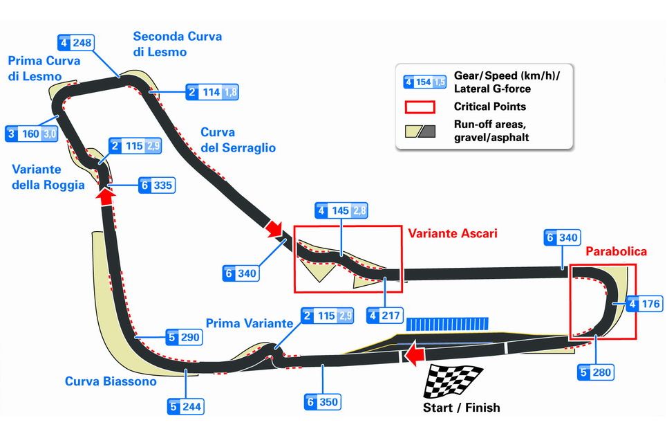 Monzáé a Forma-1 abszolút sebességcsúcsa is szintén 2004-ből, amikor is Pizzonia V10-es Williams-BMW-je 369,9 km/h-val repesztett. A mai V8-asok lassabbak, "csak" 340 körül poroszkálnak. Fékes kanyar alig van (körönként kétszer mondjuk 340-ről 80-100-ig lassítani is kihívás), a váltóáttételezés hosszú, a futóművek beállítása relatíve lágy, az aerocsomag kis leszorítóerőre optimalizált, a Pirelli a közepes és a kemény keveréket szállítja, kerékcsere vélhetően csupán egy lesz. Két DRS-zóna van (az egyik a Parabolica bejáratától, a másik a Lesmótól az Ascari sikánig), s mivel száraz, meleg idő várható, elvileg nem fog beleszólni semmi a lóerők harcába.