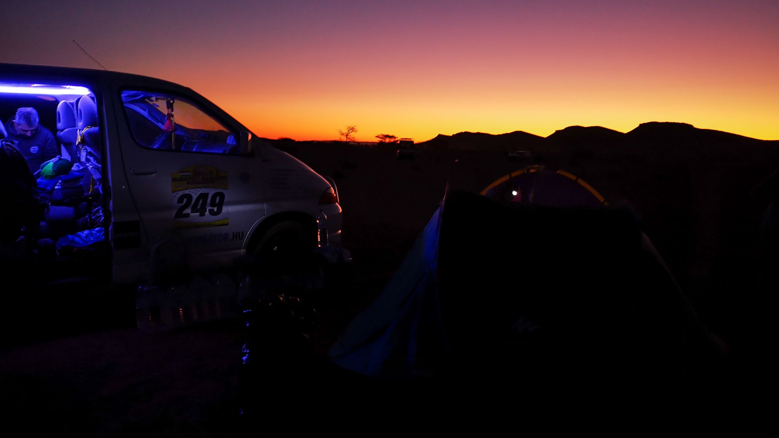 Csupán a kijelölt kősivatagi táborhelyünk megközelítése nem volt zökkenőmentes a közel 3 tonnáig pakolt autónkkal. Ugyanis a táborhelyre vezető ösvényen a kocsi alváza többször felfeküdt a felezett görögdinnye méretű köveken. Így amellett döntöttünk, hogy a legkönnyebb női sofőrt ültetjük a volán mögé az éjszaka közepén. A csapat többi tagja pedig gyalogosan kísérte az aszfaltúttól 4 kilométerre lévő táborhelyig (bivouac) a hintót.