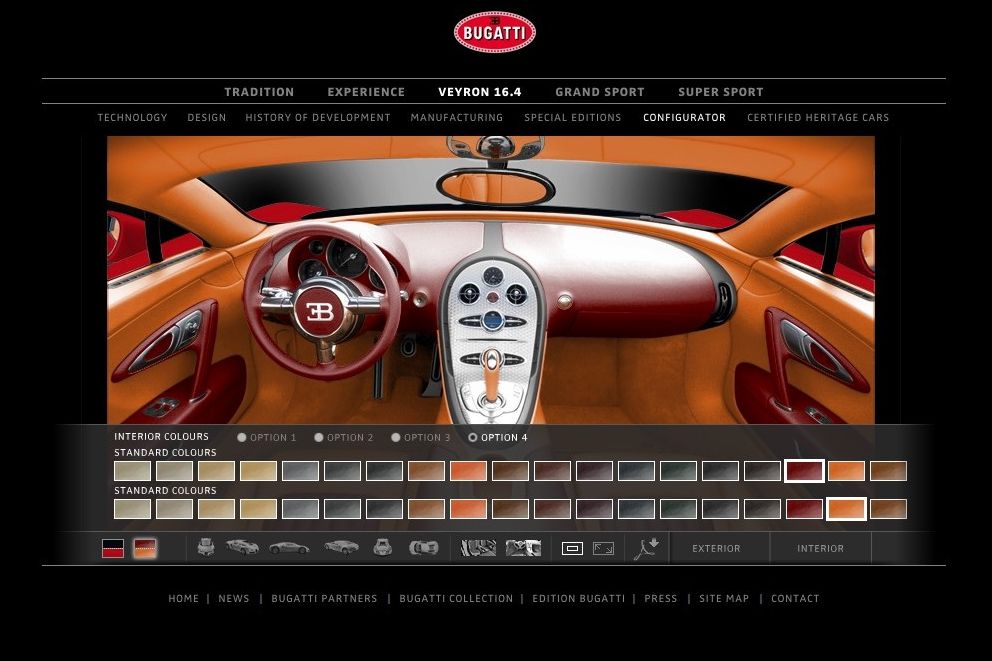Rendben, elfogadom, hogy prémium szinten presztízsnövelő tényező az igényes konfigurátor, de hogy a Bugatti miért készített a Veyronhoz ilyen webes szolgáltatást, arra nehéz értelmes magyarázatot találni. Az imént említett, az átalagember számára elérhetetlen Ferrari és Maserati tömeggyártmány az alapáron egymillió eurós szupersportkocsihoz képest, amelyet előszeretettel vásárolnak az olajbizniszben vastagon érdekelt sejkek – akik adott esetben kettesével rendelik az ilyen járgányokat. Nekik szólna, hogy milyen külső és belső színeket párosítsanak, mi az, ami jól mutat, és mi az, ami nem? Ötleteket, tippeket szívesen fogadok!