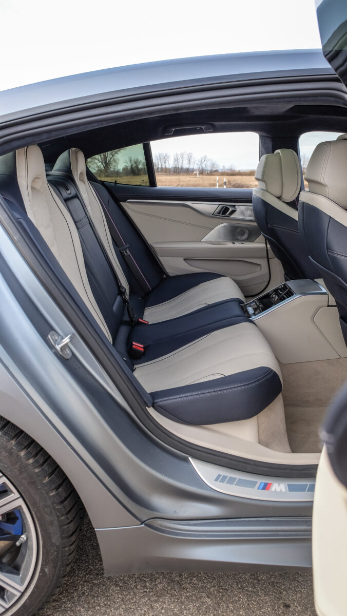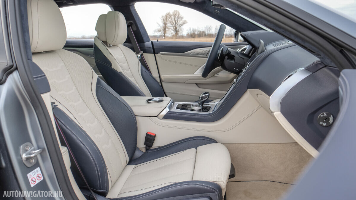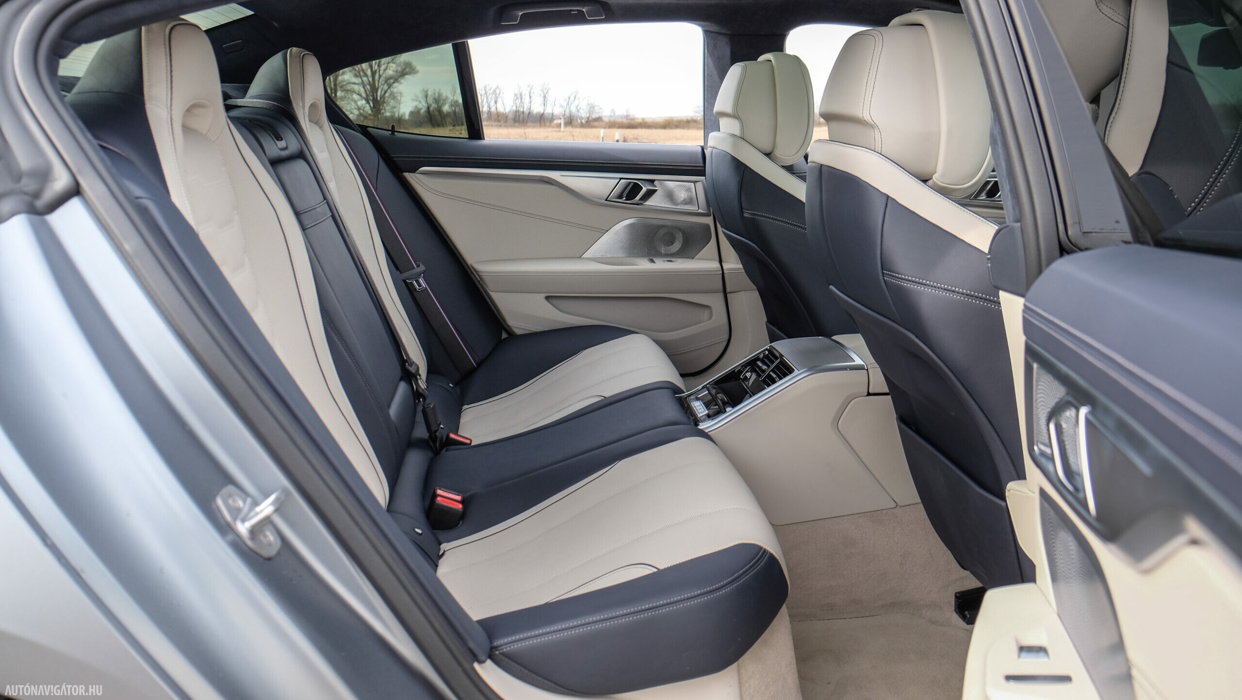 Kiválóan formázottak az ülései, és ezek közelebb állnak a sportoshoz, mintsem az M5-ös fotelei. Érdekesebb viszont a hátsó sor és a helykínálata. Első pillantásra, és amúgy teljesen jogosan gondoljuk azt, hogy a 8-as GC négyüléses, mert hátul is csak két helyet alakítottak ki. De ez csak a látszat, köztük van egy ötödik ülőhely is hivatalosan, ami leginkább a középkonzol megléte miatt érdekes. A klímapanelt magába foglaló középrész mindenképp benne van a 8-asban, ezt a középen ülőnek lábközre kell vennie, már ha tényleg komolyan gondolja a dolgot. A két szélső hely viszont tökéletesen formázott, már látványra sem utolsó az egybeépített fejtámlás felső rész. A lábaknak bőven van hely, ugyanúgy besüllyesztve ülünk, mint elöl, a sportosság a hátsó sorban is tökéletesen érződik. [BANNER type="1"] Anyaghasználata tökéletesen jellemzi a márkát, a minőségi bőrt szépen varrják, bár itt-ott nem feltétlenül egyenesek a varrások. A formavilág megszokott, amit lehet, bőrbe vontak, és ahol elfért, oda hangulatvilágítást építettek, még az ajtózsebekbe is.