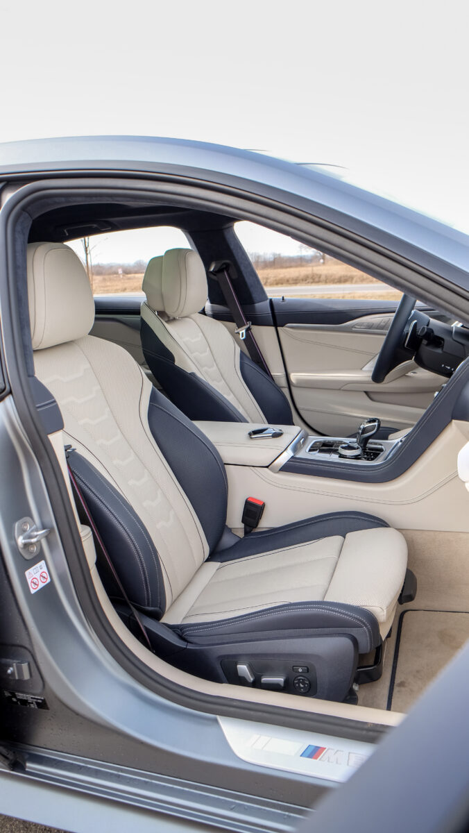 A 8-as sorozatra érdemes másként gondolni, mint az eredeti 8-asra. A márka csúcs kupéját jelöli, de időközben a 6-os eltűnt, ez pedig méretben szinte pontosan annak a helyét tölti be. A kommunikáció és a technikai, mechanikai tartalom magasabb. A BMW luxus szegmensébe sorolták, ahol bátran használnak szénszál erősítésű műanyag elemeket a karosszéria merevítéséhez, Alcantara huzatot a tetőkárpithoz és kristályüveget a váltókapcsolón. A 8-as Gran Coupé a korábbi 6-os Gran Coupé szerepét tölti be, melyre igencsak nagy szükség volt, miután elődjéből is lényegében több fogyott, mint a kétajtósból. A 8-as Gran Coupé belsejét úgy alakították ki, hogy valóban limuzinos legyen, nagyobb benne a hátsó lábtér, mint az 5-ösben, már-már inkább a nyújtott 7-eséhez közelít. Külsőre is szemmel láthatóan hosszabb, mint a kétajtós. Apró érdekesség, hogy az orra, egészen az A-oszlopig, megegyezik a kétajtóssal, és még így is hibátlanul kiadják az arányai. Több mint három méter a tengelytáv, a hátsó ajtók is hosszúak és az ablakaik is végig magasak, vagyis a bejutás egyáltalán nem szűkös. Végigfut egy új él a kilincsek vonalában a hátsó lámpákig, a hátsó szélvédőt pedig szolidan besüllyesztették, így dizájnban is vannak apró új érdekességek. Érdekes a kép, amit mutat, elöl és hátul háromnegyedes nézetből határozottan kupés, teljesen oldalról nézve viszont jelentős, már-már szedános púp látható a hátsó sor feje felett. Elég drasztikus a 8-as dizájnja, a korábbi 6-os Gran Coupét mellé állítva az egészen szolidnak hat, és már a 8-as tetővonalából is látszik, hogy jóval használhatóbb autót takar. A kékes szürke Frozen Bluestone fényezés nagyon szépen emeli ki a vonalait, tökéletesen passzol az M Performance bronzos kiegészítőihez, amiről az M850i-t már messziről is felismerni.
