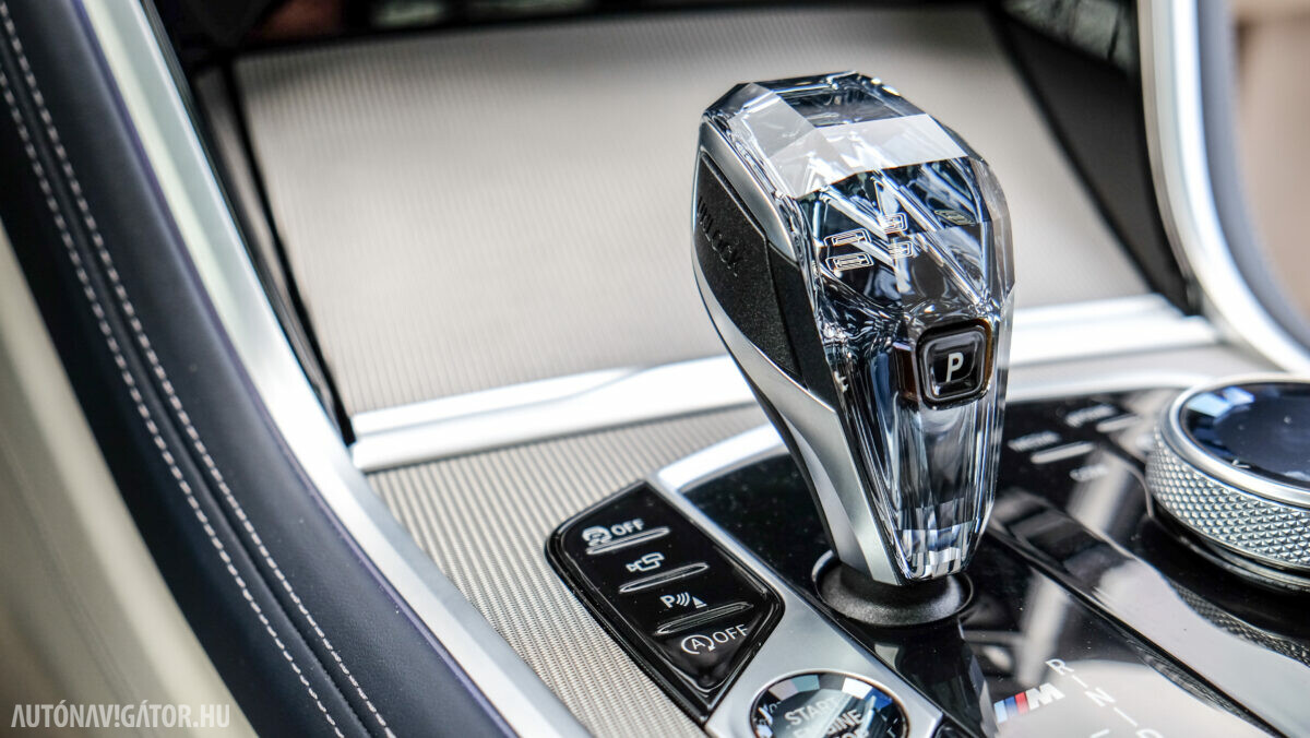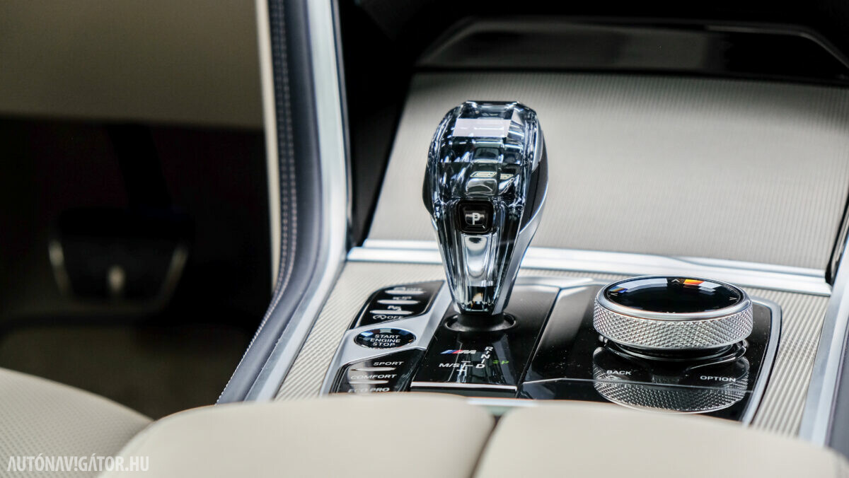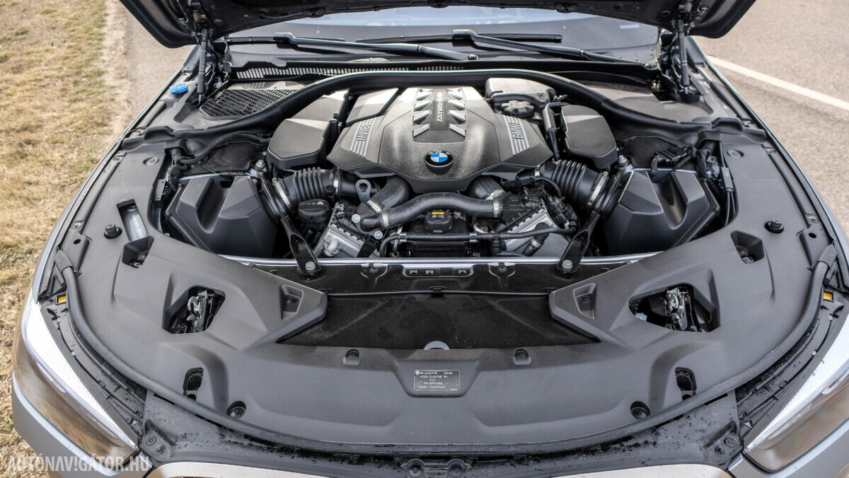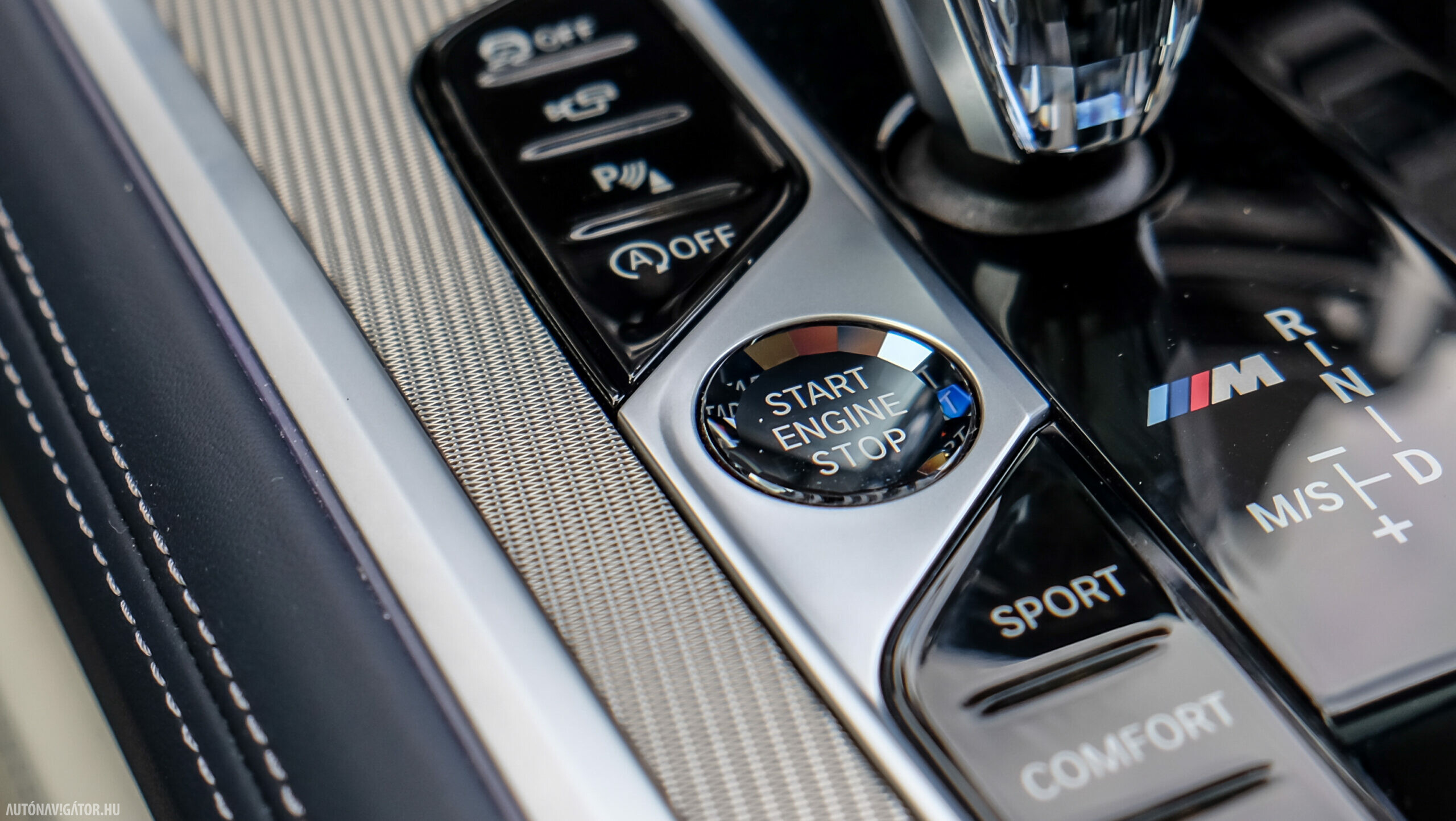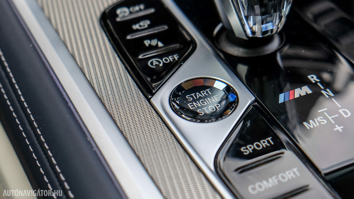 A keret nélküli ablakos ajtókat kis villanymotorok húzzák be, hogy a kényelem maximális lehessen. Először furcsa volt, hogy középre helyezték az indítógombot, de ez a helyzete valahogy elegánsabb mozdulatot kíván a sofőrtől, mint a kormány mögé dugott gomb megnyomása, leállításnál pedig kevesebb mozdulat P-be kapcsolni a váltót és kilőni a motort. A V8-as indítása egyébként nem olyan drámai, mint arra számítanánk, semmiféle színház nincs, nem hörög fel, vagy rázza be a karosszériát, egyszerűen csak beindul és selymesen jár. Hidegen 1000 fölött tartja a fordulatot, és addig kicsit karcos, de amint felépült az olajnyomás, vissza is ejti 800 alá, ahol nem hogy hallani, de érezni sem lehet, annyira selymesen jár. A 4,4 literes V8-as nagyon kulturált motor, Comfort, vagy Eco Pro módban szinte semmi hangja, még fordulaton sem több, mint egy 40i sorhatosának. 3000-es fordulat felett érkezik meg a hangja, onnantól kezd hangosodni, és az M Sport kipufogórendszer is egyre szebb szólamokat ont. Sport módban érdemes várni a valódi hangját, 3-4000 közötti fordulatszámnál visszaejtve a gázt tud durrogni, bár inkább mélyről jövő, hurutos köhögésnek tűnik. Hozzátéve az élményt, hogy ha mellette állunk, a mellkasunkban érezzük a dübörgését. Akkor értjük meg, hogy ez valójában pozitív, olyan hangerővel csinálja, hogy érezzük is, nem csak halljuk.