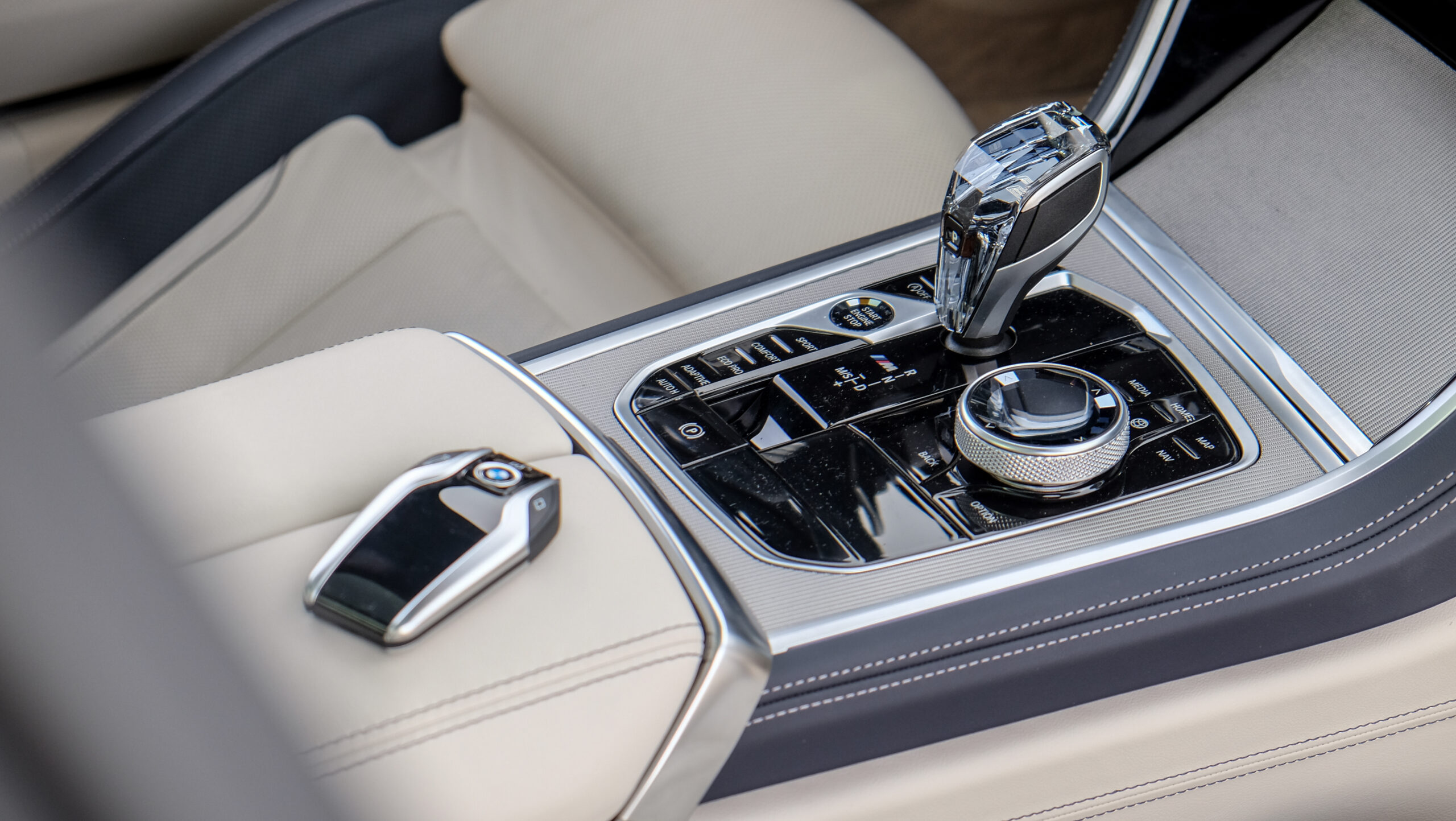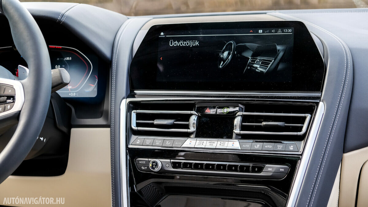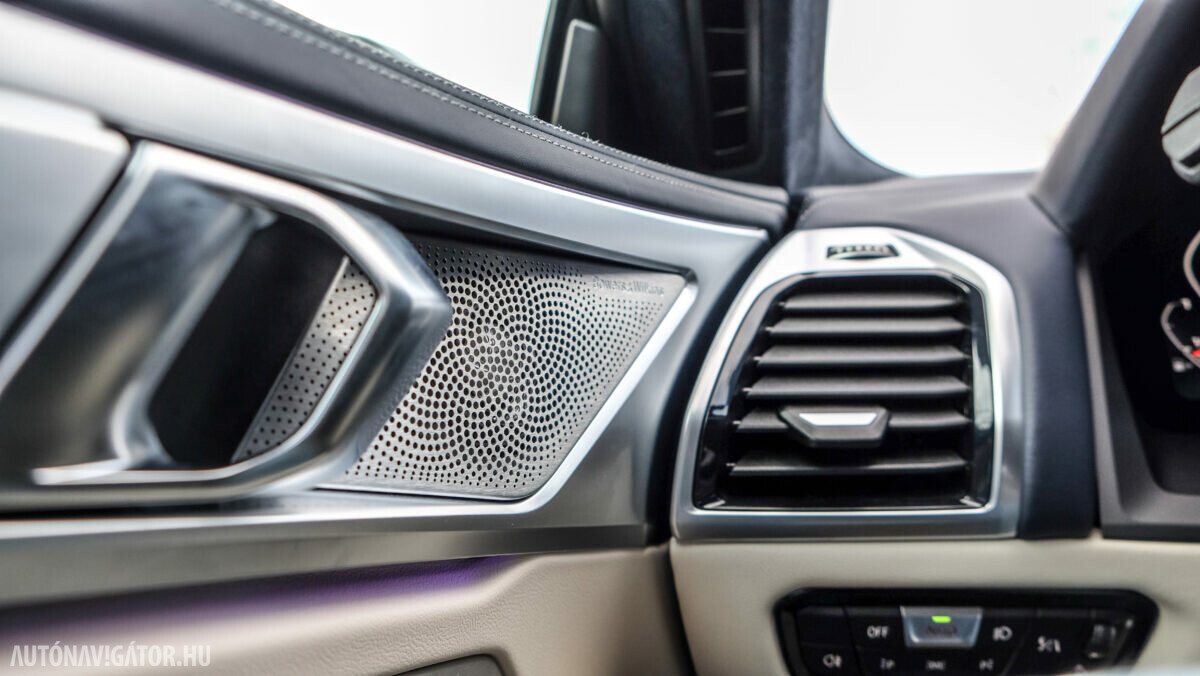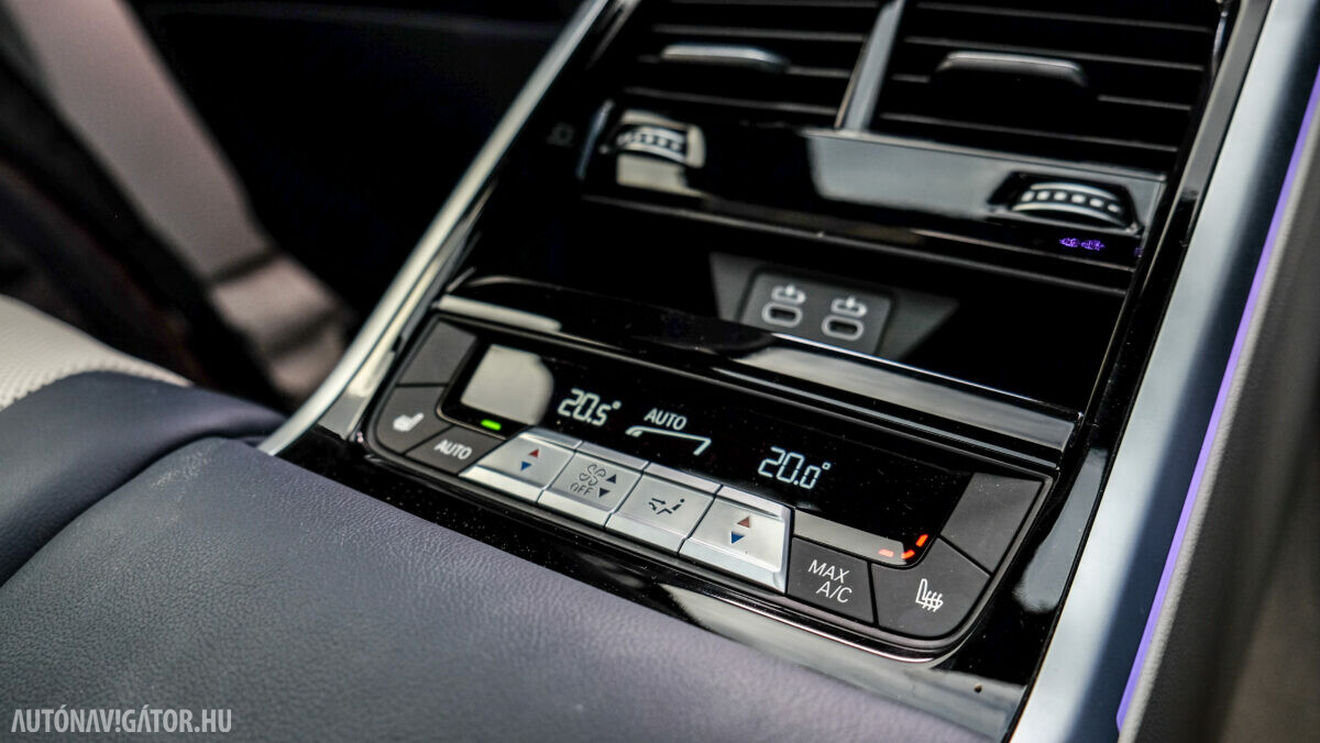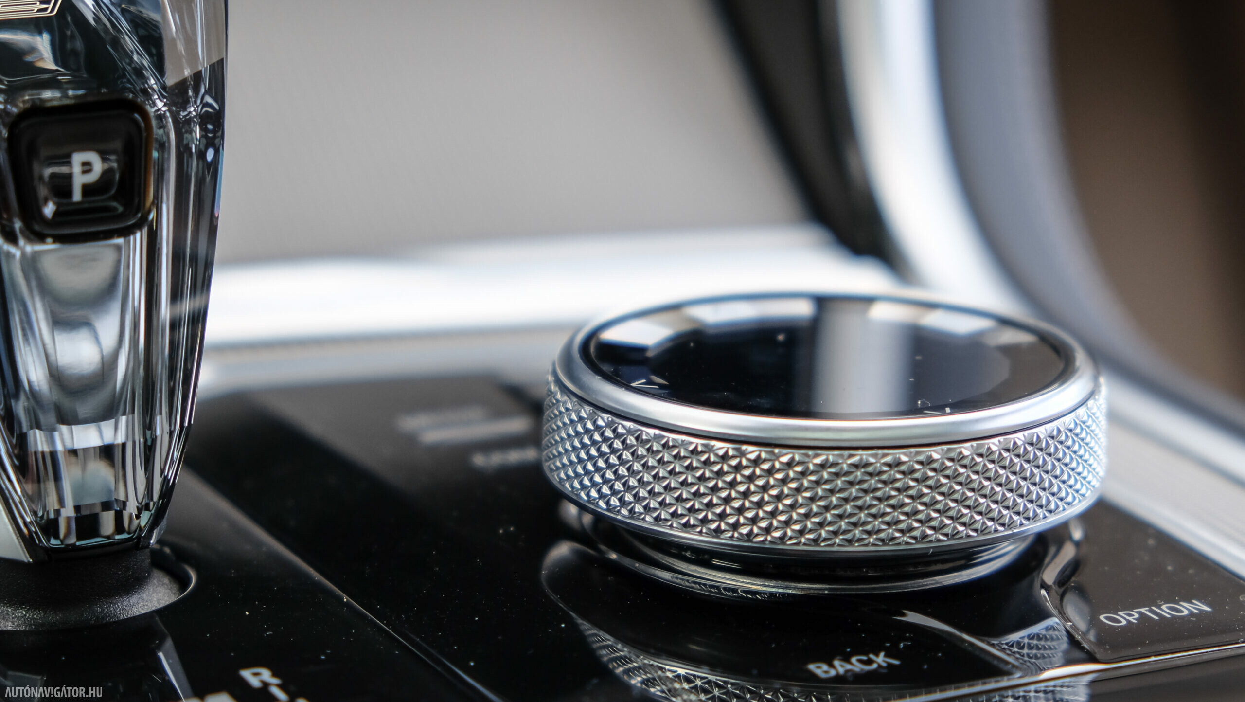 A keret nélküli ablakos ajtókat kis villanymotorok húzzák be, hogy a kényelem maximális lehessen. Először furcsa volt, hogy középre helyezték az indítógombot, de ez a helyzete valahogy elegánsabb mozdulatot kíván a sofőrtől, mint a kormány mögé dugott gomb megnyomása, leállításnál pedig kevesebb mozdulat P-be kapcsolni a váltót és kilőni a motort. A V8-as indítása egyébként nem olyan drámai, mint arra számítanánk, semmiféle színház nincs, nem hörög fel, vagy rázza be a karosszériát, egyszerűen csak beindul és selymesen jár. Hidegen 1000 fölött tartja a fordulatot, és addig kicsit karcos, de amint felépült az olajnyomás, vissza is ejti 800 alá, ahol nem hogy hallani, de érezni sem lehet, annyira selymesen jár. A 4,4 literes V8-as nagyon kulturált motor, Comfort, vagy Eco Pro módban szinte semmi hangja, még fordulaton sem több, mint egy 40i sorhatosának. 3000-es fordulat felett érkezik meg a hangja, onnantól kezd hangosodni, és az M Sport kipufogórendszer is egyre szebb szólamokat ont. Sport módban érdemes várni a valódi hangját, 3-4000 közötti fordulatszámnál visszaejtve a gázt tud durrogni, bár inkább mélyről jövő, hurutos köhögésnek tűnik. Hozzátéve az élményt, hogy ha mellette állunk, a mellkasunkban érezzük a dübörgését. Akkor értjük meg, hogy ez valójában pozitív, olyan hangerővel csinálja, hogy érezzük is, nem csak halljuk.