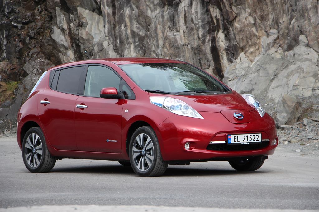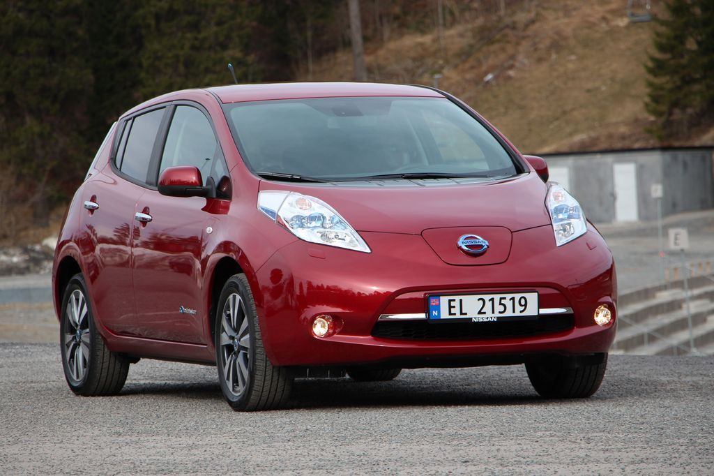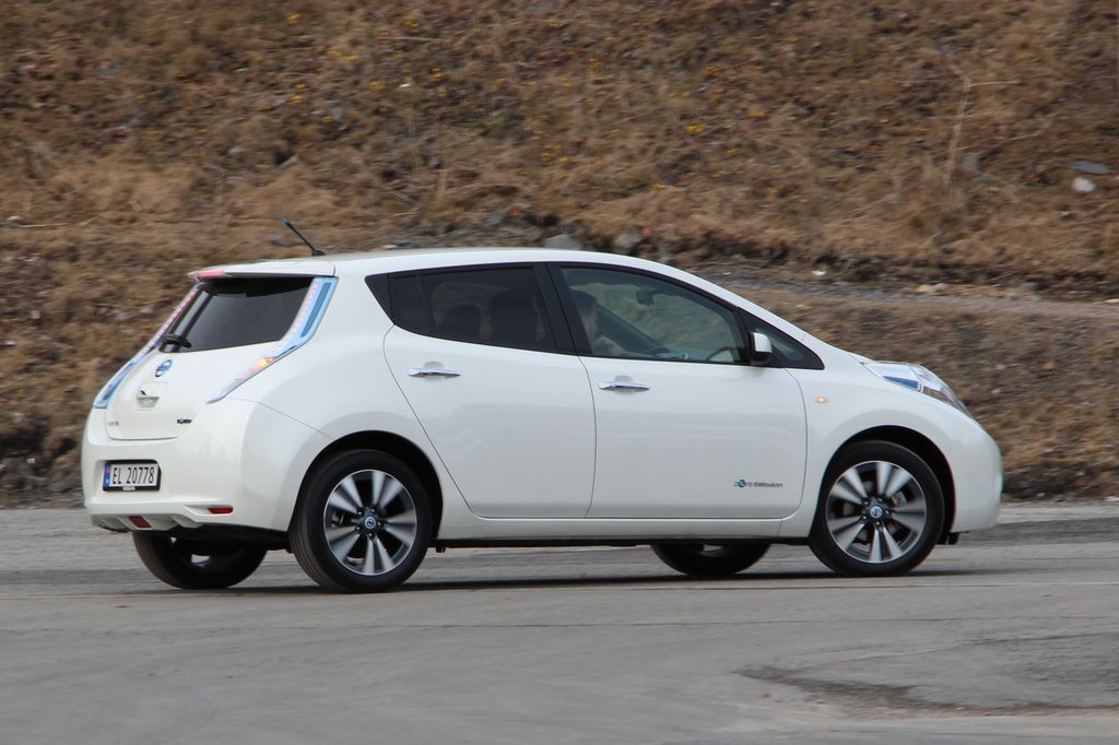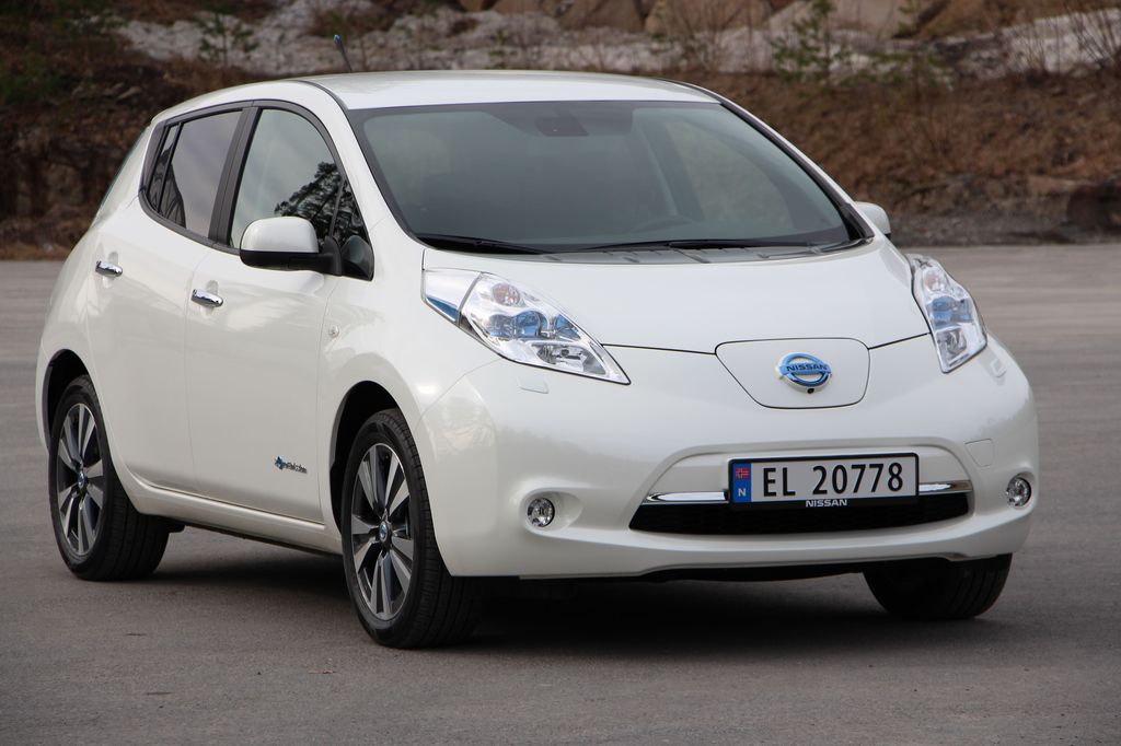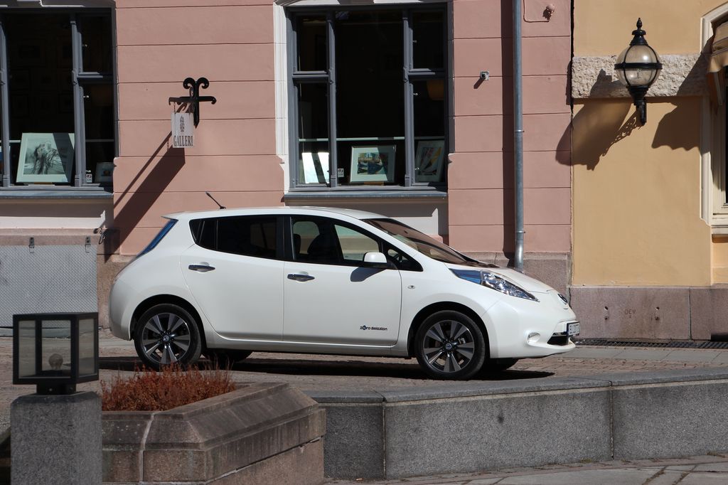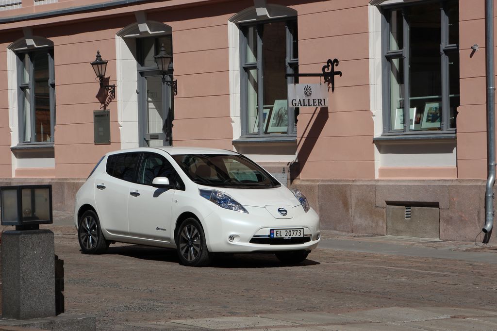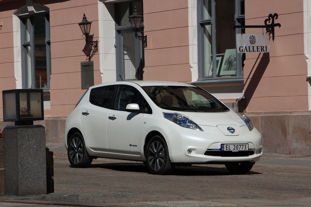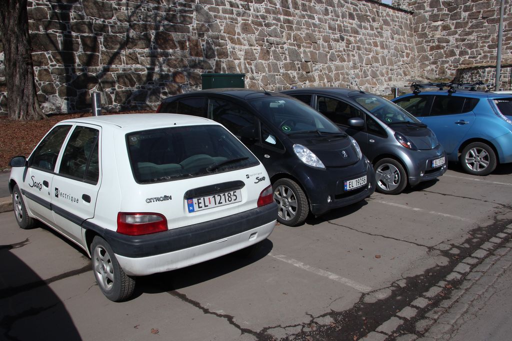 Villanyautó-parkoló Norvégiában: jól láthatóan a piac kedvence a Nissan Leaf, de van néhány régebbi PSA és Mitsubishi által gyártott elektromos miniautó is