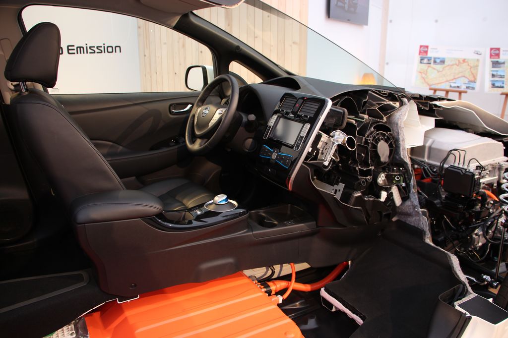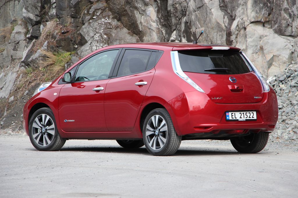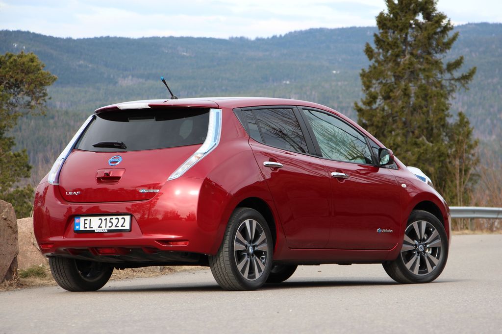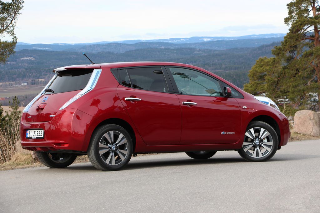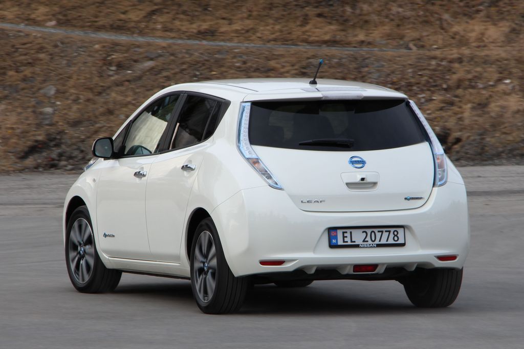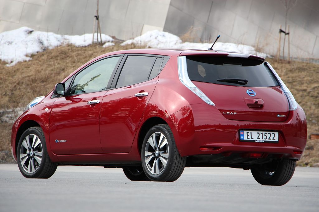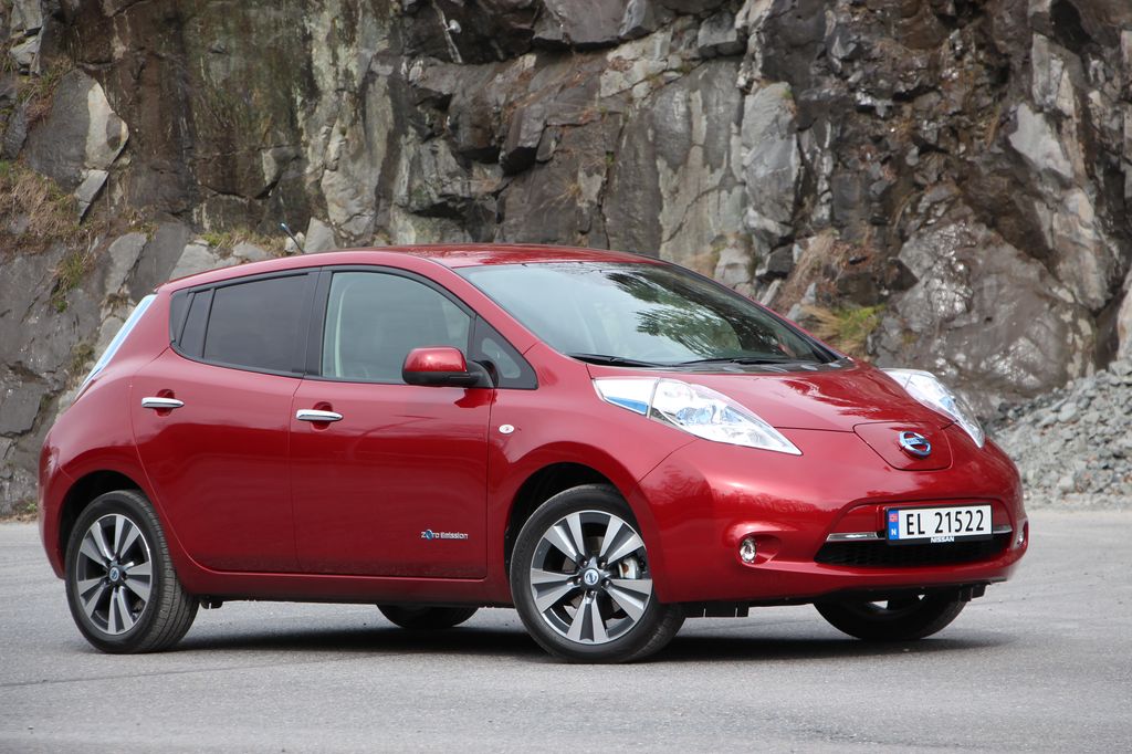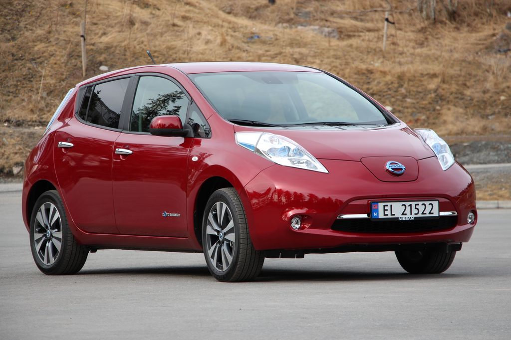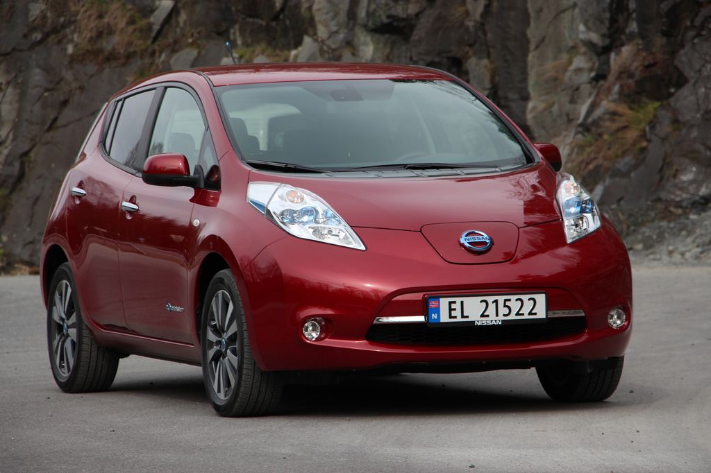 Villanyautó-parkoló Norvégiában: jól láthatóan a piac kedvence a Nissan Leaf, de van néhány régebbi PSA és Mitsubishi által gyártott elektromos miniautó is