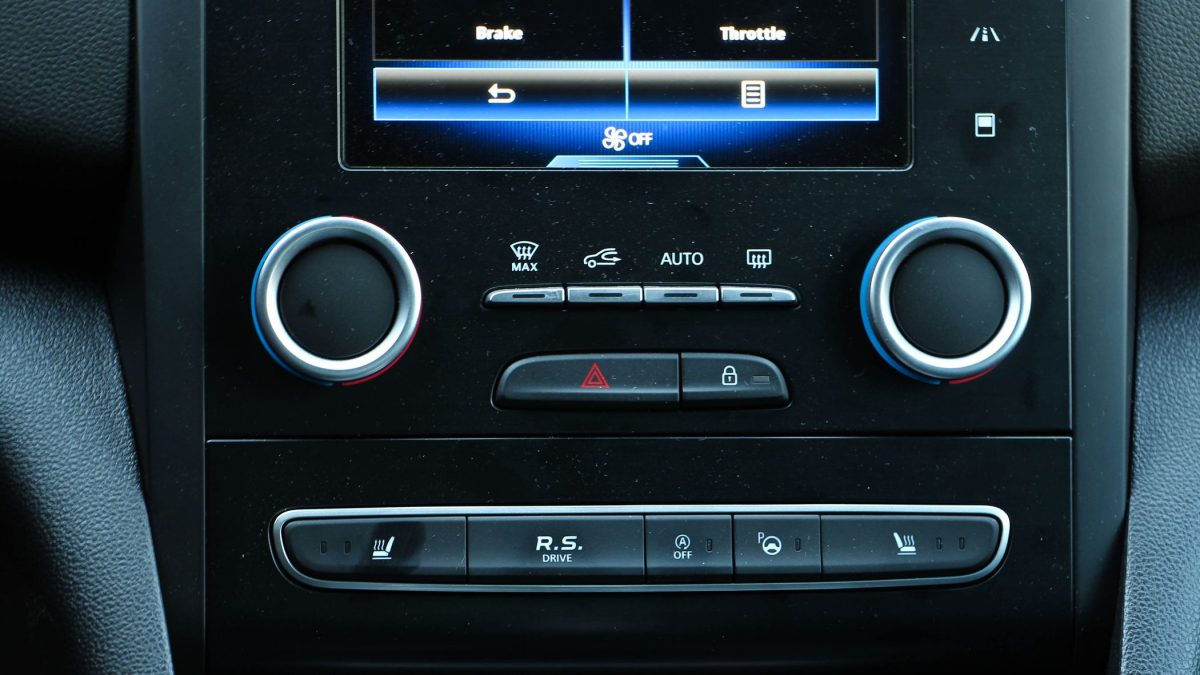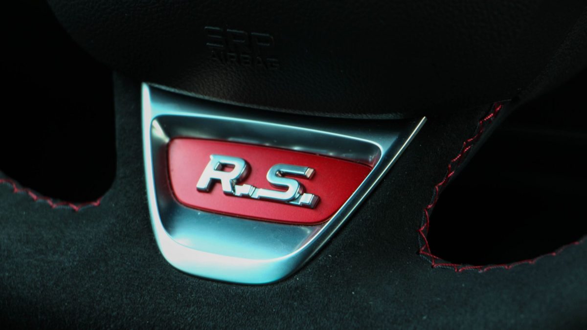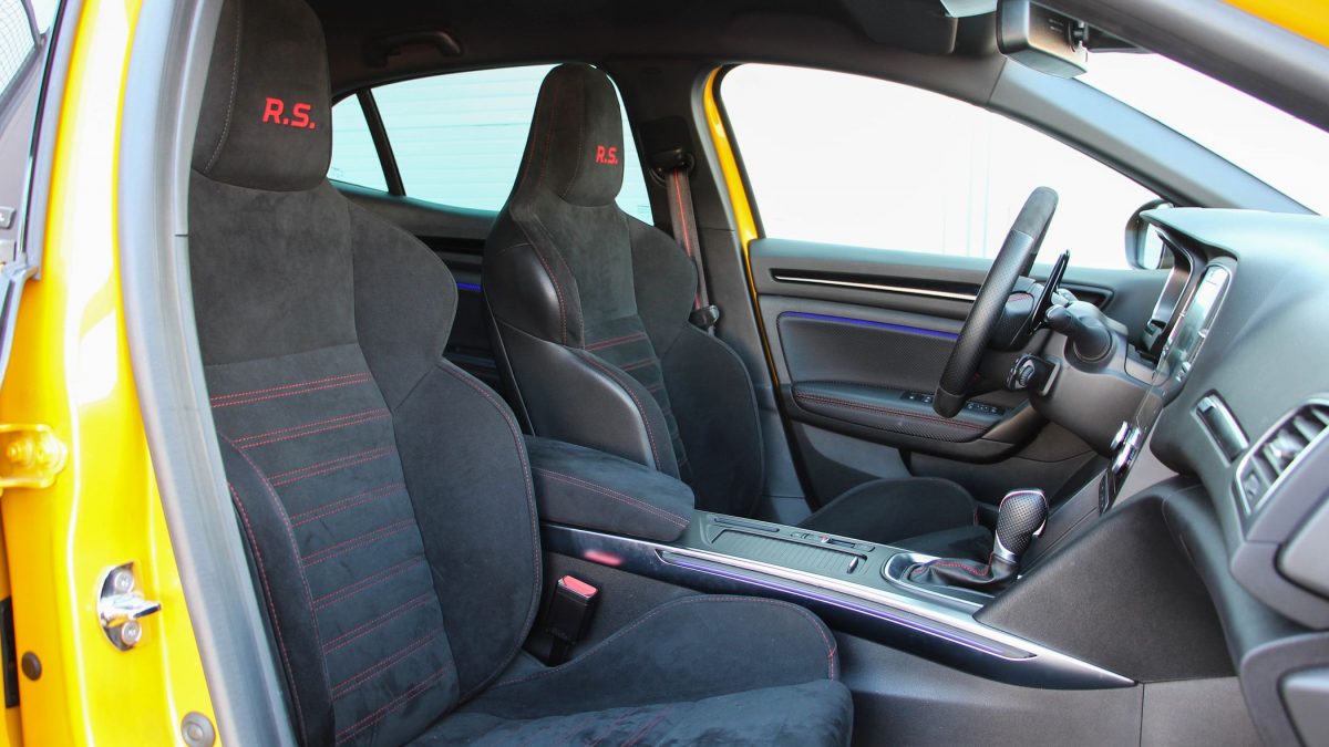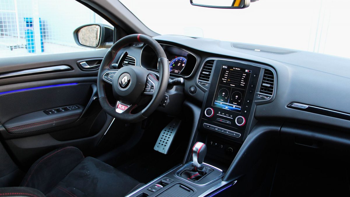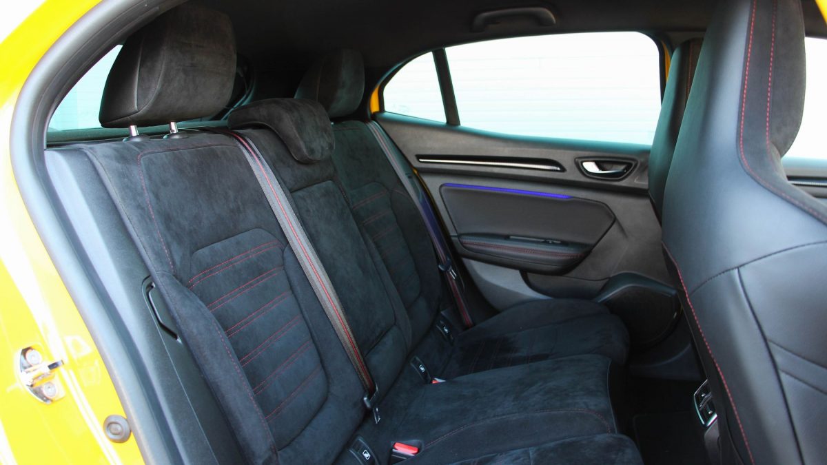 Az utastérben is megfelelő egyensúly uralkodik, nem estek túlzásba. Vörös cérnával varrt bőrfelületek, szénszálas műanyagot imitáló díszbetétek és Alcantara. Utóbbiból a kormánykerékre is jutott, amelynek küllőjén vérpezsdítő R.S. felirat növeli a sportos hangulatot. Az ülésekről pedig legszívesebben ódákat zengenék, bár ezek az Alcantara borítású példányok is 300 000 forint felárat jelentenek. Kiválóan tartanak a kagylósított példányok, amire szükség is van kanyarvadászat közben. Még hátul is mélyítettek az ülések, így az utasok sem „esnek ki” belőlük. Bizony, az öt ajtajával a Megane R.S. akár teljes értékű családi autóként is szolgálhat.