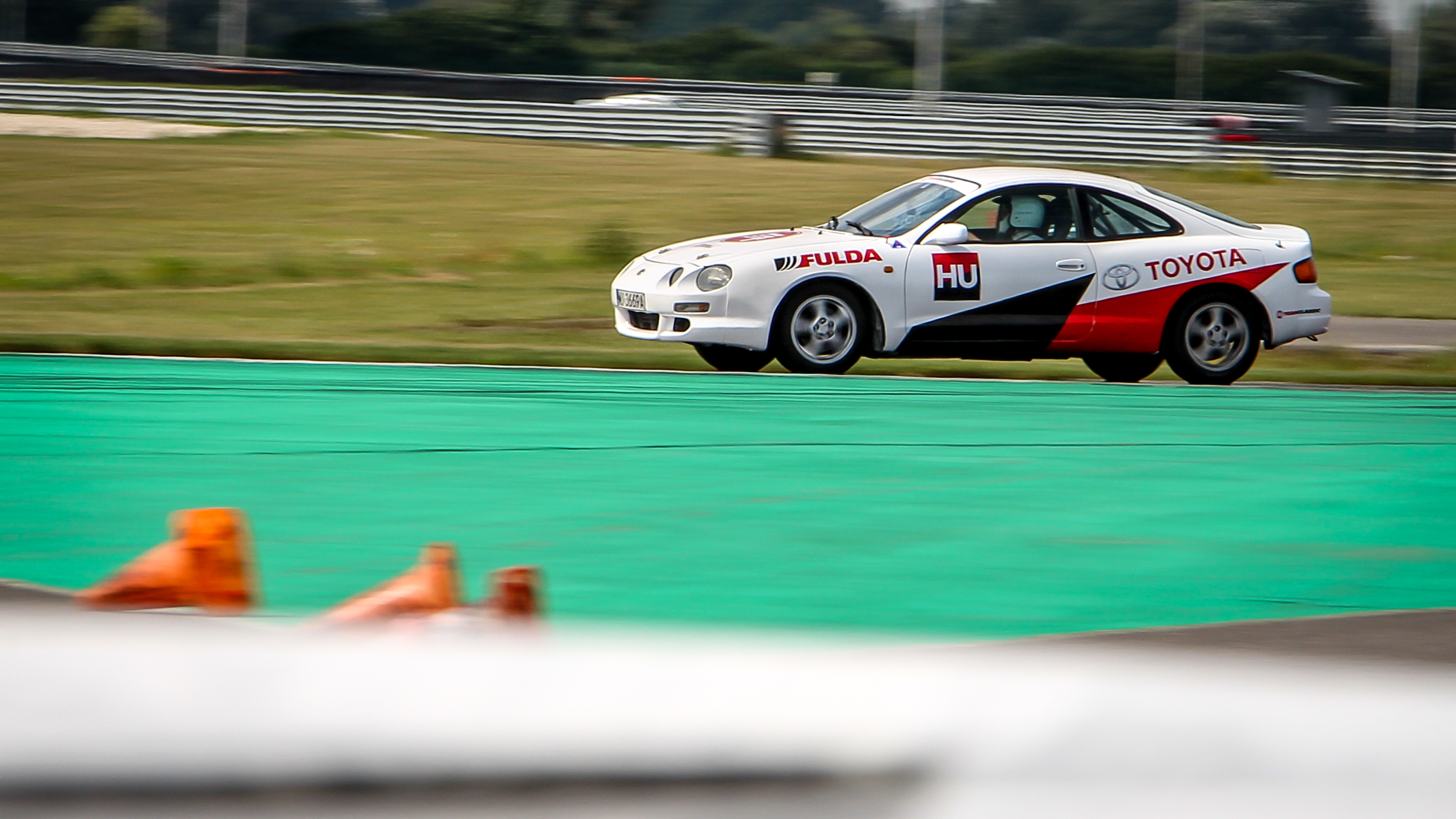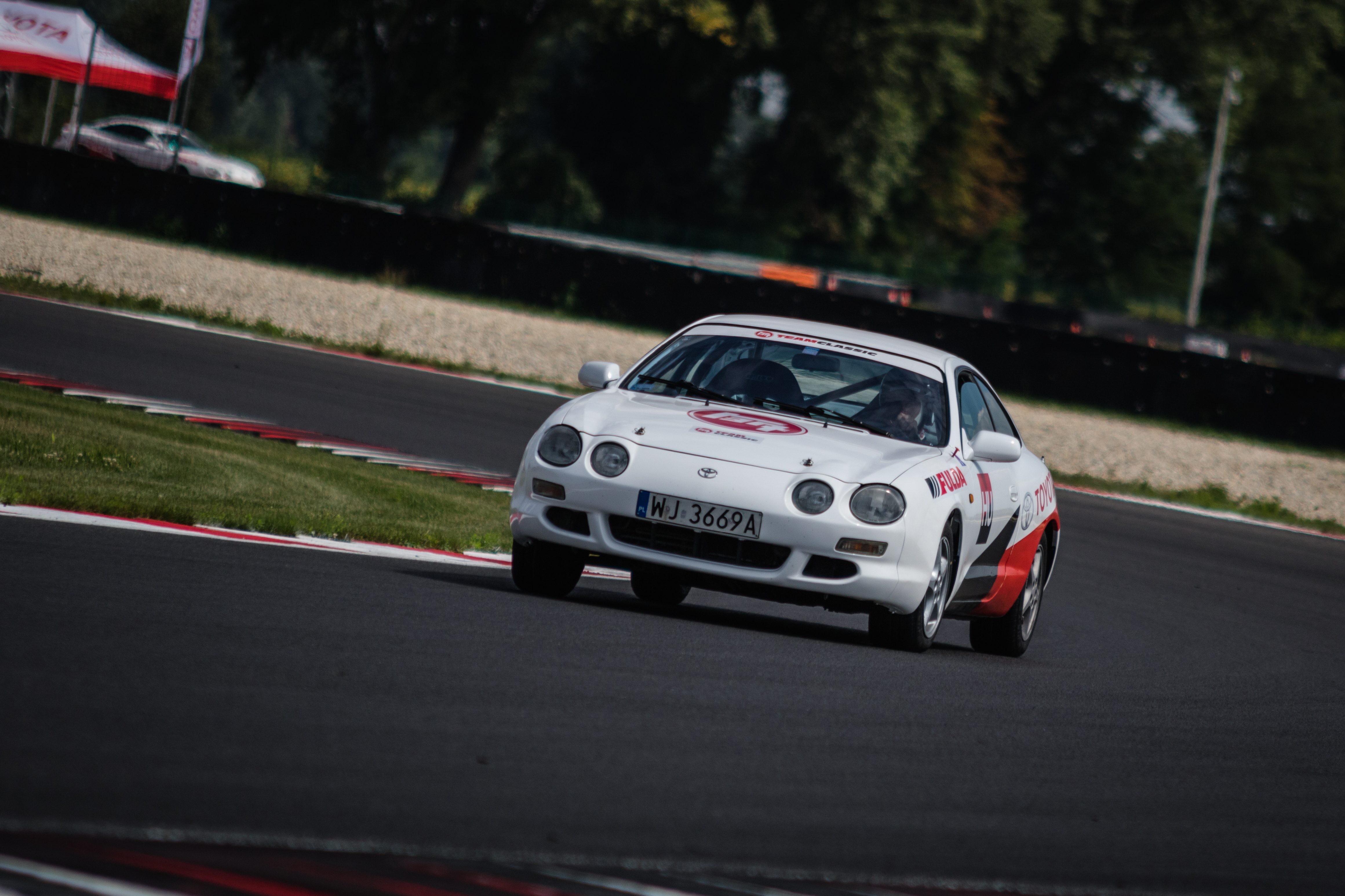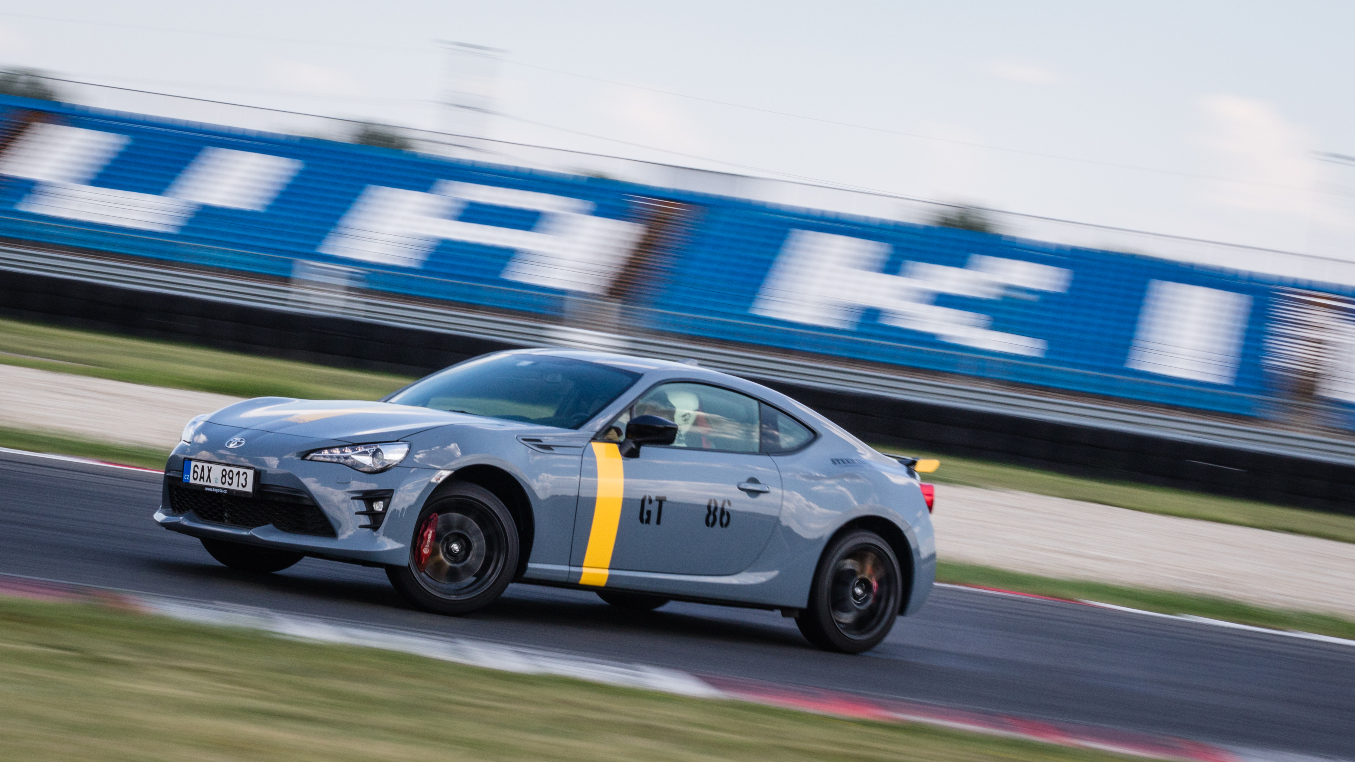 A GRMN sorozat mellett két GT86-ot is hoztak, valamint a Toyota Team Classic jóvoltából egy marék Celicát is. A Slovakiaringet kétfelé osztották, a Yarisszal és a Celicával egy időben folyt az edzés, a kvalifikáció és a verseny, így teljes kört egyik autóval sem mentünk. A Yaris útvonala volt a célegyenes, az első jobb kanyar, ami már teljesen visszafordított, ahol egy jobb-bal sikán után érkeztünk meg az egyenes szakaszt érintő emelkedőre, majd annak végén fordultunk vissza a célegyenesre. A Yaris épphogy kanyarban ügyes, mégis a gyors pályát kapta, vélhetően azért, hogy a gumikból kevesebb fogyjon, ám a hosszú egyenes szakaszok csak arra voltak jók, hogy a gyorsulást kipróbáljuk. 200 km/h-s tempót értünk el a célegyenes végén, a féket teljes erőből kellett taposnom a kellő lassulás érdekében, ám az már elsőre is feltűnt, hogy ilyenkor nagyon elkönnyül a feneke és elkezd táncolni. Kézben tartható, nem tűnt veszélyesnek, kanyarban pedig elég jól támaszt, a szlovák kollégának mégis sikerült bevágnia a kavicságyba a kisautót, épp előttem, aminek egy alaposan kavicsvert baloldalú Yaris lett a végeredménye.Akármennyire is volt rossz állapotban már, ez a tekintet akkor is jobban vonz, mint a Yaris