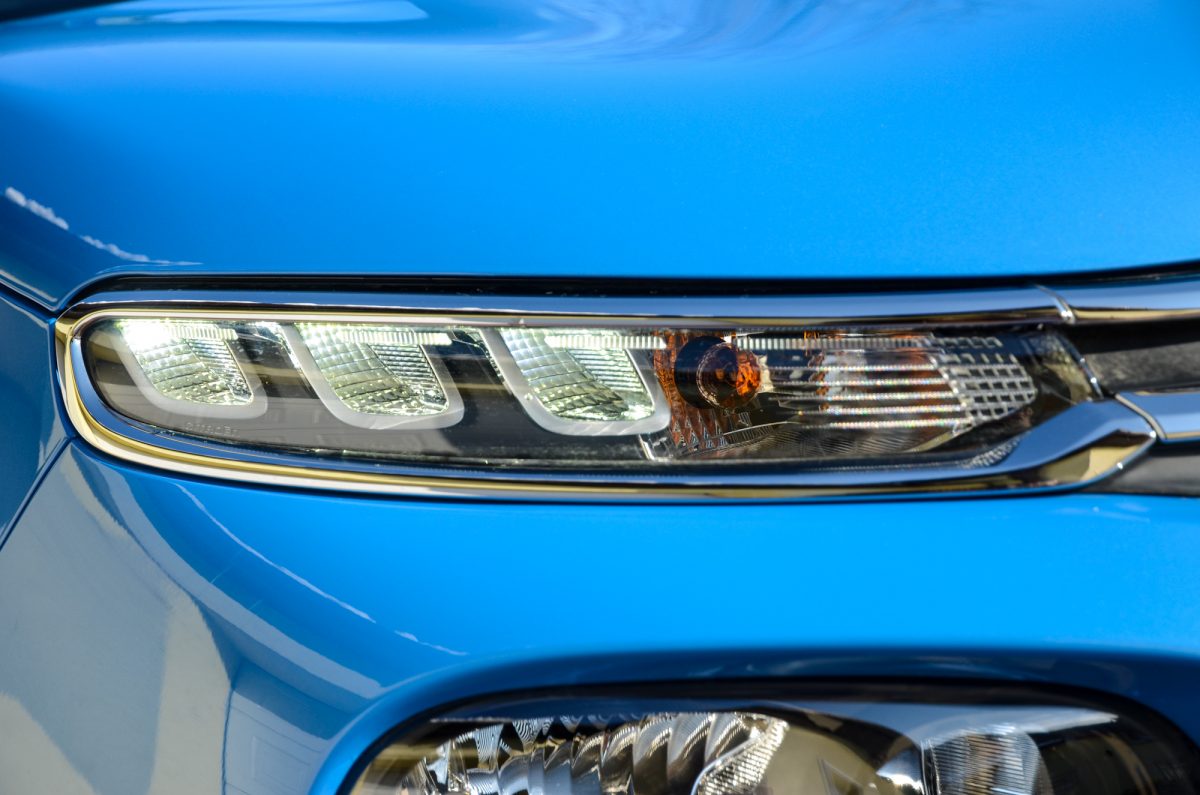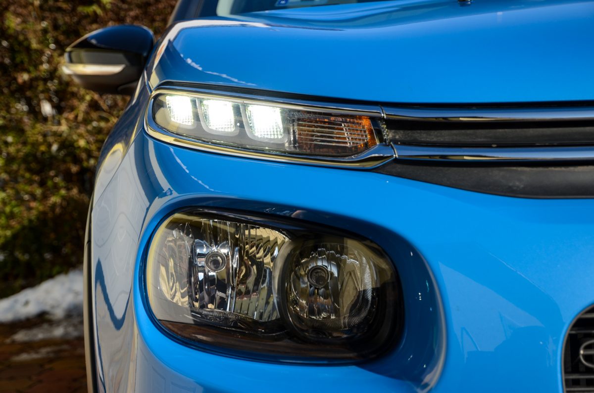 Franciásan formás. Nem csoda, hogy felkapja rá a fejét az ember vagy megfordul utána, a franciák valóban kitettek a dizájnért. Az oldalt végigfutó méretes Airbump elemet egy az egyben a Cactustól örökölte, látvány szempontjából a mai napig nem sikerült vele megbarátkoznom, azt gondolom nem vagyok ezzel egyedül. Számomra állandóan azt a hatást kelti, mintha vastagon ki lenne glettelve az oldala. Persze simán lehet, hogy másnak ez a részlet is bejön. Ha végképp nem tetszik, akkor nem kell aggódni, lehet amúgy nélküle is kérni a C3-at. Mutatós a forma, főleg a kétszínű felnivel és a fényezéstől eltérő tetővel. Az orrán lévő LED-es lámpatest csak nappali menetfényként szolgál, a tompított és távolsági az alatta található méretes burák mögül szórja a fényt.