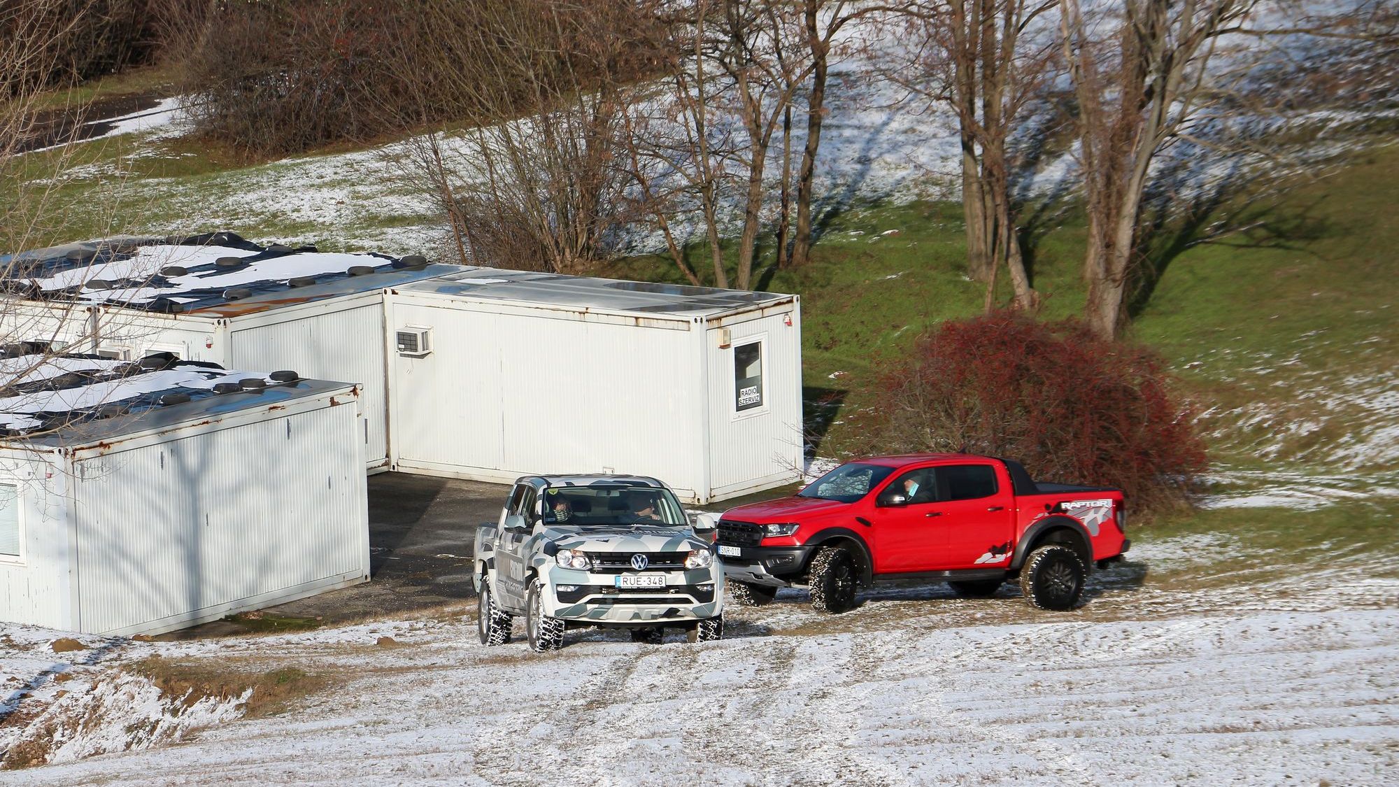 A meccset nagyon hamar eldöntötte, hogy a díjra nevezett Ranger Thunder helyett érkezett Ranger Raptor alapáron kap hóban is elég ügyes A/T abroncsokat, míg a Navara és a Hilux még csak rendes téli gumiabroncsot sem viselt, négyévszakosokon gördült. Igaz terepen az Off-road Centrum pályához dedikált és annak megfelelően M/T abroncsos Amarokja mindegyiküknél látványosan ügyesebben mozgott. A Ranger Raptor nem csak a hozzá alapáras, méretben is bajnok, 285/70 R17-es BF-Goodrich A/T gumijaival, hanem méreteivel és terepszögeivel is bajnok, igaz, a hátsóval csak addig, amíg nem kap vonóhorgot. A tesztautón volt, így egy-egy buckára felmászáskor, leereszkedéskor ekeként szántott azzal. A Raptor széles abroncsaihoz széles sárvédők is járnak, több mint 2 méter széles, s hosszúságával és magasságával is bajnok. Ez nem feltétlenül előny, ugyanis az 1,85 méteren is túlnyúlva már egy-egy mélygarázsból is kiszorulhat, míg a Hilux még az 1,8 méteres belmagasságúakba is belefér. A méretbajnok Raptor platójának hosszúságával is nyer, szélességével azonban a Hilux ad a legtöbbet.