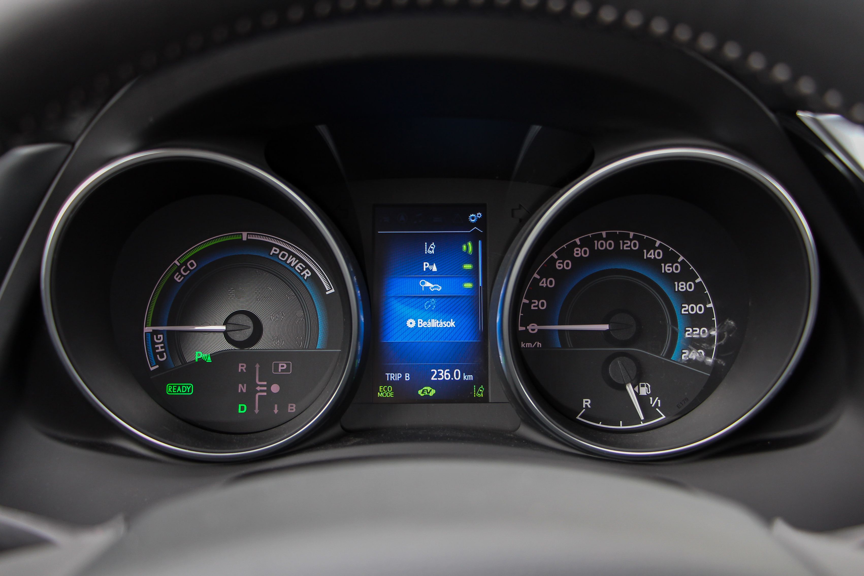 Villanyüzem és erődemonstráció. Megfelelő akkutöltés és üzemmeleg motor esetén az EV-gomb megnyomására rövid távon kaphatunk emissziómentes üzemet, ám meglepő módon többször kaptam az "EV mód nem lehetséges" visszautasítást visszajelzést az új Auristól, mint saját tízéves Priusomtól. Itt viszont van Power Mode is az Eco mellett, amivel aztán extra gyorsítást kapunk. Van továbbá energiamérő is, ami a már megszokott, persze friss dizájnú, a középkonzoli mellett már a műszerblokkban is színes kijelzőn megjelenő energiaábrák mellett perifériából is jól láthatóan mutatja, hogy éppen töltjük-e az akkut, netán óvatosan, vagy erőteljesen szipkázzuk-e ki belőle a töltést. Utóbbi esetén a mutató immár narancssárgán világít és tart távol a gázpedál erőteljes taposásától. Amennyiben mégsem elég hatásosan, akkor 11,2 másodperc alatt 100 km/órára érhetünk, a végsebesség 175 km/óra lehet. Fontosabb, hogy az autópályás utazótempó - sík úton - motorzajmentes. Emelkedőn van egy kis hangja az Euro 6-os 1.8-asnak, de ott sem vészes, jól szigetelt, persze a legkevésbé sem vérpezsdítő.