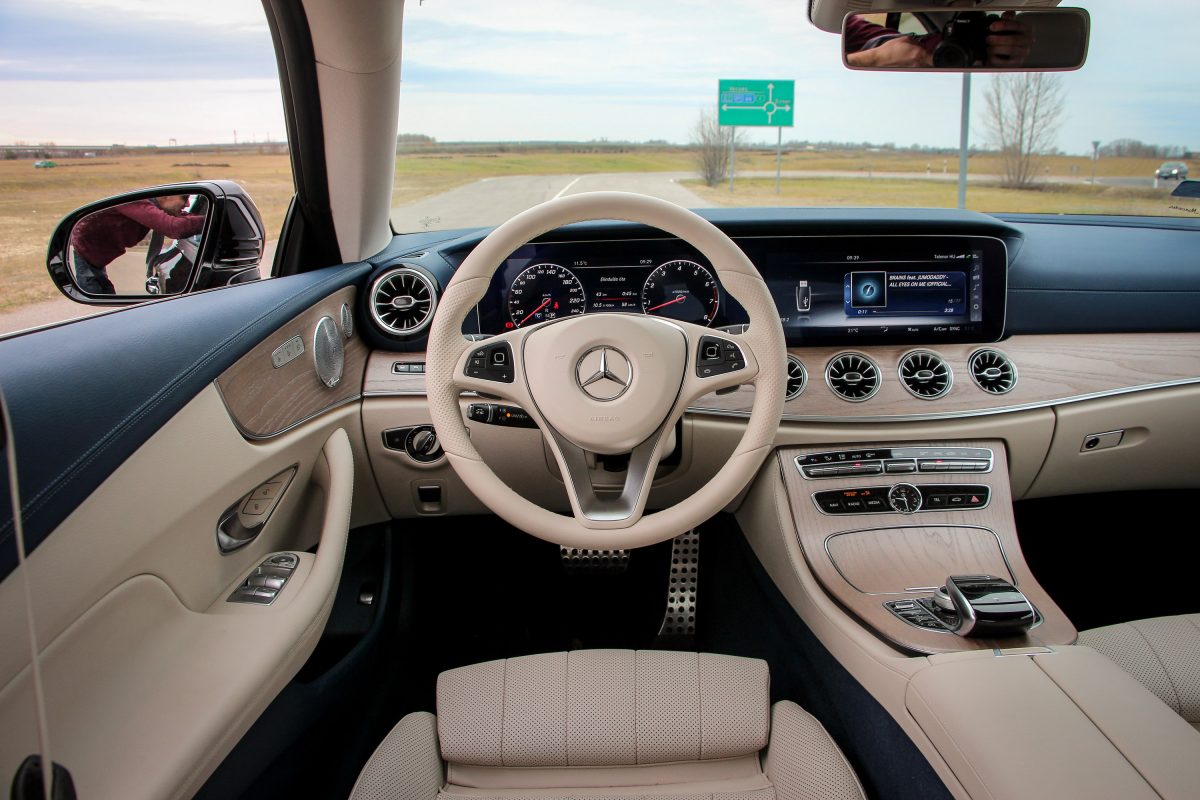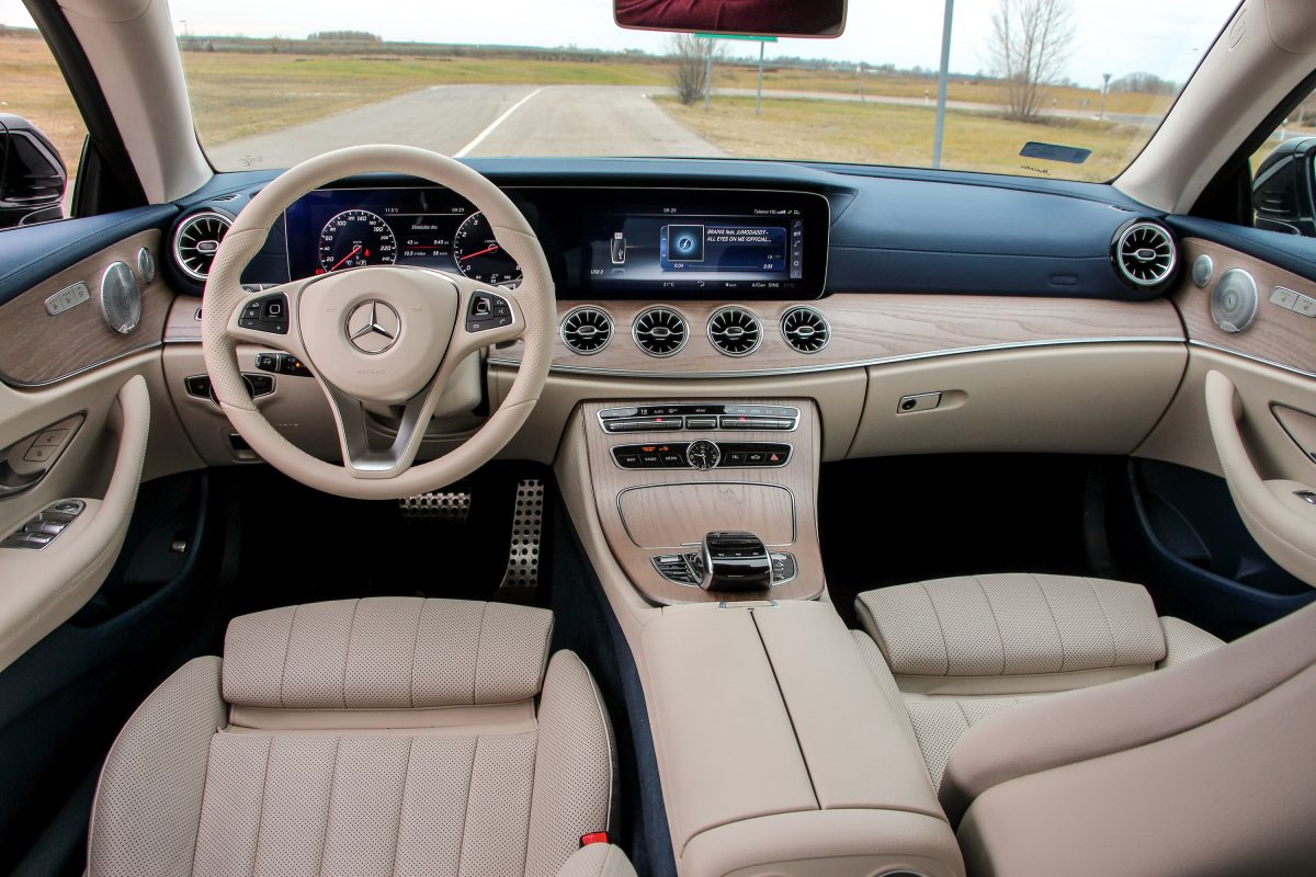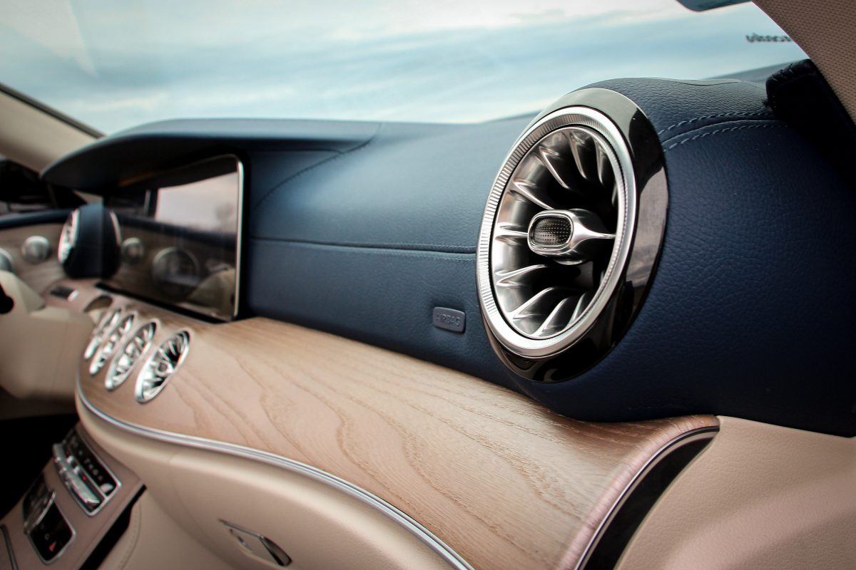 Az E-osztály műszerfala a kupéban csak a szellőzök miatt más, ebben az összeállításban pedig izgalmas, kicsit extravagáns, de mindenképp látványos és így adja ki igazán a formákat