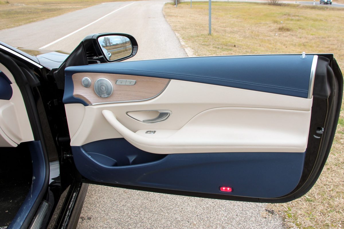 Bent sem unalmasabb a formaterv, sőt, ez az igazán szép része az E kupénak. Hiszen itt vannak a rendkívül szépen megtervezett és kivitelezett, gázturbinákat idéző levegőbeömlők. Rengeteget foglalkoztak csak ezekkel külön, és itt mutatkozott be először a megoldás, egyetlen darabból vannak. De ne hagyjuk, hogy ezek túlságosan lefoglaljanak, hiszen végre rendes, látványos színvariációban láthatjuk ezeket a csodás formákat. Furcsa lehet a kék bőr, de nagyon jól harmonizál a világos ülésekkel és a nyers hatású, valójában piszkosul vékony festékréteggel bevont fabetétekkel. Az ülések varrása külön tanulmány, elöl és hátul is hosszanti vonalak futnak végig rajtuk, semmi bonyolítás, egyszerűen szép. Az anyagok persze rendben vannak, már ami bőr. Tényleg csak apróságokba lehet belekötni, amilyen például a kormány mögött, a műszeregység alatt látható fekete műanyag, ami egyrészt nem ér össze, másrészt valahogy el van rajta csúszva az élfestés. Olyan probléma ez, amit nem gondoltam volna, hogy egy Mercedes gyártása során előfordulhat.