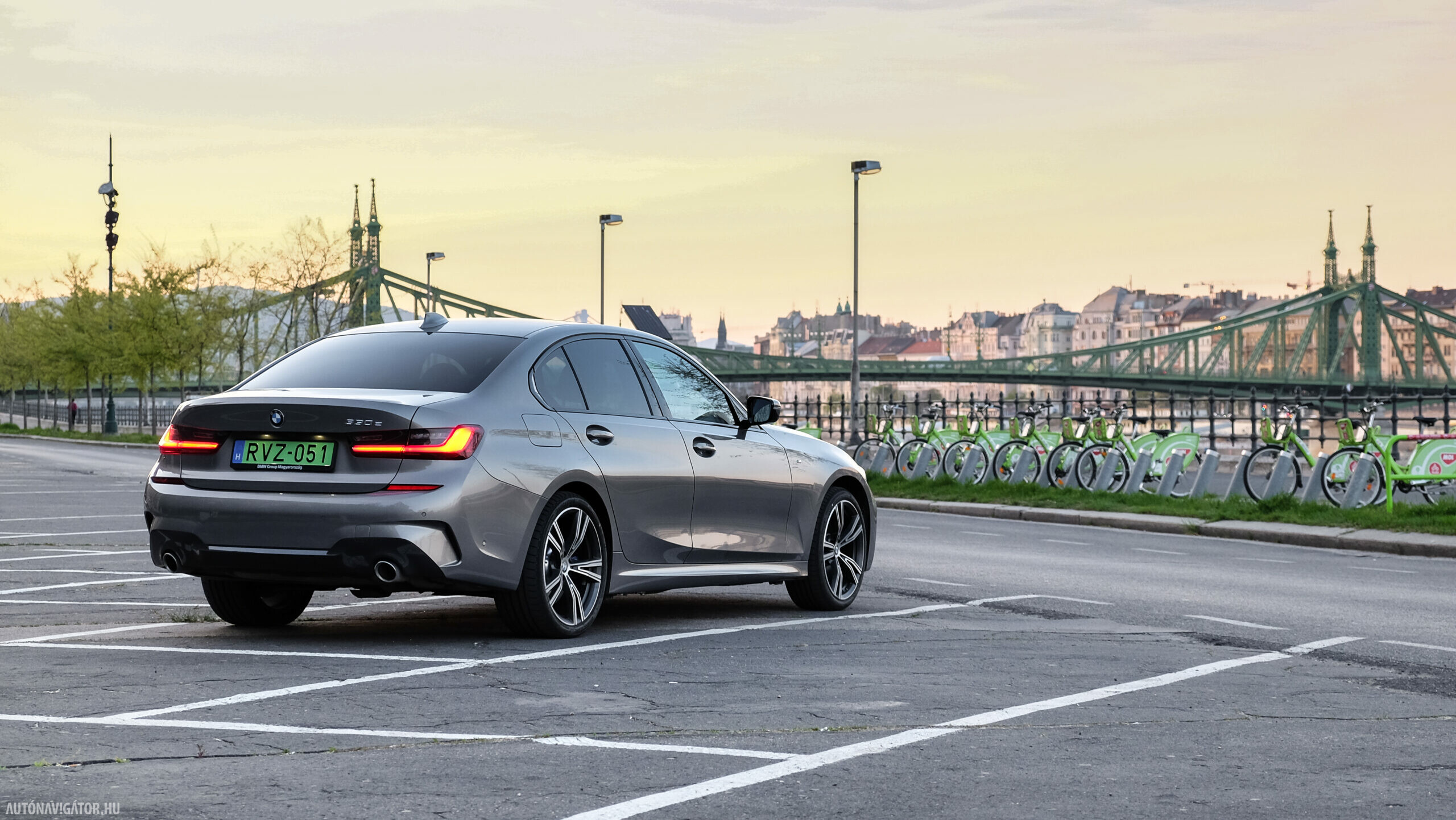 A plug-in hibrideknél általánosan elmondható, hogy nem nagyon mutatnak különbséget kívülről. Ha nem lenne a zöld rendszám, elsőre meg sem mondanánk, hogy ezt nem csak a benzinkúton tölthetnéd fel. A hátsó 330e felirat mellett csak a bal első sárvédőn lévő kis ajtó árulja el, fölötte az M jelzés legalább annyira megmosolyogtató, mint egy 18d-n, de itt kicsit több értelmet nyer a technika miatt. Az M Sport külső elemeket megint nagyon jól eltalálták, a sportos lökhárítók optikailag kiszélesítik a 3-ast, a 19 colos felnik viszont már az Individual választékból származnak. Ezerszer vizsgáltuk már az új hármast, de nem tudok elmenni amellett, hogy meg ne említsem az arányait, hogy az orra hosszú, az első túlnyúlás rövid, a kabin egészen hátratolt, a szedán fenékkialakítása pedig nagyon karakteres és egyben csinos.