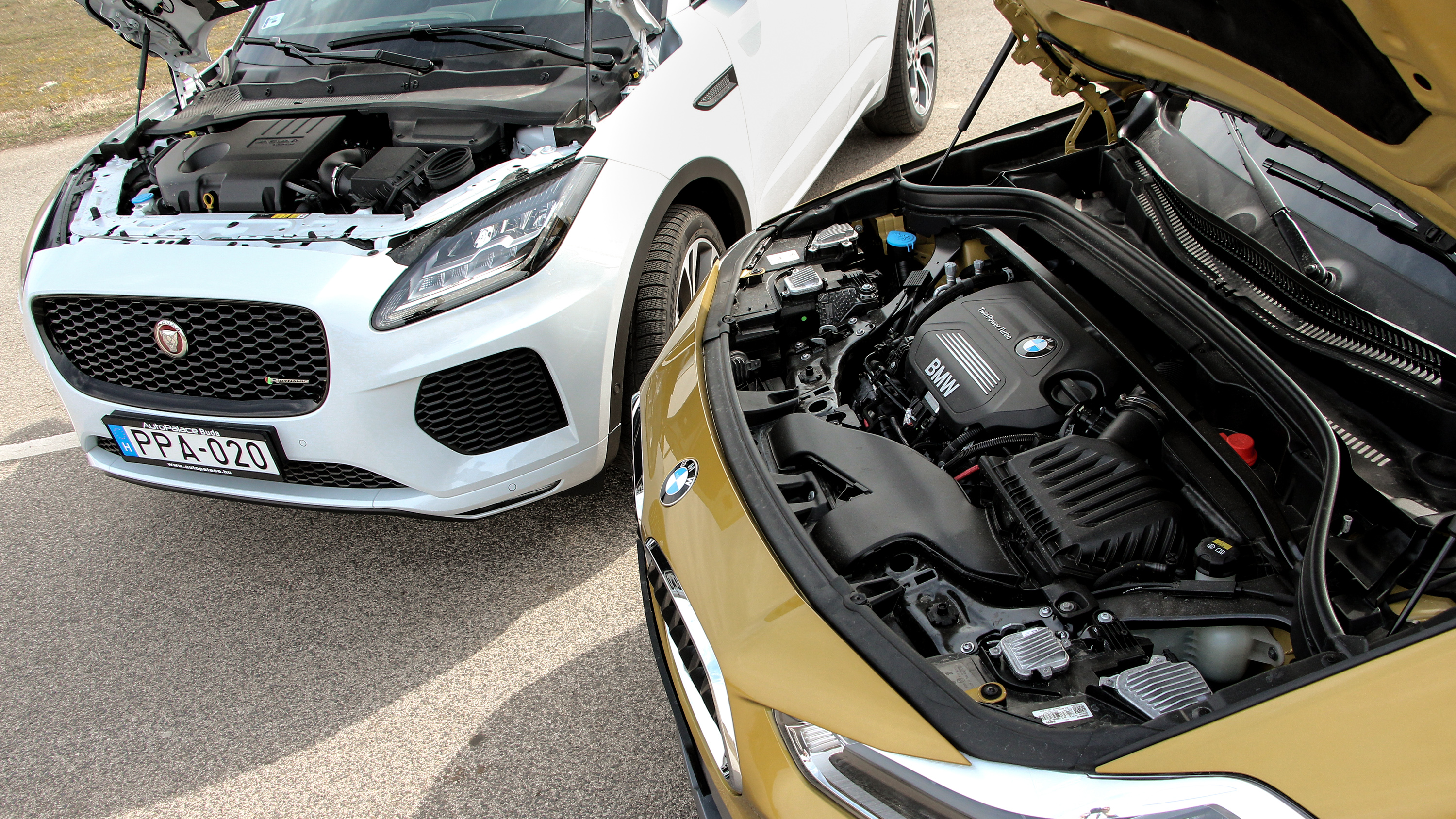 Nem teljesen fair a verseny, ugyan mindkettő kétliteres dízel, összkerékhajtással, automata váltóval, az X2 egy 25d, azaz duplaturbós gázolajos, 231 lóerővel. A Jaguar a gyengébbik dízellel érkezett, 180 lóerejével inkább a BMW 20d-jéhez van közel, ám náluk is kapni 240 lóerős gázolajost, így a 25d-nek is épp találni konkurenst. Bár lóerőben erősen eltérnek, nyomatékuk között 20 Nm csupán a különbség, ám a jelentős súlytöbblet miatt a Jaguarnak papíron közel három másodperccel több időre van szüksége a 0-100-as sprinthez. Mint ismerjük, az erősebbik dízel sem túl virgonc a Jaguarokban, ellenben a BMW motorjaival, ahol a 20d gázreakciója is igencsak élénk, akárcsak a hangja. A Jaguar dízelének orgánuma jóval kellemesebb, egyáltalán nem zavaró, a BMW 25d-je messziről hallhatóan kopácsol, nem túl méltó, ilyen külső mellé egy duruzsoló benzinmotor dukál. Fogyasztási adataik nagyjából hozták az elvártat.
