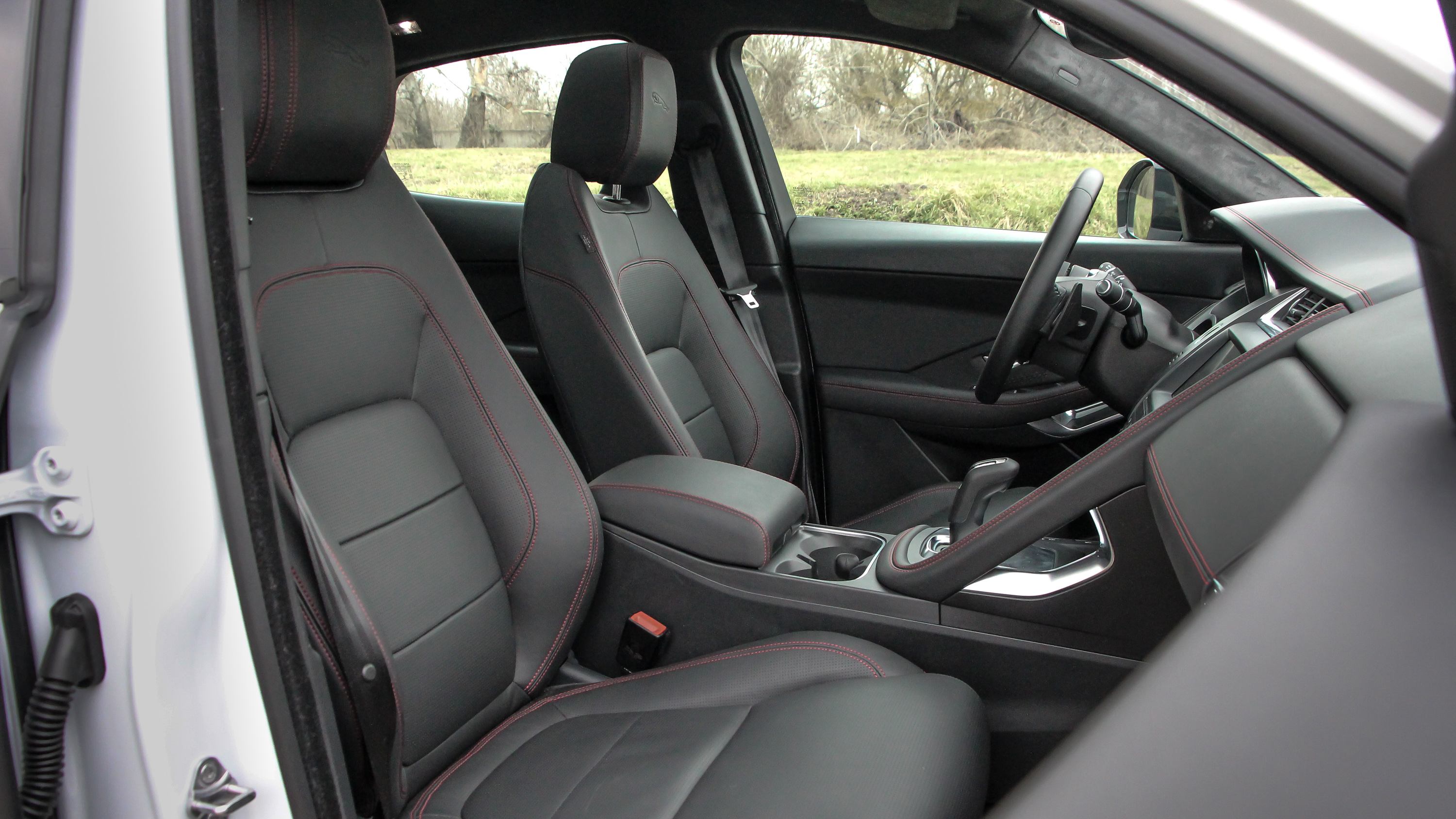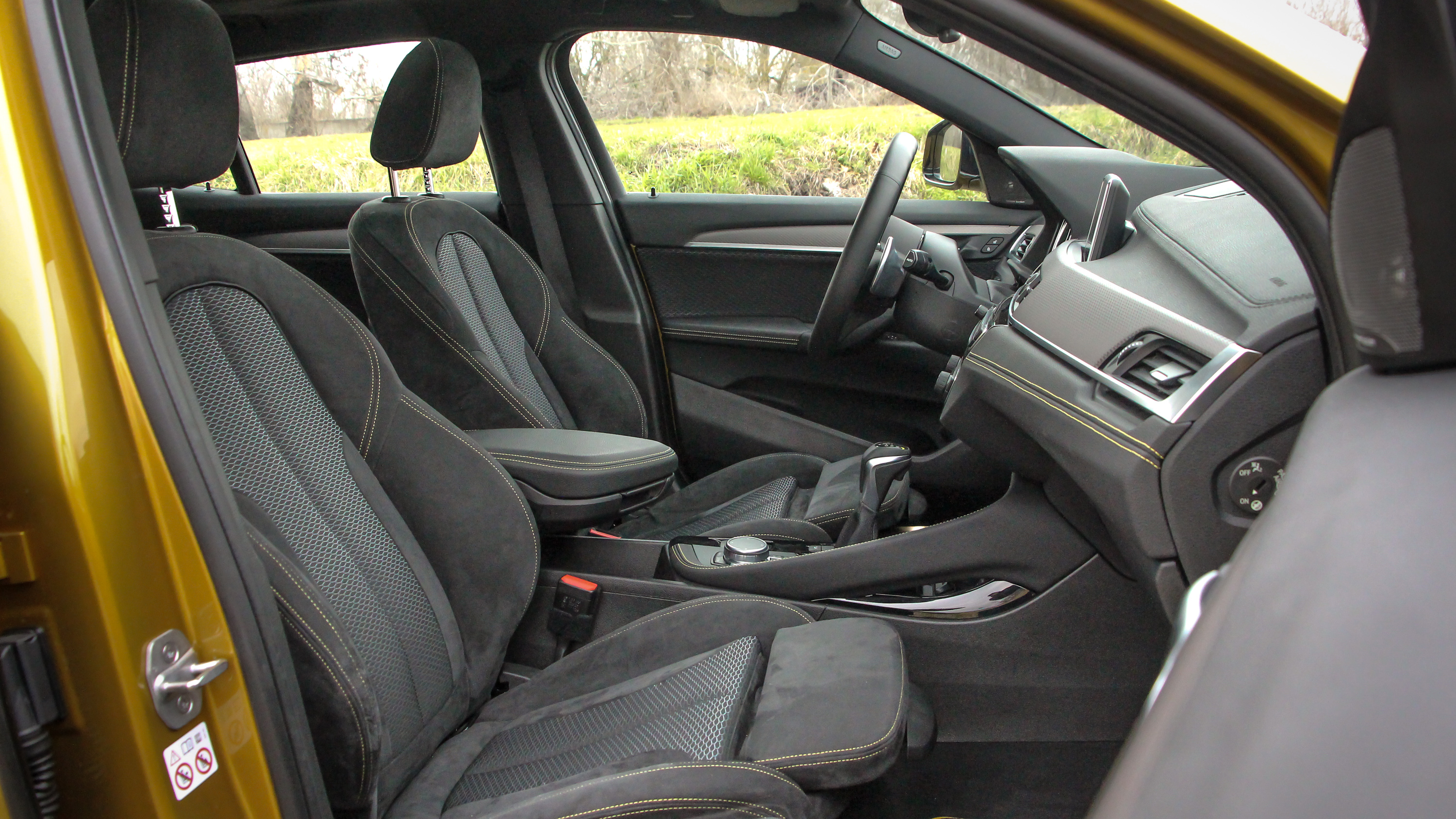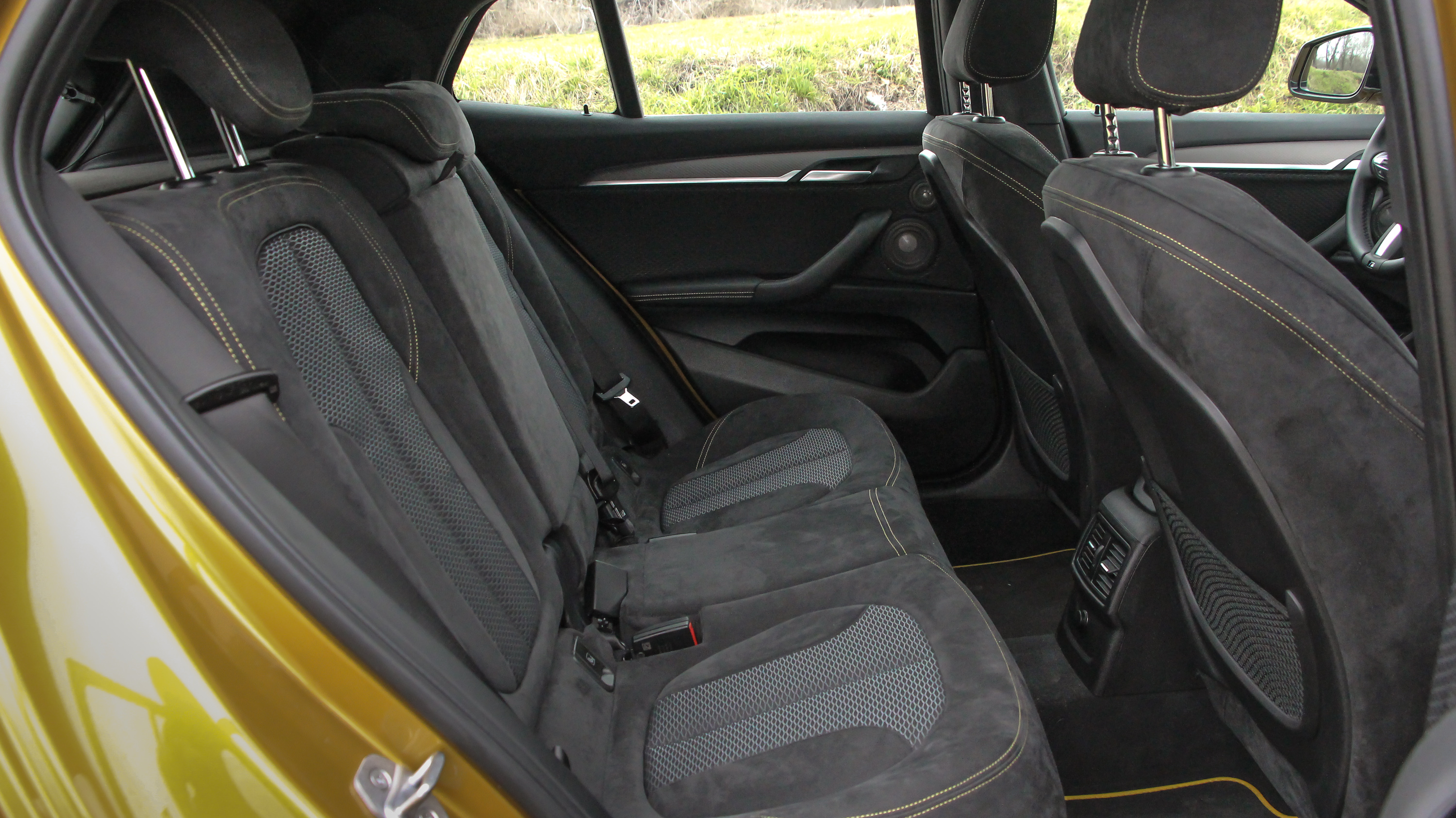 Mindenki másképp méri, ezért is különös, hogy az E-Pace katalógusértéke 577 liter, ami plafonig pakolva értendő felhajtott ülésekkel, padló alatti rekeszekkel együtt. Az X2 csomagtere már csak szemre is nagyobb, a padló kivehető, kalaptartó alatt mérve értendő a 425 liter, lehajtott ülésekkel a bajor több mint 100 litert ver a brit versenytársra. Fejtérben, válltérben az X2 a szűkebb, az M csomagos sportülések miatt amúgy is skatulyába zárt élményt kapunk, ami persze elengedhetetlen a sportos hangolathoz. Az ülések nagyon jól tartanak, állíthatóságuk még az oldaltámaszokat is érinti, az E-Pace inkább hagyományos értelemben véve kényelmes és hétköznapi. Anyaghasználatuk nagyjából jól ismert, a prémium minőségű bőr és Alcantara mellett elég jó műanyagokat is találunk. Összeszereltségben az E-Pace a márka modelljeit tekintve erősen pozitív élmény, akárcsak a Velar a Land Rovernél, úgy a Jaguarnál ez most a legminőségibb érzetű modell. A BMW hozza a márkától elvártat, a karosszéria merev, zörejt sehonnan sem hallunk.