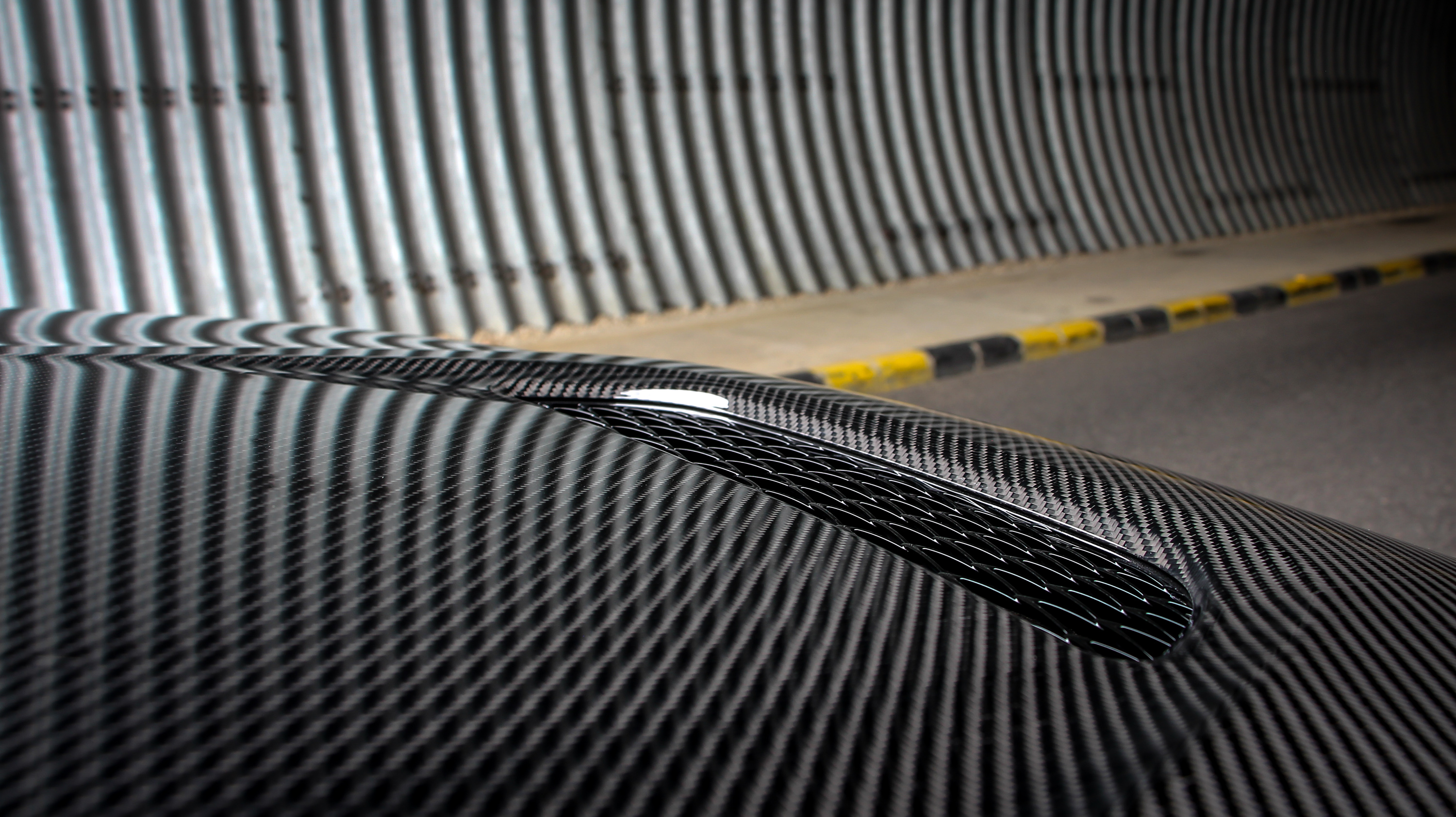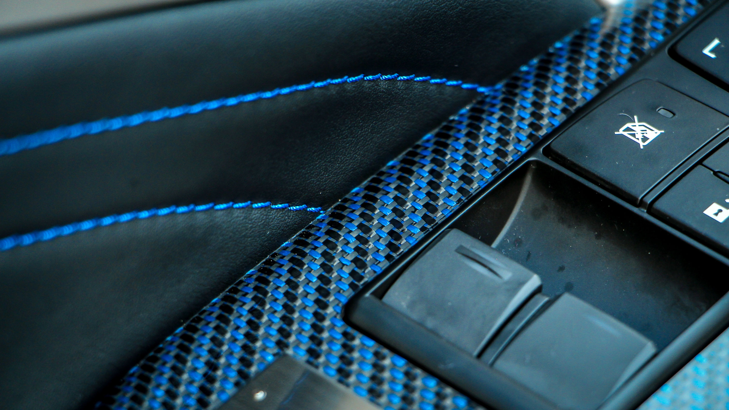 Egyedi elemek még a kék és ezüst szálakkal szövött karbonszálas betétek, a bal oldali ajtón pont erre került az ünnepi fém plakett is. Bár a tetőkárpit fekete, anyaga és mintája miatt most megbocsájtom, elképesztően finom tapintású szövetből készült. Különös, hogy épp erre figyelnek görcsösen a legtöbb autójuknál, pedig igen ritkán ér hozzájuk bárki.