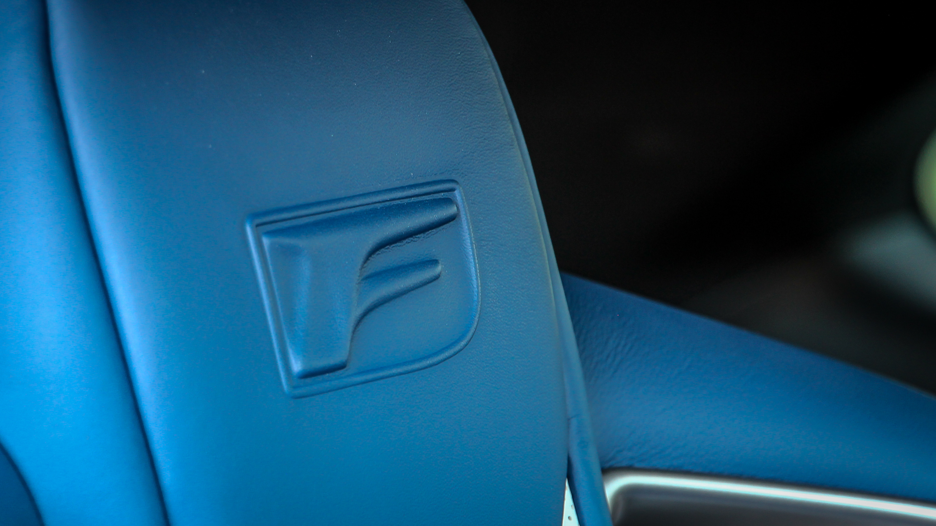 Az F részleg színe a kék, de ezzel kint az oldalt és hátul megtalálható emblémán kívül nem is találkozunk, na de bent! Imádom, ha valami nem fekete utastérrel érkezik, mondjuk ez most csak részben teljesült, de véleményem szerint rendkívül különleges az, amit az évfordulós modell belterével csináltak. A sportülések kék-fehér bőrkárpitja csalogató, hát még a tartásuk, az oldaltámaszt külön is lehet állítani, de a formázásához kevés hasonlót találunk. Kék a kormány teljes bőrözése és a műszeregység fölötti domborulat is,