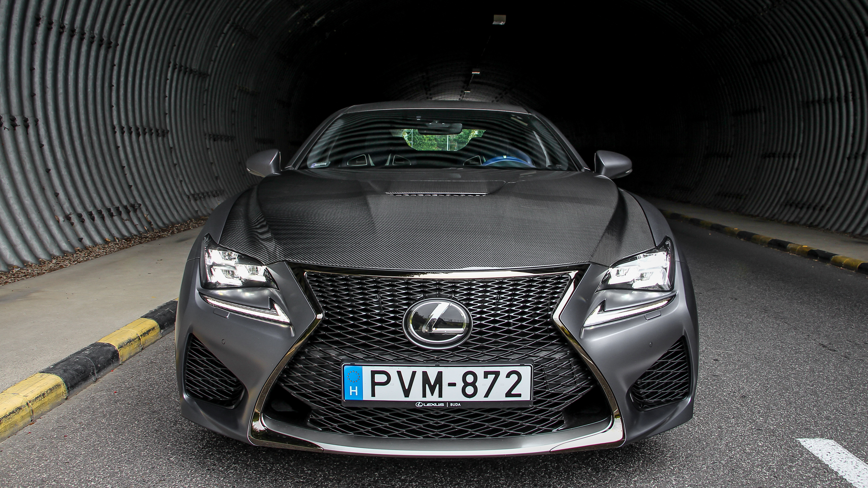 Valódi csemege a szemnek, klasszikus kupéfazon, két hatalmas oldalajtó, keret nélküli ablakok, hosszú első és hátsó túlnyúlás, kiváló arányok. A meredeken lecsapott orr furcsa, viszont semmihez sem fogható, pontosabban a 4-es BMW-nek is van egy hasonló púpja, de nem ennyire drasztikus, ez a kor gyalogosbiztonsági előírásainak megfelelően született. Amit kívülről látunk, annak csak egy részét kaphatjuk meg egy RC F-hez, és bármennyire is feltűnősködésnek tűnhet, minden igazi. Az évfordulós modell a legmagasabb felszereltségre épült, vagyis megkapta a teljes karbonszálas csomagot is, aminek nyomán lecserélik a teljes tetőlemezt, a hátsó aktív légterelőt és a géptetőt is, valódi, hamisítatlan karbonszálas műanyagra. Ezekkel nagyjából 9 kilót spóroltak a súlyából, ami egyébként így sem kevés, kicsivel több mint 1,8 tonna, egy igazi ólommadár. A mattszürke fényezés az évfordulós modell sajátja és ez az, ami tökéletesen kiemeli az RC F elképesztő vonalait, és így még hangsúlyosabbak a fényes karbonszálas elemek is.