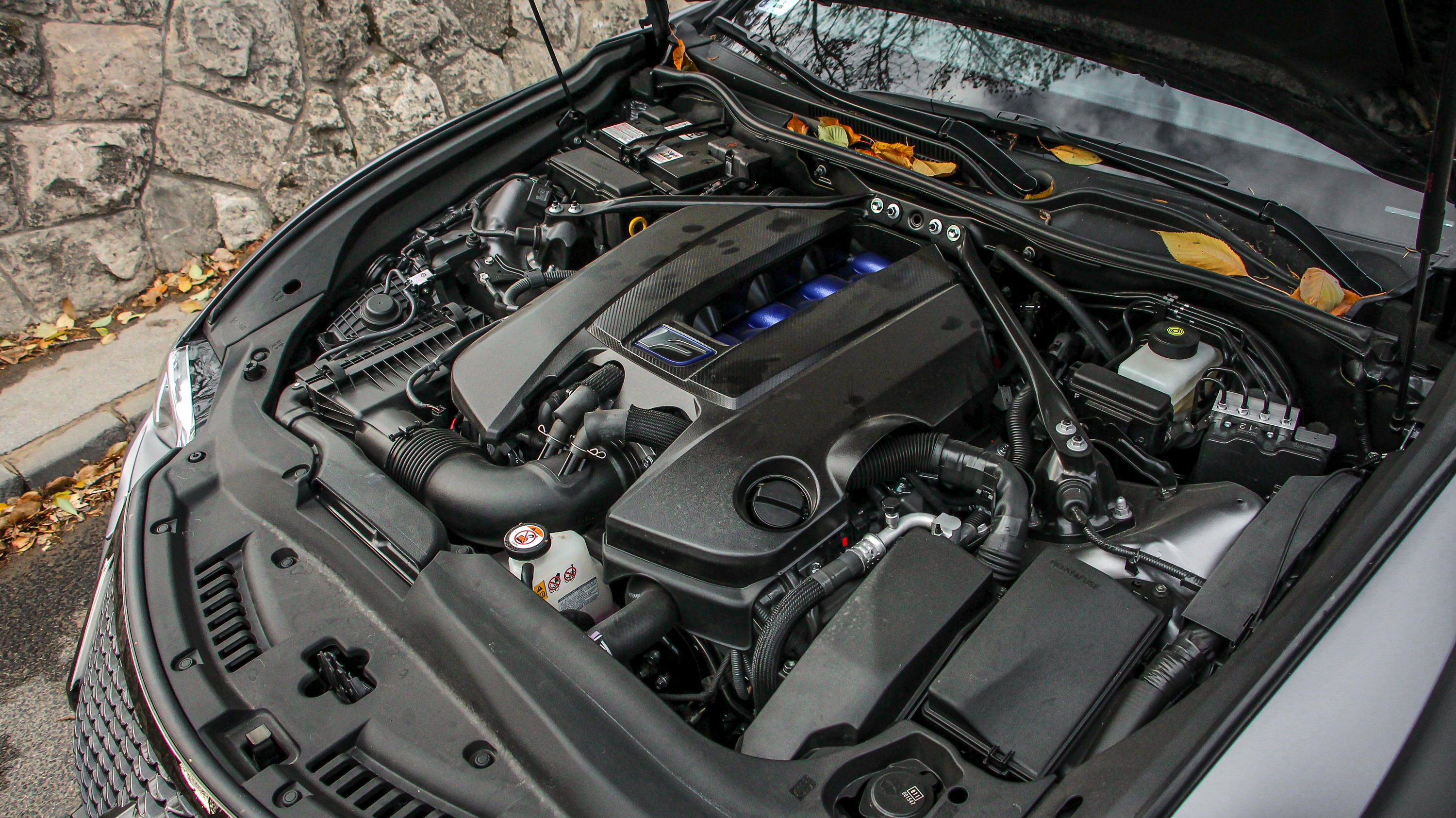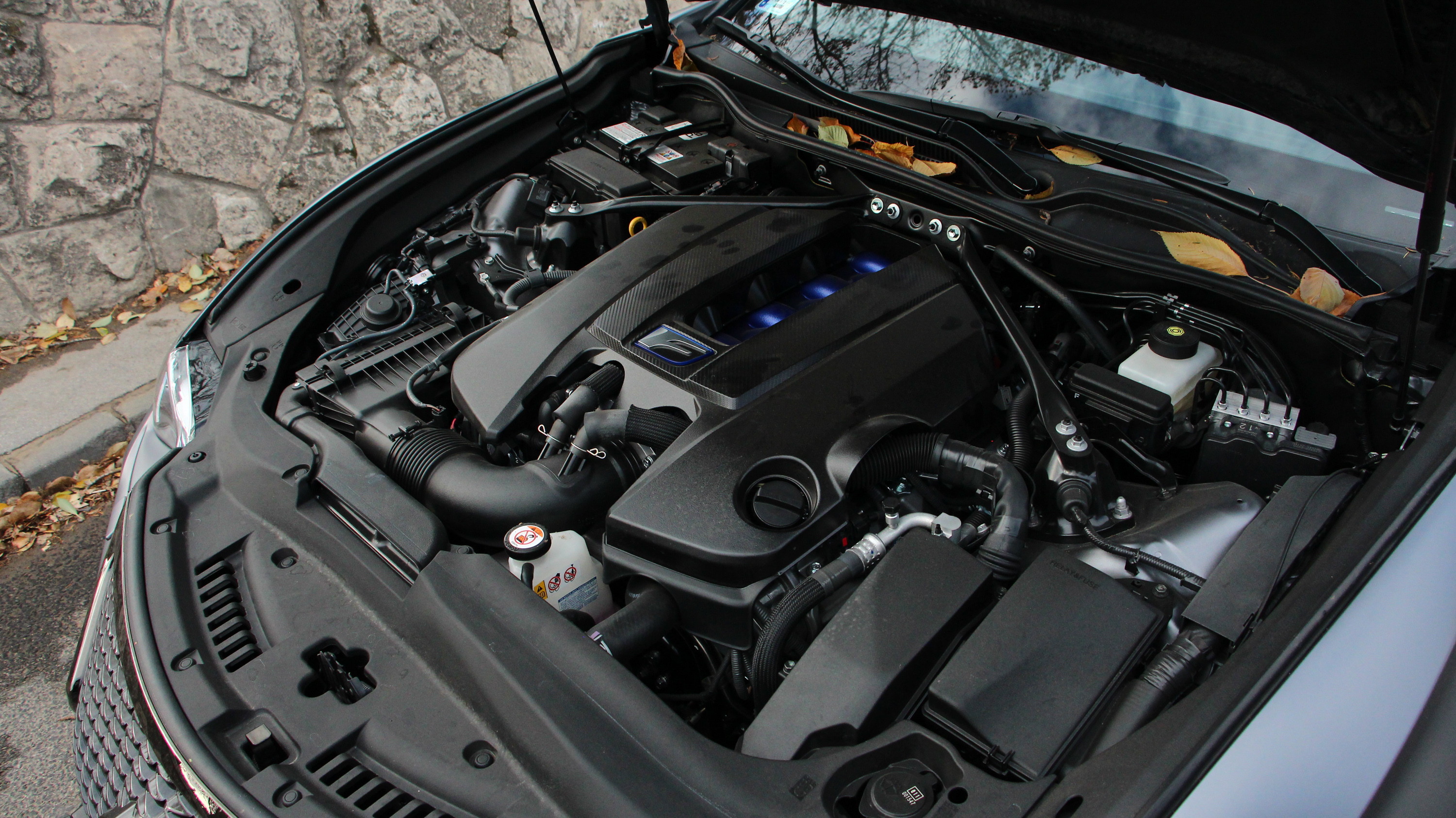 Ez a 10 év olyan szinten nem tűnt el nyomtalanul a Lexus F Sport részlegénél, hogy az első IS F-ben is dolgozó 5,0 literes, 2UR-GSE kódjelű V8-ast a mai napig megtartották. Hegyeztek még rajta egy kicsit, volt még benne tartalék, 477 lóerőt és 530 Nm nyomatékot erőszakoltak ki belőle, bármiféle segítség nélkül. Tisztán szívja a levegőt, se turbó, se kompresszor, akárcsak a Mustang estén, de amíg az amerikait baltával faragták, addig a japánok lézervágóval dolgoztak. Kettős befecskendezés, változó szelepvezérlés és magas fordulatra kihegyezett teljesítményleadás, a 477 lóerőhöz 6400-7100 főtengelyfordulat között kell tartanunk a motort, a nyomaték pedig 4800-5600 között érhető el. Ennek nagy része már alacsonyabban is rendelkezésre áll, jóval több, mint a Mustangnál, az RC F-et sehol nem érezhetjük lomhának.