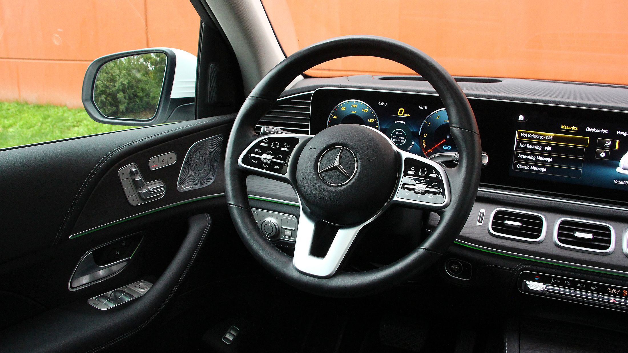 Lassan megbarátkozok a digitális kijelzőkkel is. A Mercedesnél lényegében egyetlen nagy téglalap a vezető előtti műszeregység és az infotainment 12,3 colos kezelőfelülete. Nagyon szép grafikával dolgozik és ügyesen magyarosították, legalábbis nem futottam bele olyan pontba, ahol nem értettem volna, mit akart a költő. Az MBUX rendszer pedig rengeteg funkciót kínál. A hangvezérléses „tanácsadás” sokáig megunhatatlan, ahogy a „kiterjesztett valóság” funkció is annyira újnak hat még, hogy úgy érezzük, igazán különleges autóban ülünk. Ezekre szoktam azt mondani, hogy színház, ám, ha jó az előadás, akkor nem kell szégyellni, hogy élvezzük. Talán csak a kezelőfelületeket vitték túlzásba. Nézzük csak, először is ott a kormánykerék! Elsőre kaotikusnak tűnhet a gomberdő, de néhány perc alatt megszokható. A bal küllőn a vezető előtti műszeregységben lehet barangolni, illetve az adaptív tempomatot működtetni, a jobb küllő pedig az infotainment kezelésében segít. Ugyanakkor ezt az érintőképernyőről is megtehetjük, vagy a középkonzol tapipadján. Viszont a tapipadtól én nyugodt szívvel megválnék.