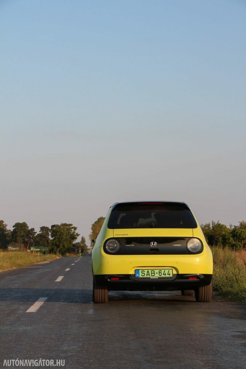 A fentiekből is látszik, bár a Honda e messze nem a leghatékonyabb villanyautó, de nem is az akar lenni, hiába fejtegeti a sajtóanyag, hogy a digitális tükrök mennyire csökkentik szélességét és a légellenállását. Az biztos, hogy szélzajt nem keltenek, az autópályás tempó is csendesen futható, a végsebesség 145 km/óra lehet, addig pedig elég dinamikusan gyorsul is. Még normál menetmódban is, de akár sport is választható. A gázpedálnak nem csak a gyorsító, hanem az elengedéskori lassító hatása is szabályozható, hiszen egypedálos menetmód is választható, utóbbival olyan erős visszatöltést kapunk, hogy az autó akár álló helyzetre lassul, így valóban egyetlen pedállal szabályozhatjuk a tempót, még városban is. Parkoláshoz érdemes kikapcsolni, hiszen akkor kifejezetten jól jön a lassú kúszás, a fékpedállal finomabban szabályozhatjuk a tempót. Az viszont némi kényelmetlenség, hogy az egypedálos vezetés az amúgy távolságtartós tempomat bekapcsolása, majd kikapcsolása után sem tér vissza, ahogyan az autó kikapcsolása után is elvész a beállítás.