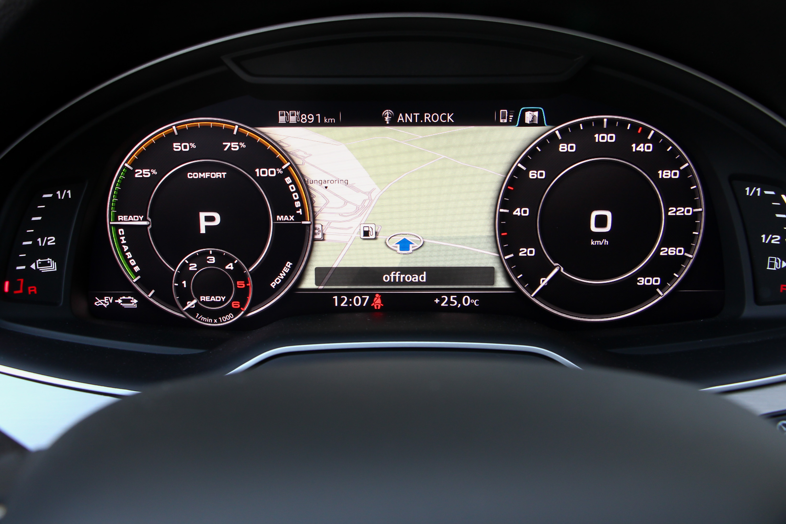Három az egyben. A Q7 e-tron használható villanyautóként, klasszikus hibridként (amikor csipeget ugyan az akkumulátorból, de szükség esetén dízellel is hajt), illetve választható az akkumulátor töltöttségének megőrzése is. Utóbbit például országútra, autópályára érve érdemes bekapcsolni, hogy a városi csúcsforgalomhoz tartogassuk az emissziómentes üzemet. A hibrid-variácókon túl különféle menetmódok is állíthatók, sportban már elég élénken viselkedik az e-tron, off-roadban automatikusan emeli magát szintszabályzós futóművével és temérdek hasznos terepműszert is ad az induláskor némán és rezzenéstelenül nyíló, az autó leállításkor vagy gombnyomásra is eltűnő középső kijelzőn.