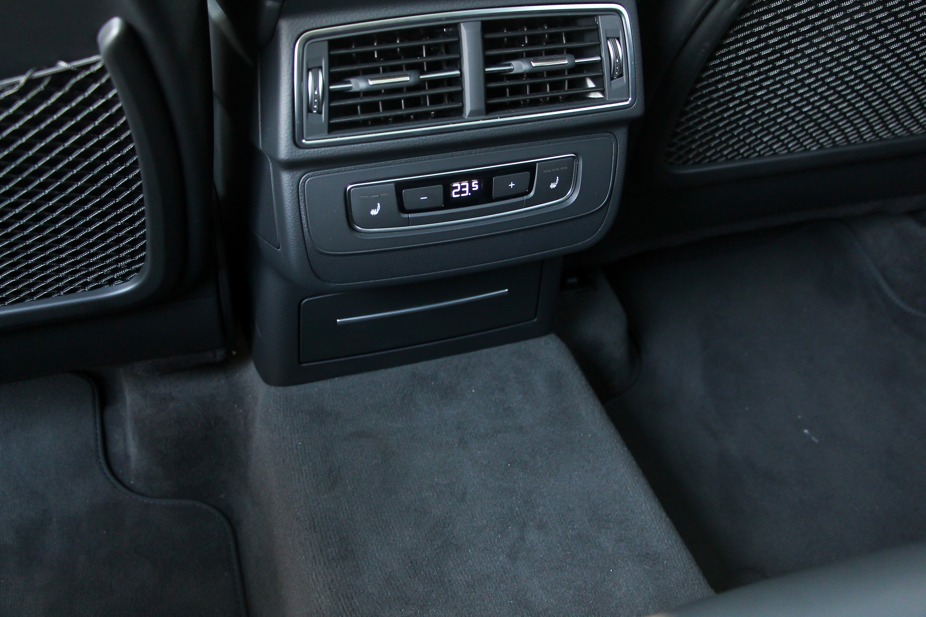 A klíma háromzónás és dedikált gombokkal vezérelhető, szinten minden más a tapipadot is adó MMI controlerrel. Telefonunkat az Audi Phone box jelerősítővel és vezeték nélküli töltővel várja, a légbevfúvók végigfutnak a műszerfalon, huzatmentes, csendes szellőzést adnak