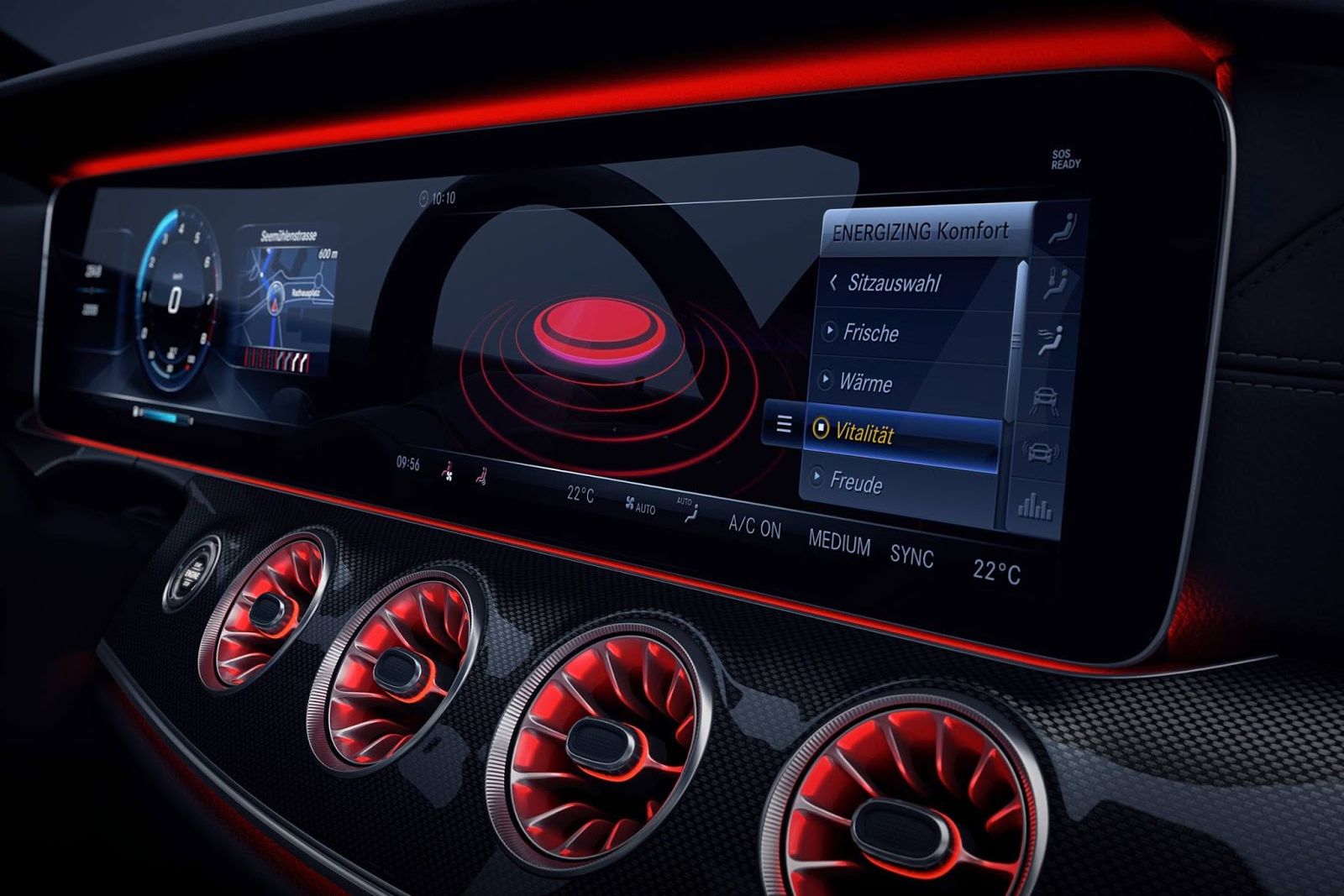 Középen a kijelző alatt látszólag négy turbófeltöltő csigaház foglal helyet, ugyanis meglehetősen ötletesre és dizájnosra sikerült szabni a légbeömlőket. Körülöttük karbonszálas betét gondoskodik az exkluzív és sportos megjelenésről, utóbbira rátesz egy lapáttal a piros hangulatvilágítás is. A tablet helyett már deszka méretű kijelző színei és felbontása várakozáson felüli. Hogy milyen lesz ez a valóságban és hogy fog mutatni a teljes belső tér, az jövő héten a Los Angeles-i Autószalonon kiderül, a CLS Coupé ugyanis ott debütál majd először.