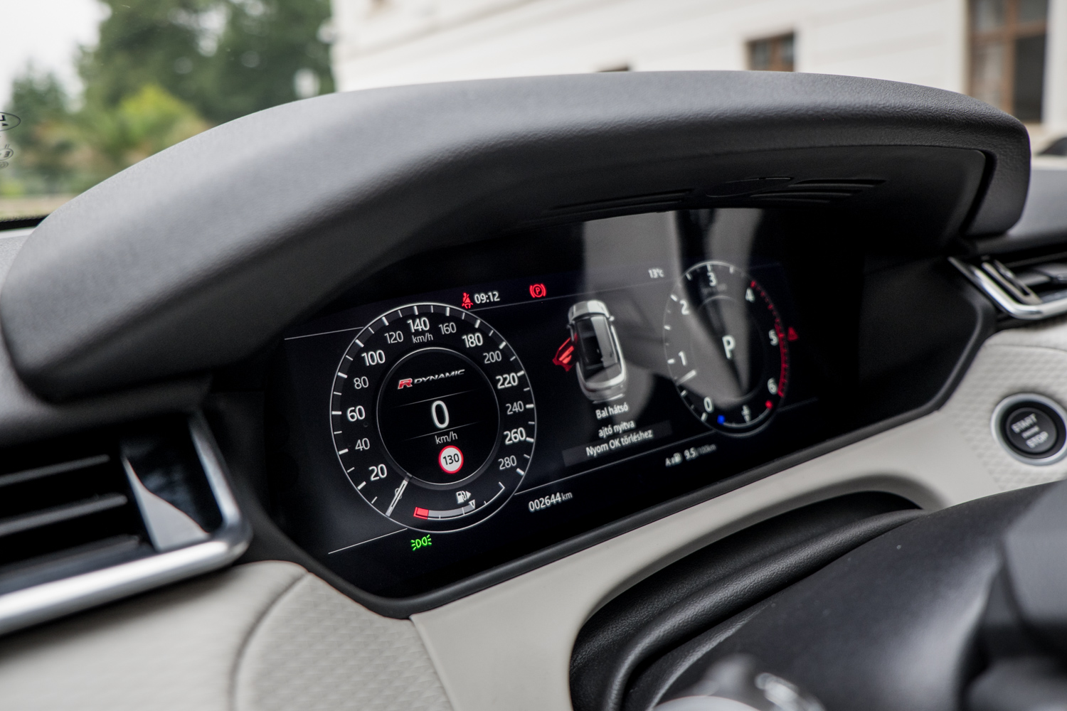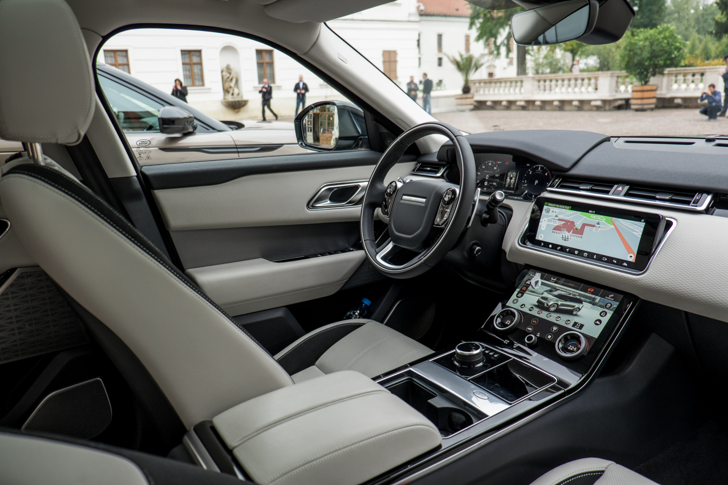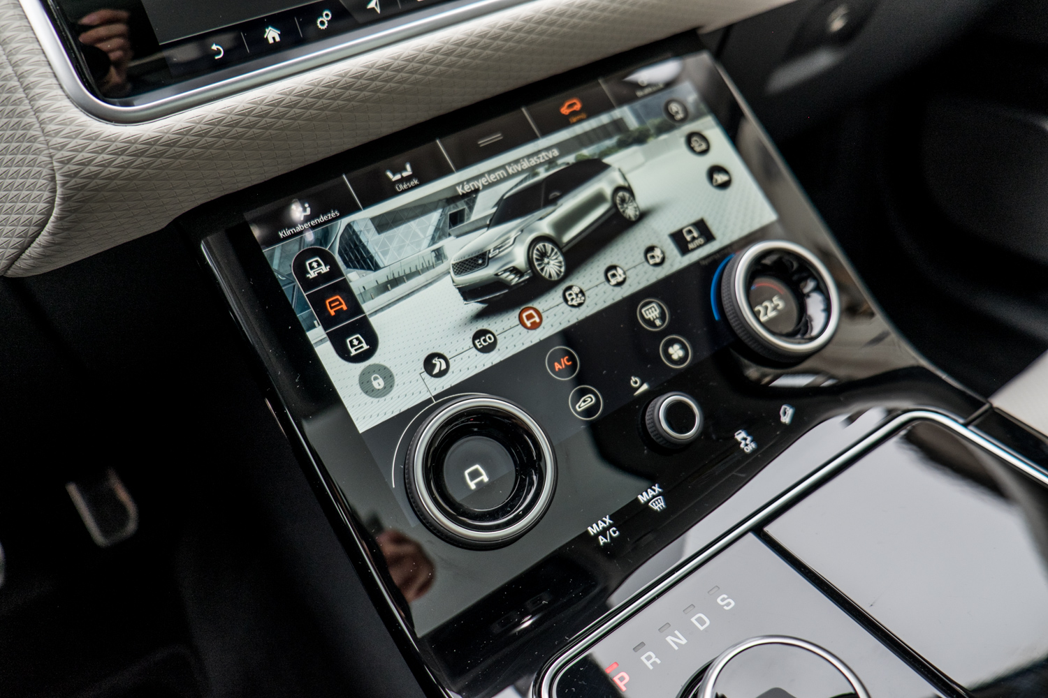 Az akadálytalan terepezést mindeközben olyan kényelemben élvezhetjük, amihez kevés hasonlót találunk a piacon. A Velar beltere külön cikket érdemelne, hiszen a belső dizájn is hasonlóan letisztult, mint a külső, amellett, hogy klasszikus vonalakat hoz. A vízszintes vonalakkal rajzolt műszerfal döntött, a nem bőrözött kivitelnél szép rombuszmintás, világos betéttel díszítettet kapunk. Összesen három kijelzőt találunk – vagy ötöt, ha a fejtámlákba építetteket is beleszámoljuk – egyet a műszerek helyén, egyet a műszerfalon, aminek a dőlésszöge állítható menüből, valamint egyet a középkonzolon. Utóbbit összehozták két tekerőgombbal, aminek a funkciói folyamatosan változnak. Mindegyik képernyő szép, részletgazdag, és gyors a szoftver, jobban kezelhető, mint a márka eddigi rendszerei. A digitális műszeregységből teljes egészében kérhetünk 3D-s navigációs nézetet, de a kormányról kezelhető kijelző menürendszere is összetett, nagyon sok funkciót irányíthatunk innen.