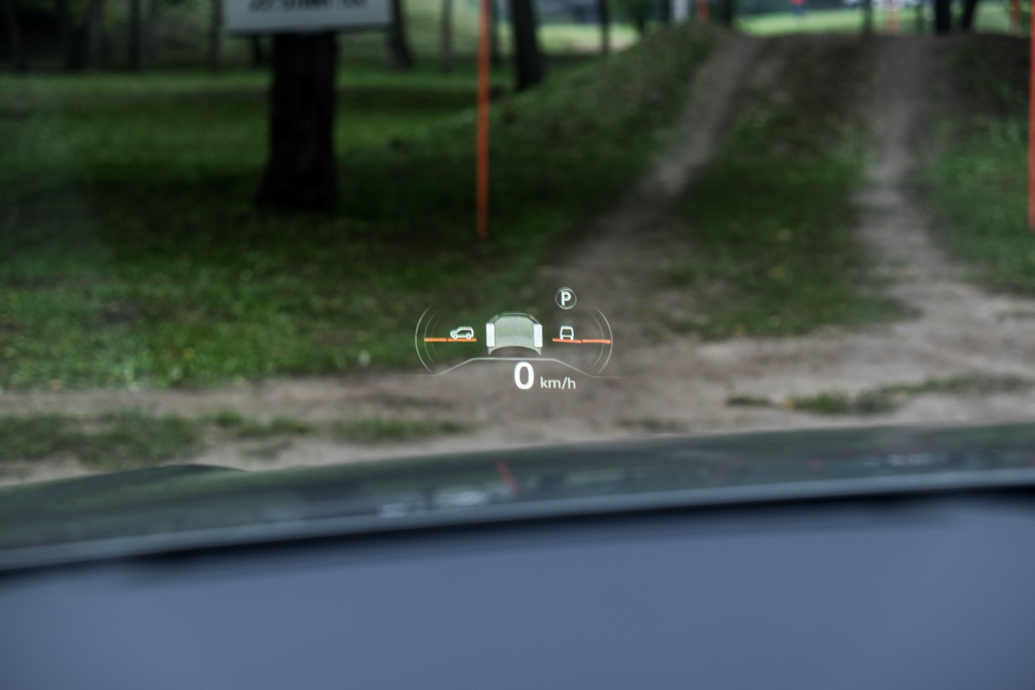 A tempomat és a lejtmenetvezérlő együtt is használható, így állandó sebességgel terepezhetünk. A difik állapotát folyamatosan mutatja, terepmódban az autó dőlésszögét még a HUD-ra is kivetíti, ahogy a navigációt, a sebességet, a fordulatszámot és minden egyéb hasznos infót is