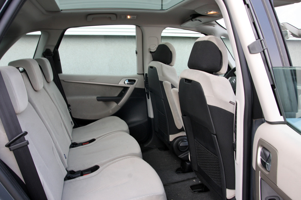 Buszlimuzinként a Picasso ülései viszonylag magasak, kényelmes méretű ülőlapokkal és támlákkal - remek húzás volt a tervezők részéről, hogy a széles autóban adódó logikus helyre, a belső felükre helyezték az állítókarokat. A vajszínű üléskárpit tartósnak tűnik, egyelőre jól is tűri az igénybevételt, de összekoszolni nem nehéz. A beltér műanyag burkolatai főleg puhák, bár egy-két keményebb fedél is akad, a tárolóhelyeket összeszámolni sem könnyű. A műszerfal tetejének mindkét oldalán van fedeles rekesz, egy sima kesztyűtartó és egy hűthető szekrény a szintén ajtó mögé rejtett CD-s fejegység alatt. Ajtózsebei is hatalmasak, tulajdonosa jól tele is tömte őket mindenfélével.