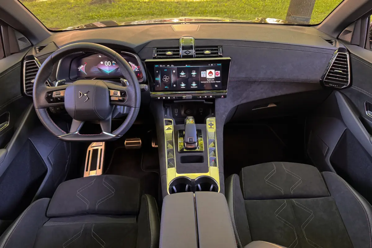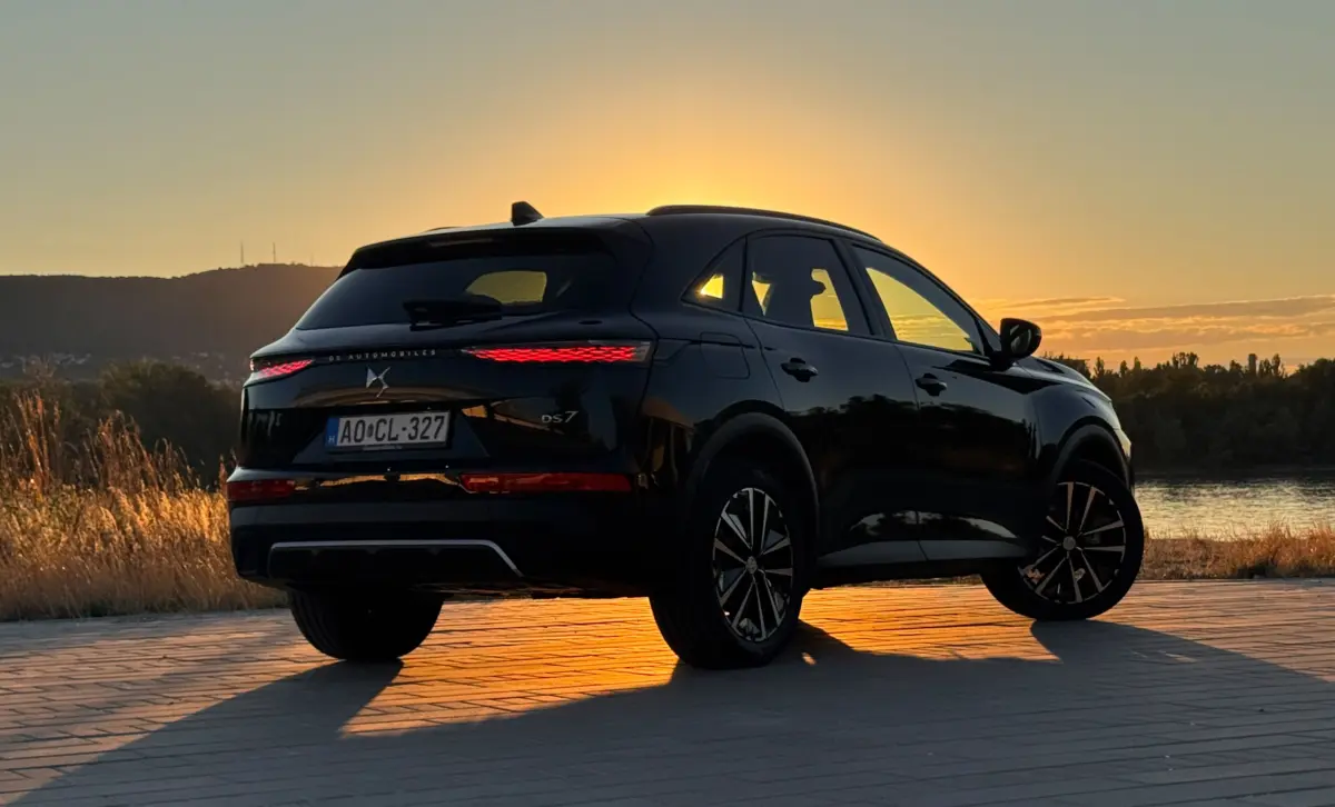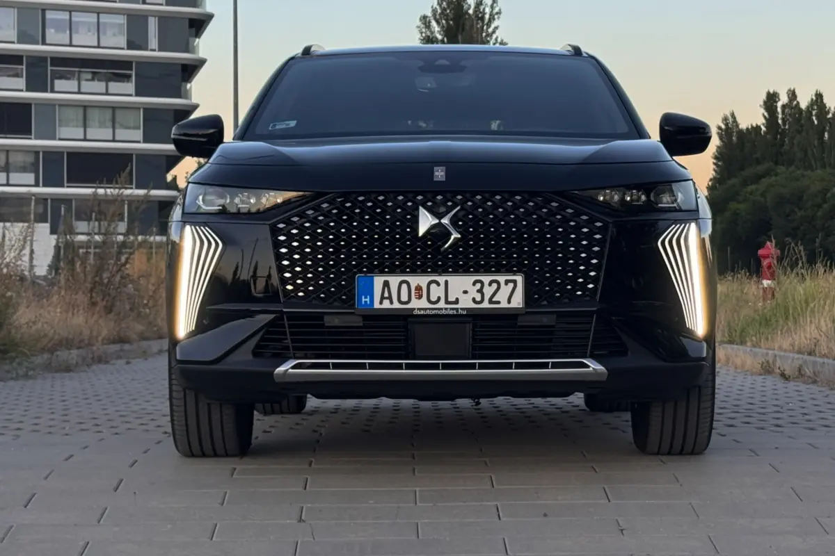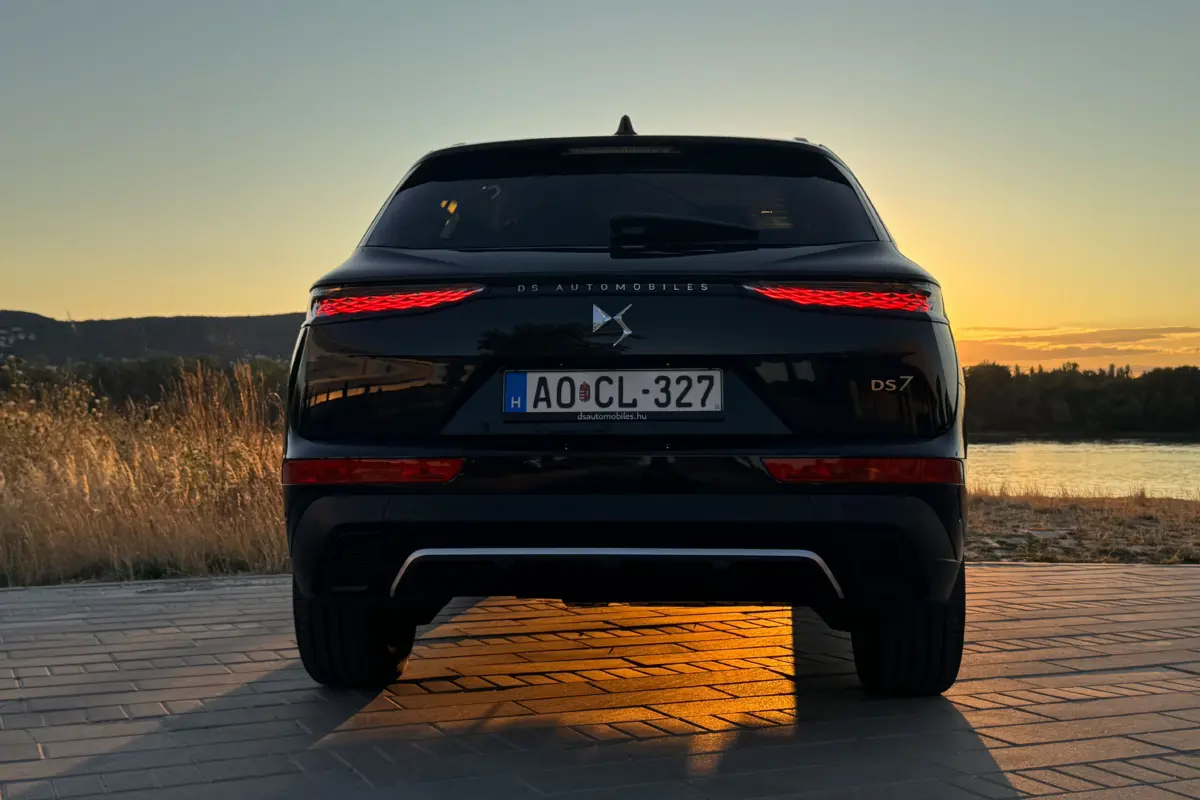 Szóval a külső ugyanolyan extravagáns, akárcsak a magasabb felszereltségű modelleknél. hatalmas hűtőmaszk, apró, csillogó gyémántoknak tűnő díszítéssel, továbbá az első lökhárítóba rajzolt fénycsíkokkal. Ezek azt az illúziót keltik, mintha a fény a karosszérialemezeken törne át. És ez a fekete fényezéssel még hatásosabb, bár az is tény, hogy az autó látványos vonalait pont a fekete fényezés rejti el. Szerencsére a hátsó LED fényszórók örvényszerűen pikkelyezett mintázatát nem tudja elrejteni, úgyhogy az összkép továbbra is egyedi, már messziről felismerhető egy DS közeledése. A PHEV változathoz képest más az autó orrán az embléma, valamint a hátsó lökhárító kamu kipufogónyílásait befalazták.