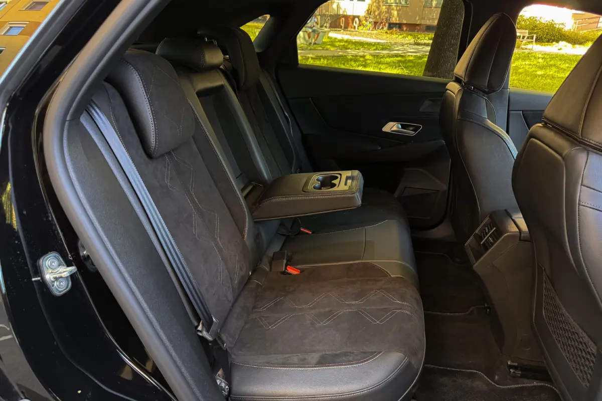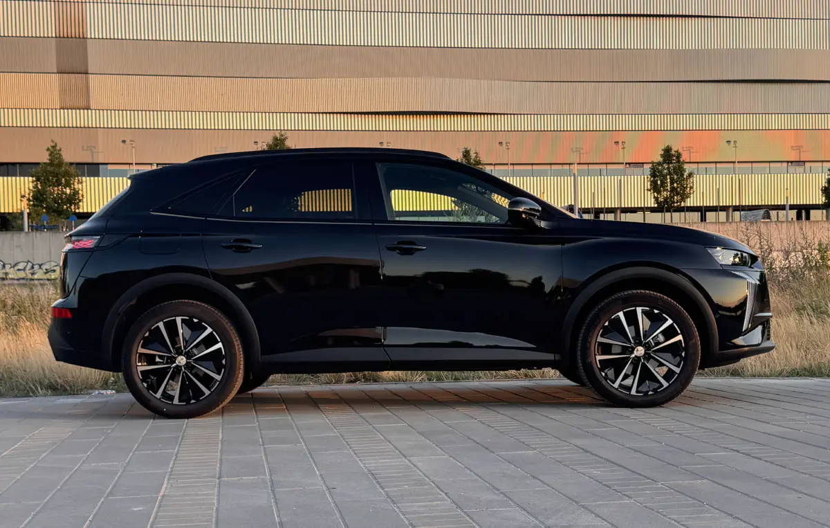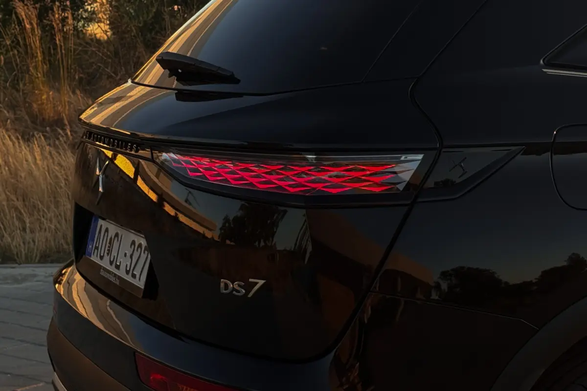 Szóval a külső ugyanolyan extravagáns, akárcsak a magasabb felszereltségű modelleknél. hatalmas hűtőmaszk, apró, csillogó gyémántoknak tűnő díszítéssel, továbbá az első lökhárítóba rajzolt fénycsíkokkal. Ezek azt az illúziót keltik, mintha a fény a karosszérialemezeken törne át. És ez a fekete fényezéssel még hatásosabb, bár az is tény, hogy az autó látványos vonalait pont a fekete fényezés rejti el. Szerencsére a hátsó LED fényszórók örvényszerűen pikkelyezett mintázatát nem tudja elrejteni, úgyhogy az összkép továbbra is egyedi, már messziről felismerhető egy DS közeledése. A PHEV változathoz képest más az autó orrán az embléma, valamint a hátsó lökhárító kamu kipufogónyílásait befalazták.