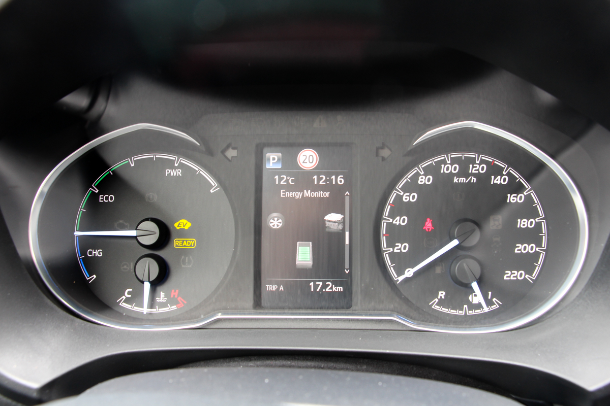 A TFT és a központi infotainment képernyőre is kirakhatunk hibridspecifikus kijelzőket. A hibrid motorja az utazási idő több mint felében áll, az akkumulátor garanciája 10 éves korig hosszabbítható