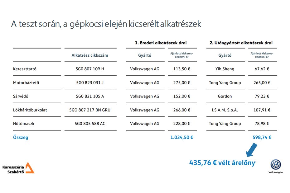Míg a 15 km/órás ütköztetés után a gyári alkatrészekkel javított Golfon 15 alkatrész cseréjével javítható sérülés keletkezett, a karosszériások által naponta használt Audatex kalkulációja szerint 1353 eurós alkatrész- és 2646 eurós teljes költséggel, addig a korábban utángyártott alkatrészekkel javított esetén több mint három és félszer magasabb, 4774 eurós anyag és 7207 eurós teljes javítási költség adódott, amivel a VII-es Golf könnyedén gazdasági totálkárosnak is tekinthető. Közel 40 alkatrészt kellett cserélni, köztük a hűtőket is. De nem csak ez a probléma, mivel a szerényebb energia-elnyelő képességű utángyártott kereszttartó pont a legfőbb funkcióját, az energiaelnyelést nem látta el, a karosszérián elmozdult a váznyúlvány, s az utasok az alacsony sebességnél - indokolatlanul - nyíló légzsákok által plusz sérülésveszélynek lettek kitéve. Ehhez képest minimális különbség, hogy az utángyártott lökhárítóburkolat a gyárinál sorjásabb és rosszabbul alapozott, a gépháztető varrattömítés és a korróziót gátló cinkbevonat nélküli volt, miként a sárvédő is.
