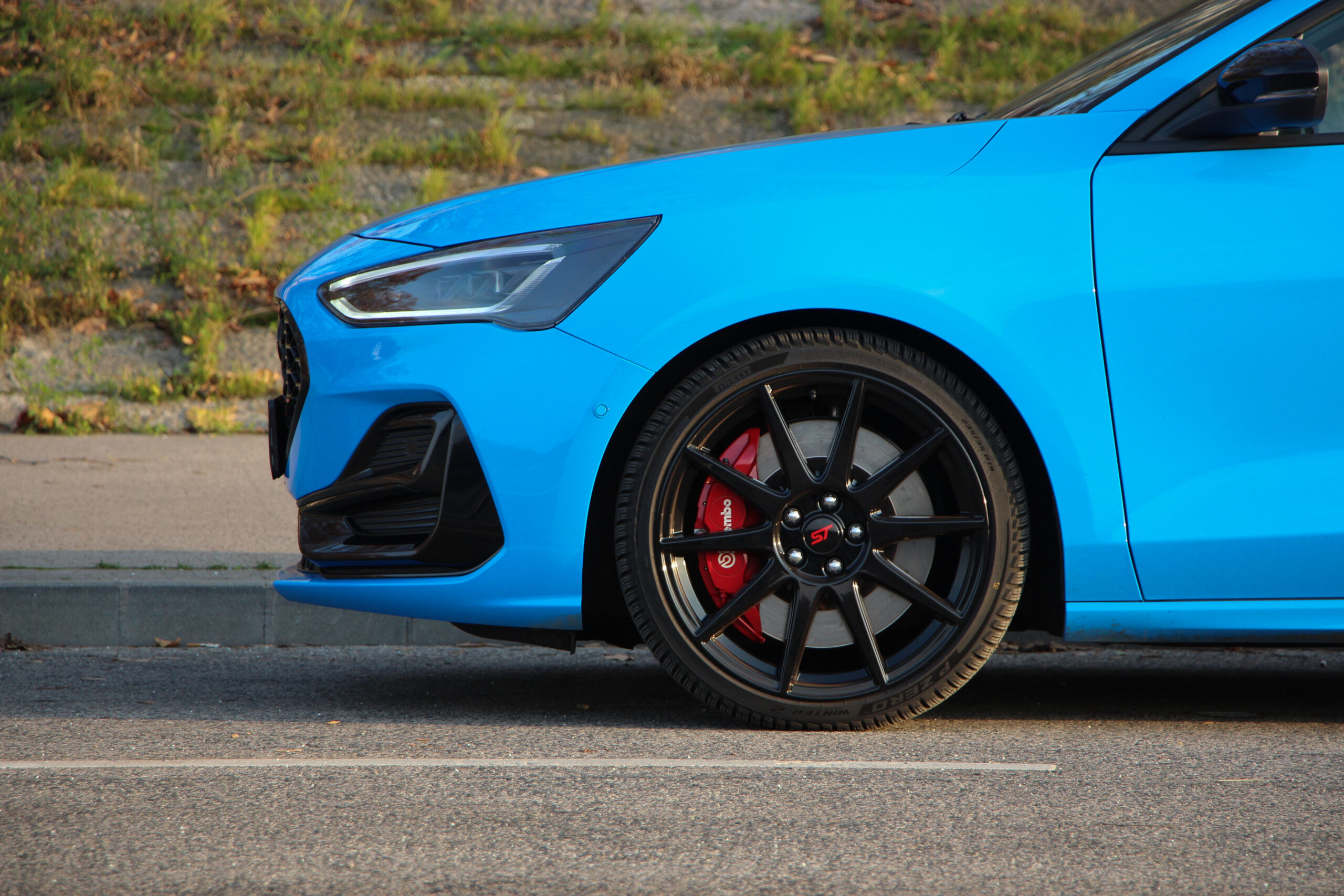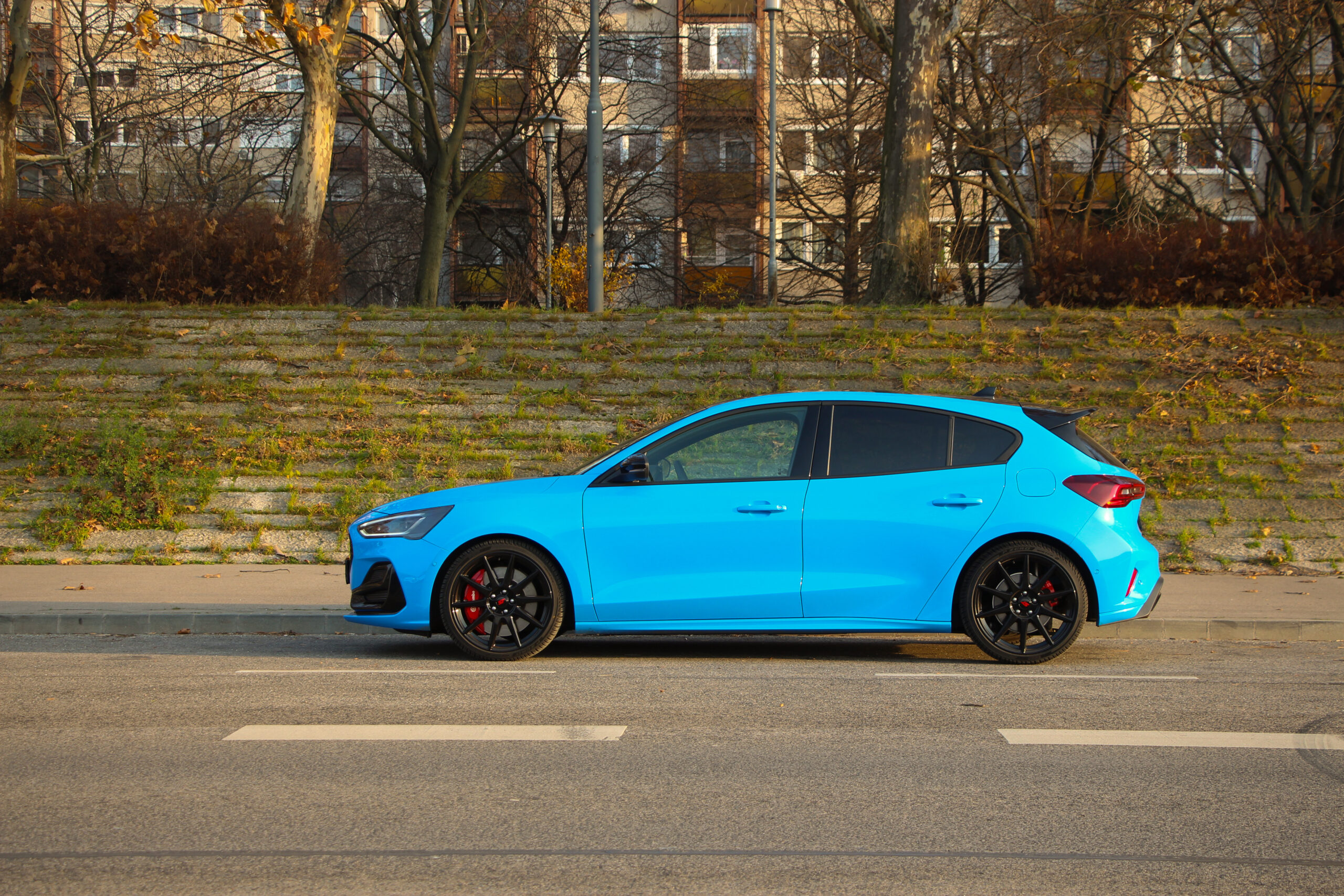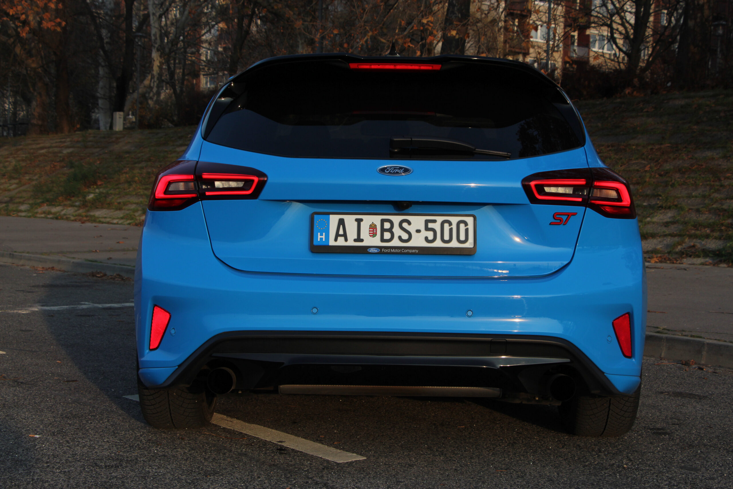 Ám az egyedi fényezésen kívül szinte minden ugyanolyan, mint bármelyik jól felextrázott ST modellen. Méhsejtmintás hűtőmaszk, fekete díszbetétek a lökhárítóban, fekete légterelő hátul, két vaskos kipufogóvég és a diffúzor növeli a sportos hangulatot, a Focus feliratot pedig eltüntették. Végül az új rajzolatú, 19 colos könnyűfém felnik mögött vörös féknyergek harapnak az elöl 330, hátul pedig 302 milliméteres tárcsákra. Látványos az egyszer biztos!