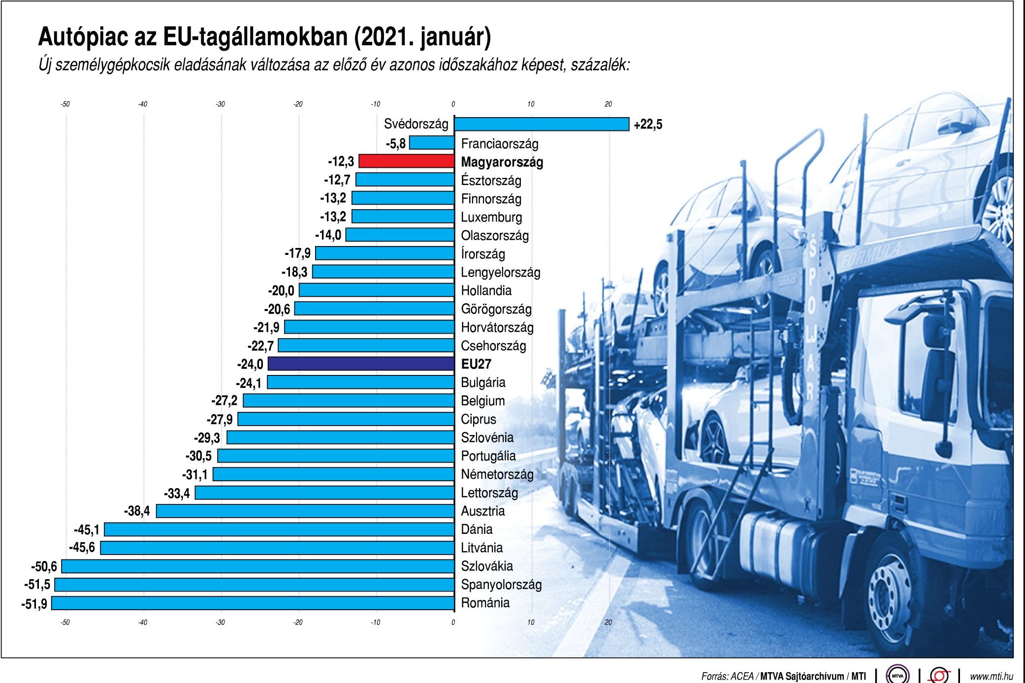 A kétszámjegyű csökkenés alól csak két kivétel volt januárban. Az egyik Franciaország, ahol mindössze 5,8 százalékkal mérséklődött a forgalomba helyezések száma, a másik kivétel az utóbbi évben külön utakon járó Svédország, ahol viszont 22,5 százalékkal növekedtek az új autók eladásai.