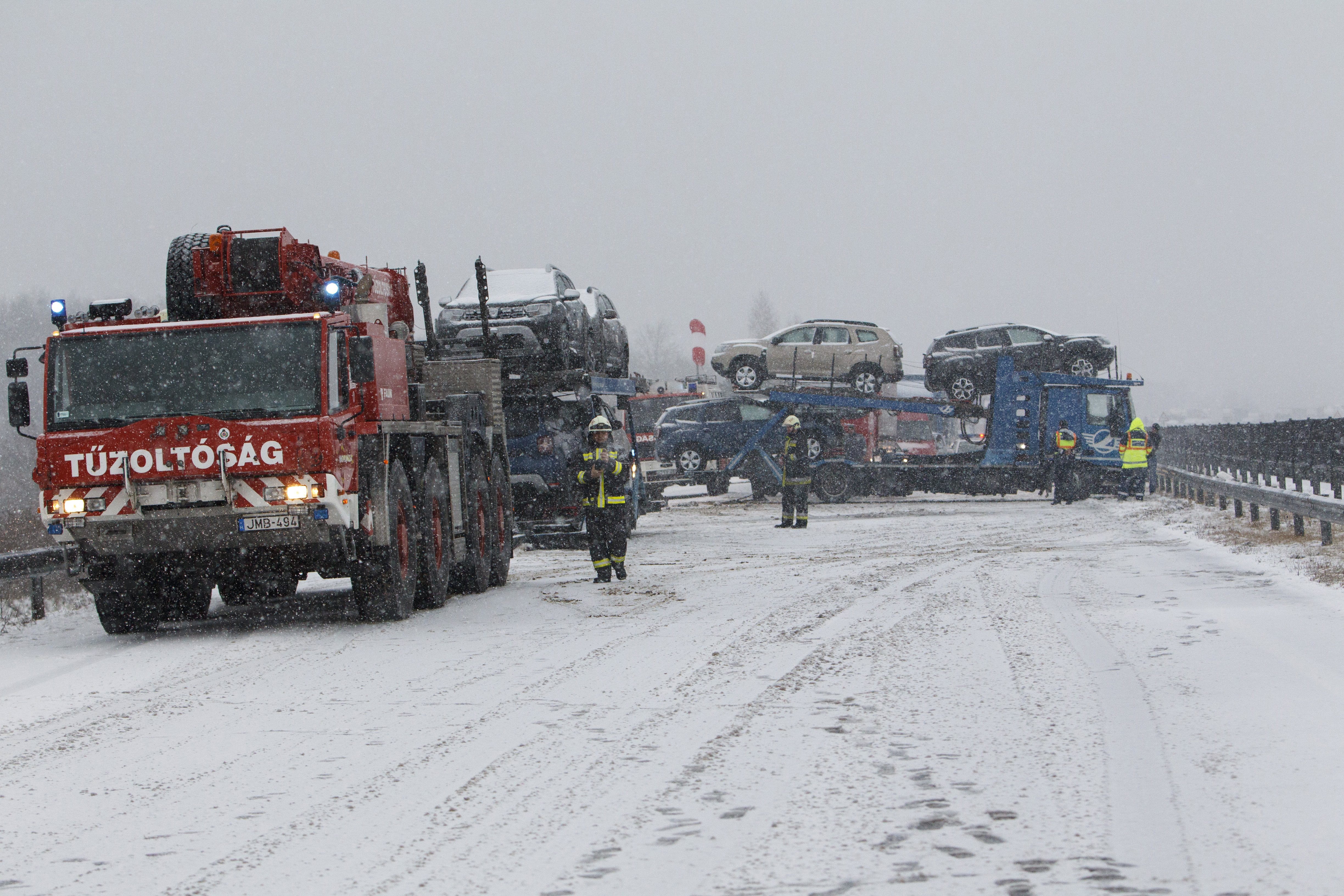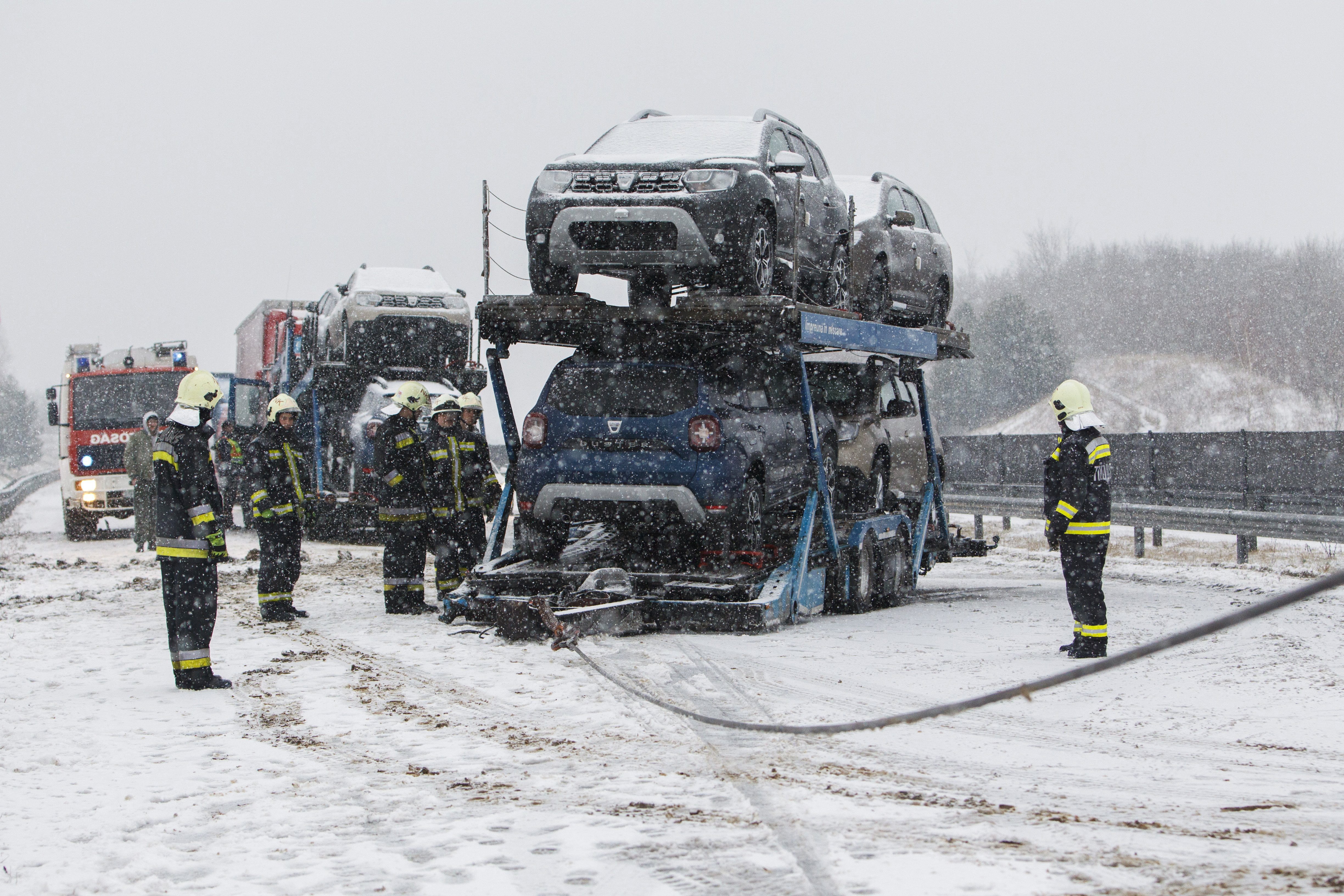 Az új Dustereket szállító pótkocsis nyerges vontató az útpálya mindkét forgalmi sávját és a leállósávot is elfoglalta, ám nem borult fel, a balesetben senki nem sérült meg. A pórul járt kamiont délelőtt 10 órára már elvontatták, így az érintett útszakasz ismét járható. A szórványos havazásban mindenki körültekintően vezessen, a csúszós útfelület csak az egyik veszély, havazásban a drasztikusan lecsökkenő látótávolság is nagy problémákat okozhat.