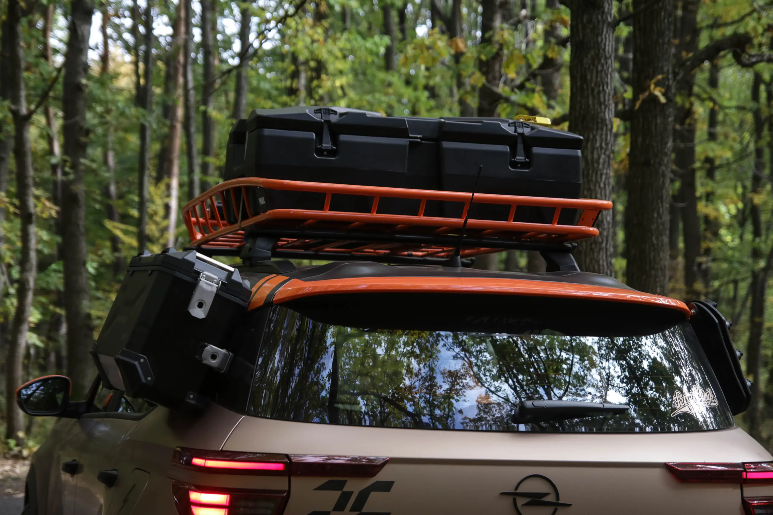 A narancssárga, emelt teherbírású tetősínre azonban nem csak a LED reflektort rögzítették, hanem egy pótkereket, illetve egy nagyobb tárolódobozt is, egy kisebb tárolódoboz pedig a bal oldali C-oszlopon kapott helyet. A túloldalon, tehát az autó menetirány szerinti jobb oldalán két csúszásgátlót rögzítettek, ha a terepgumi nem lenne elég, hogy kikecmeregjen a sárból a sofőr. Az autó első lökhárítóján a rendszám helyét hasonló céllal csörlő foglalja, így a kis formátumú német táblácska a vonószem helyére rögzített mágnessel kerülhet az autóra.