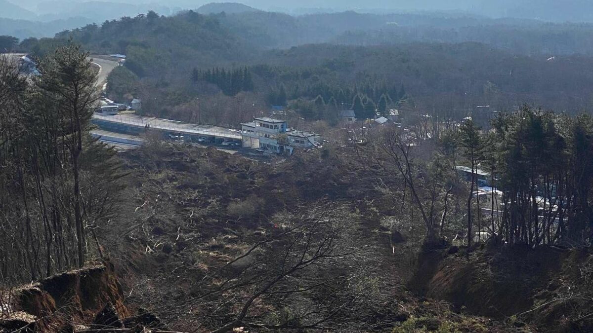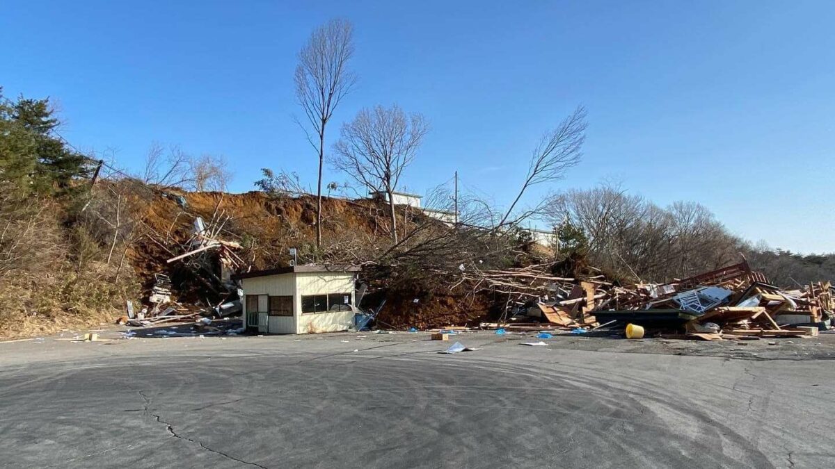 A domb oldalának egy része, melyre a Drift Land pálya épült, lecsúszott és az alatta húzódó pályára és kiszolgálóépületére, garázssorára omlott (Fotó: Facebook - Japan in PR)
