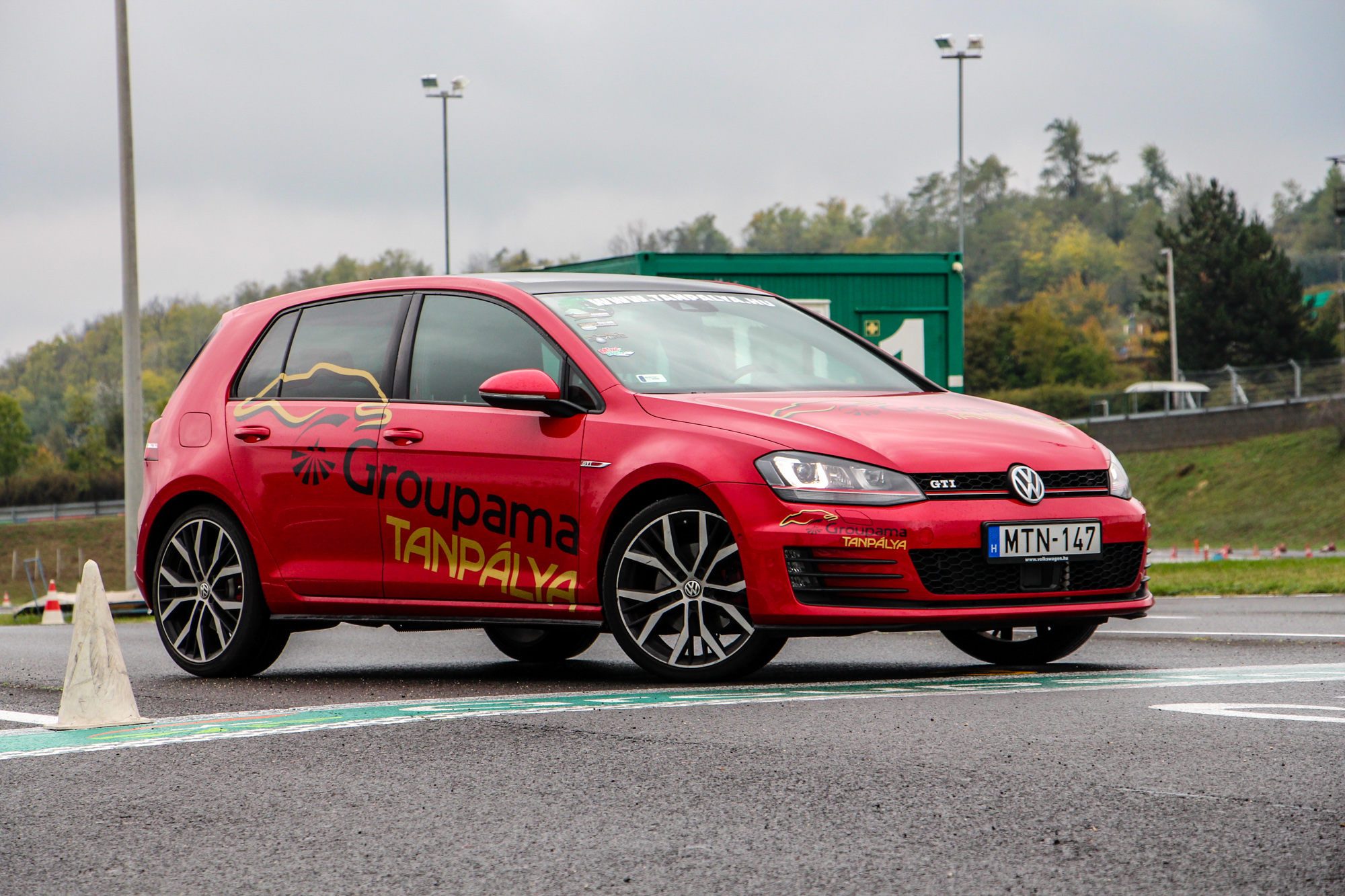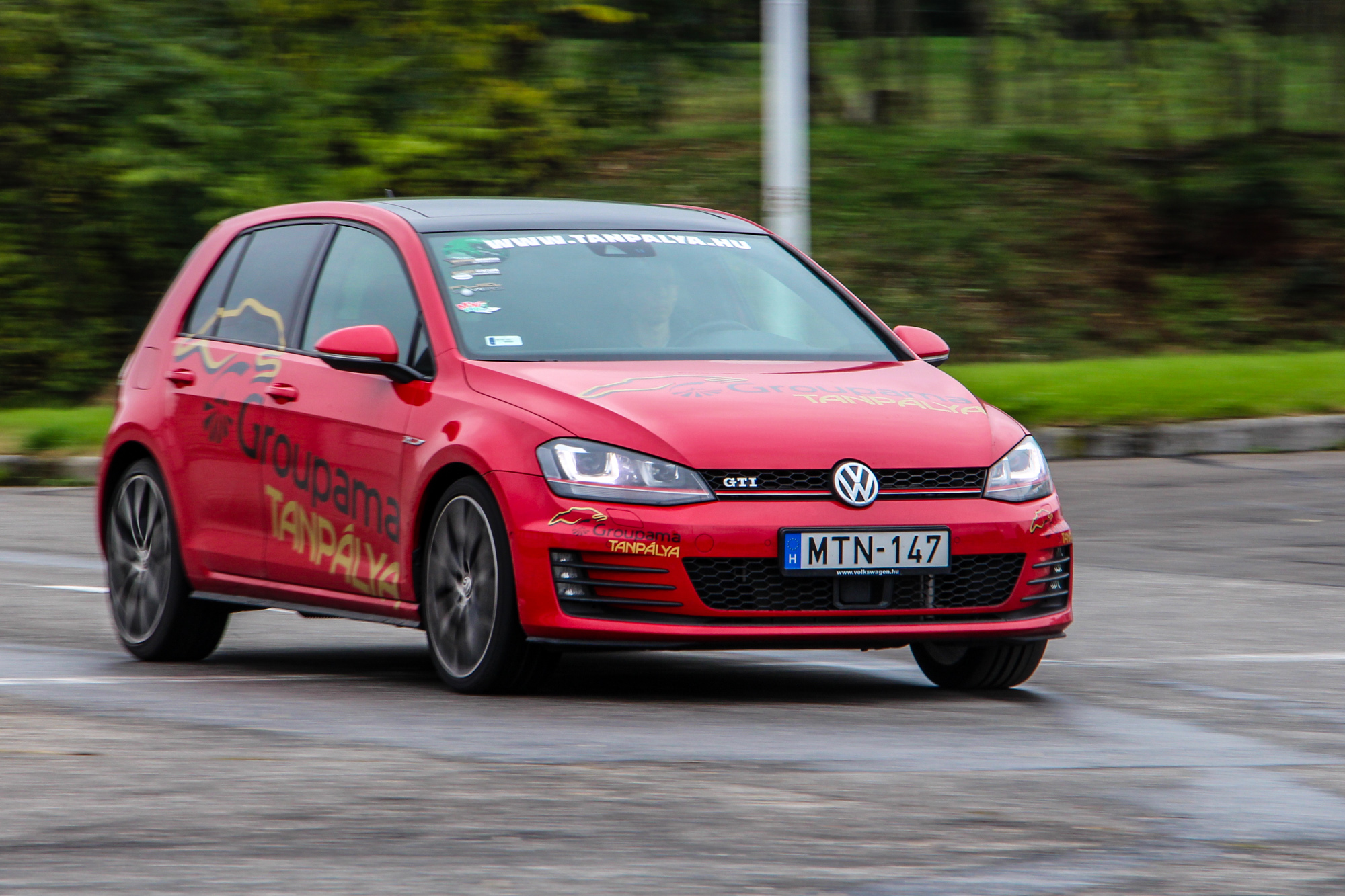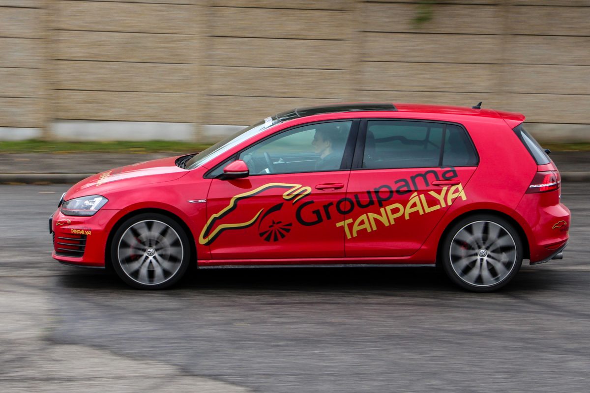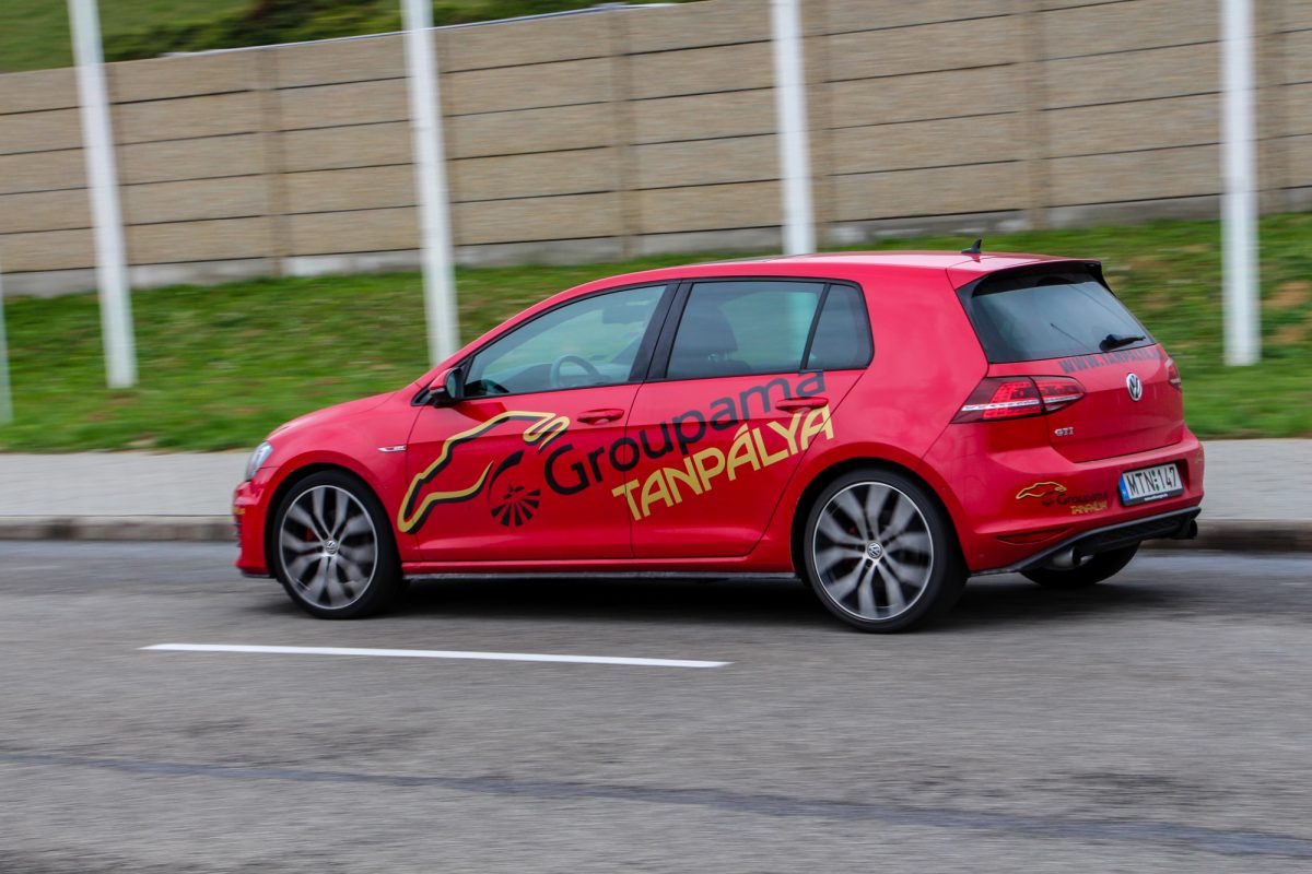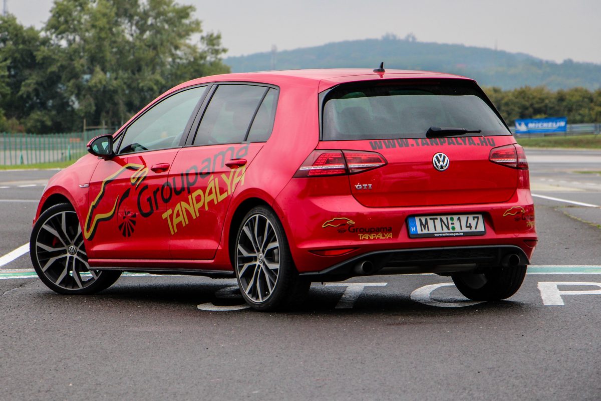 Tüzes. A Hungaroringen található Groupama Tanpálya egyik "szolgálati autója" a vörös Golf, a színvilág tökéletesen illik az autó formájához és vérmérsékletéhez. Dicséretre és említésre méltó az is, hogy a tornádópiros szín nem feláras. Igaz, hogy nem metál, de így is jól néz ki, és még plusz pénzt sem kérnek érte. A 18 colos kétszínű felnik is jól passzolnak a megjelenéshez, a VII-es Golf egy kellően sportos, ugyanakkor nem túl hivalkodó külsőt kapott. Első ránézésre a kevésbé szakavatott szemek ki sem szúrják, hogy egy 200 ló feletti autóval állnak szembe, a hűtőmaszkon és a csomagtérajtón meglapuló GTI logók viszont egyértelműen arról árulkodnak, hogy nem egy mezei modellel van dolgunk.