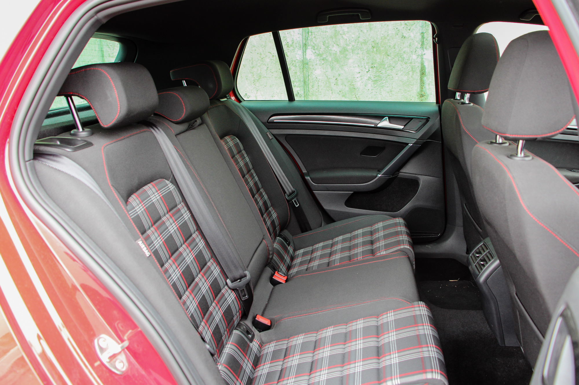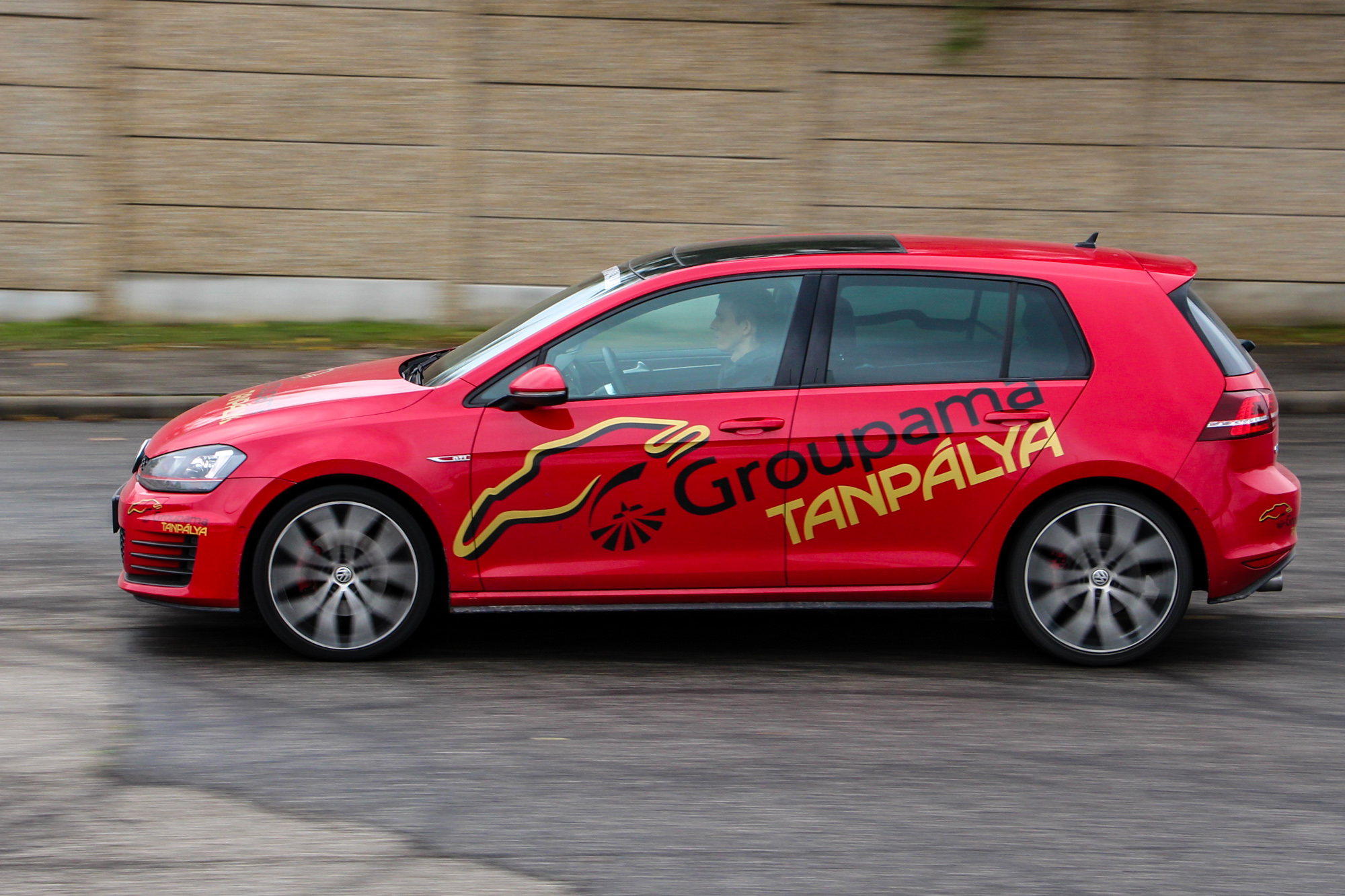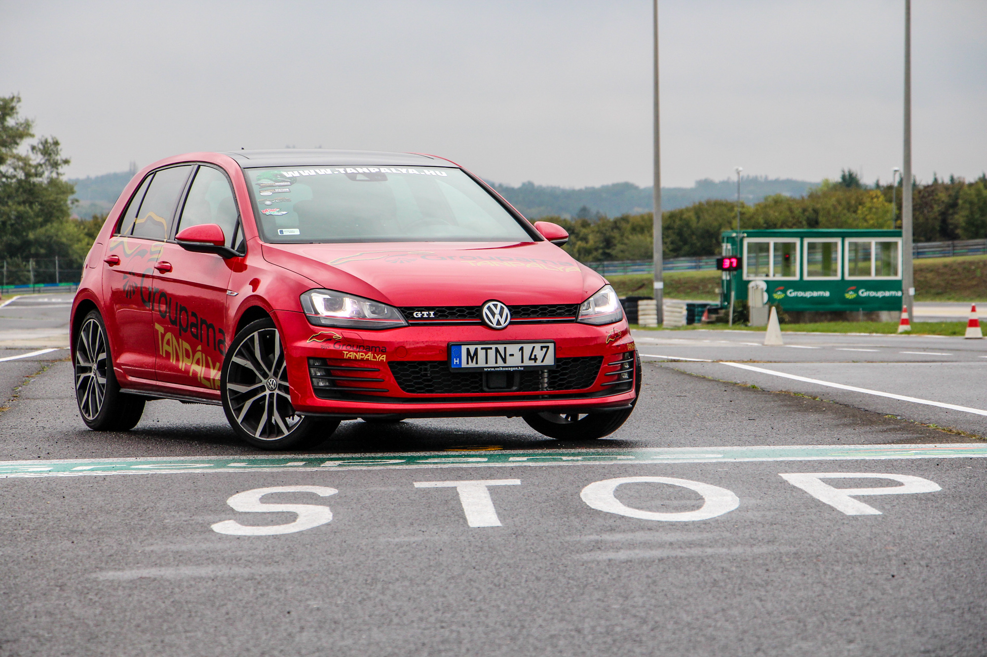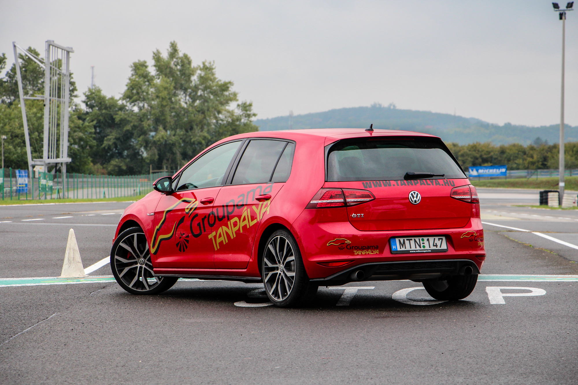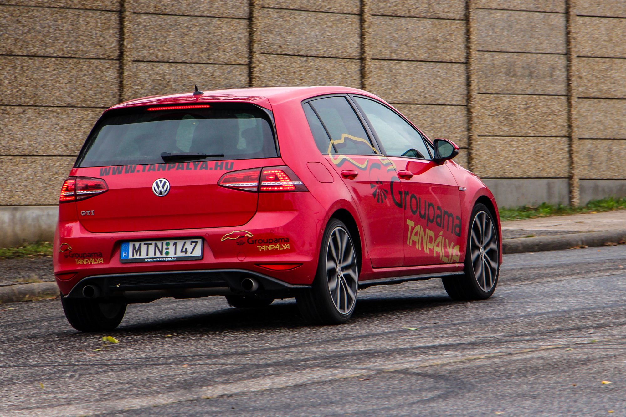 Tüzes. A Hungaroringen található Groupama Tanpálya egyik "szolgálati autója" a vörös Golf, a színvilág tökéletesen illik az autó formájához és vérmérsékletéhez. Dicséretre és említésre méltó az is, hogy a tornádópiros szín nem feláras. Igaz, hogy nem metál, de így is jól néz ki, és még plusz pénzt sem kérnek érte. A 18 colos kétszínű felnik is jól passzolnak a megjelenéshez, a VII-es Golf egy kellően sportos, ugyanakkor nem túl hivalkodó külsőt kapott. Első ránézésre a kevésbé szakavatott szemek ki sem szúrják, hogy egy 200 ló feletti autóval állnak szembe, a hűtőmaszkon és a csomagtérajtón meglapuló GTI logók viszont egyértelműen arról árulkodnak, hogy nem egy mezei modellel van dolgunk.