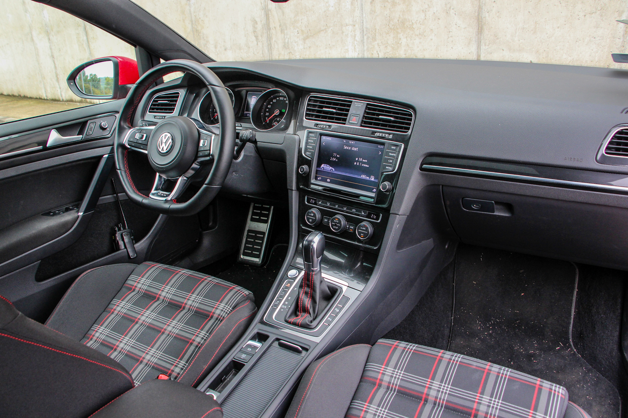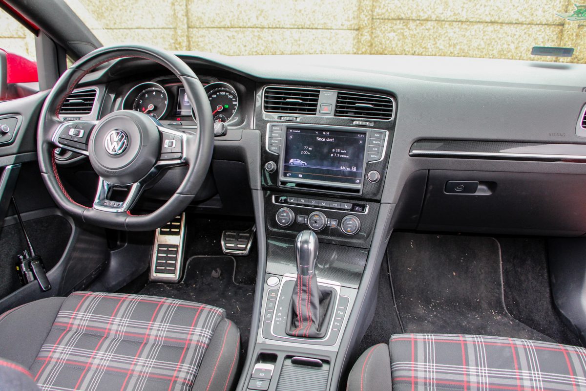 Árnyalatnyi különbség. A belső első körben valóban csak csak az ínyenceknek szúr szemet. Sok pici dologban különbözik egy nem GTI Golftól, az összkép azonban mégis más. Az ülések kárpitozásán kívül a piros cérnával varrott és alul egyenesen lecsapott, GTI felirattal díszített kormány, valamint váltógomb-szoknya, továbbá a karbonszálakat utánzó berakások és a fém pedálok árulják el, hogy GTI-vel van dolgunk. Az ülések kényelmesek, jó oldaltartással bírnak, a prémium német márkáknál megszokott néhány funkció viszont hiányzik belőle.