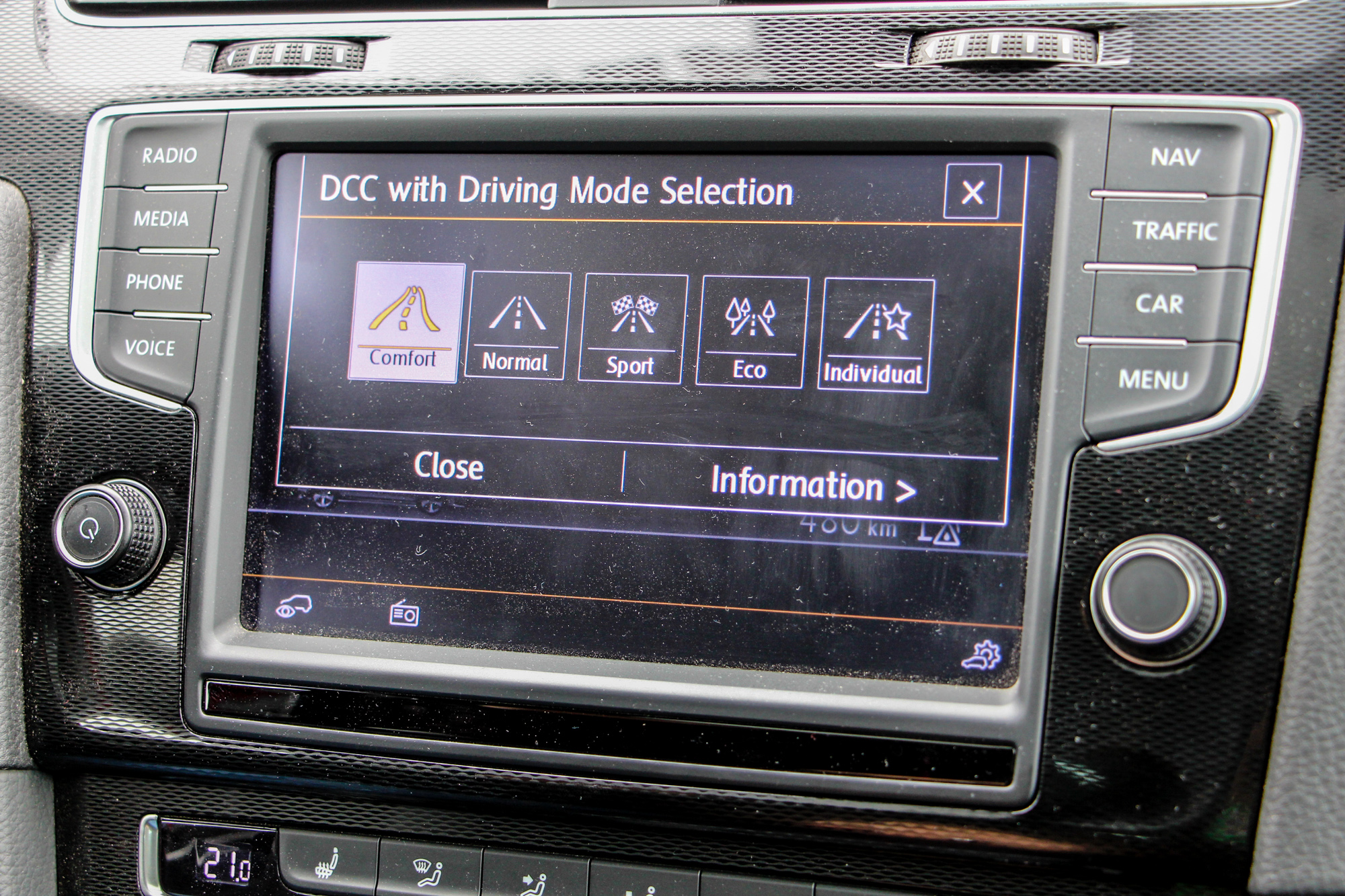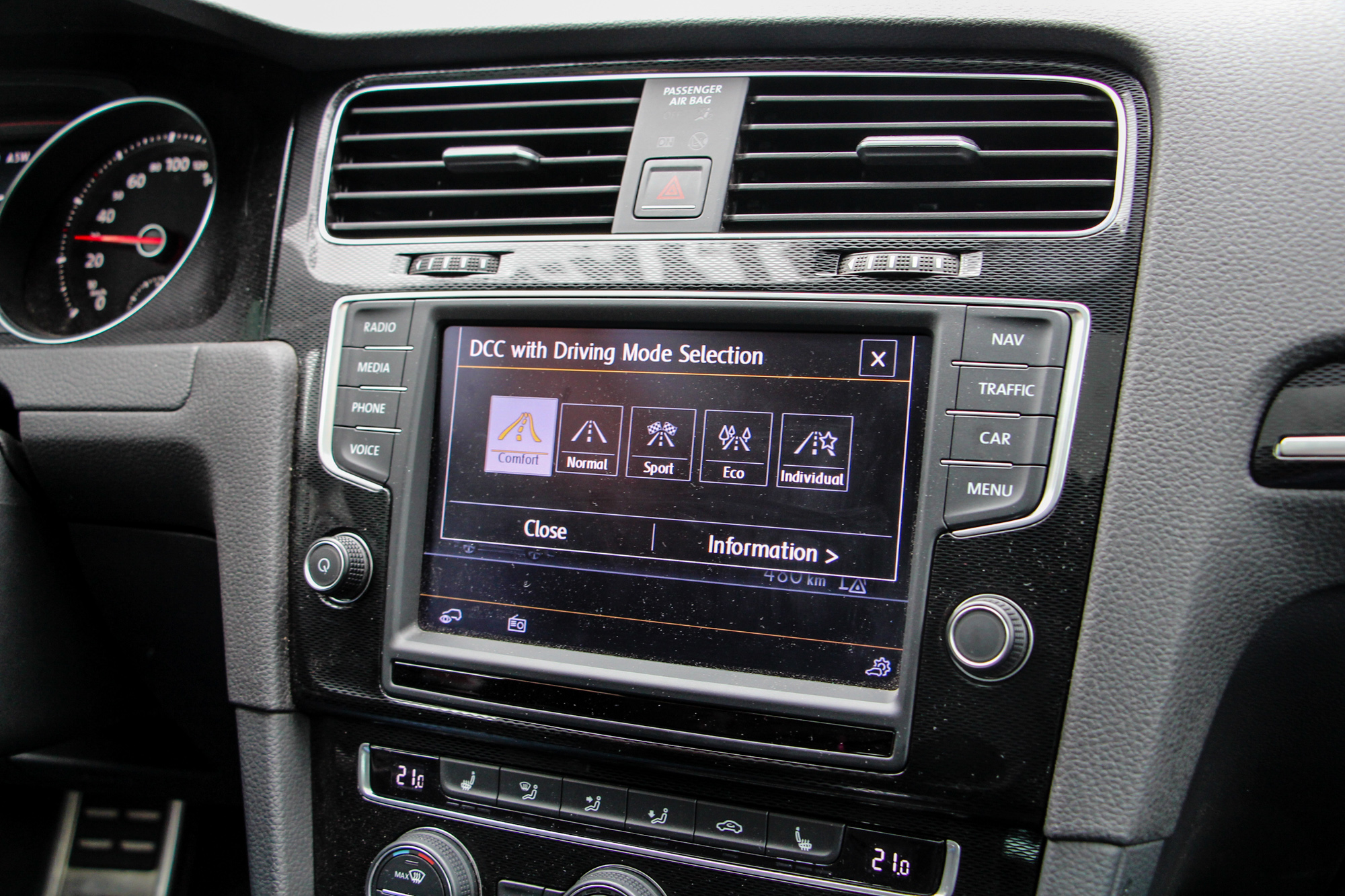 Szokni kell, hogy az indítógomb a váltó mellé került. A parkolóradar mellett parkolóasszisztens is megtalálható, mellyel automatikusan beáll a Golf a kiválasztott helyre