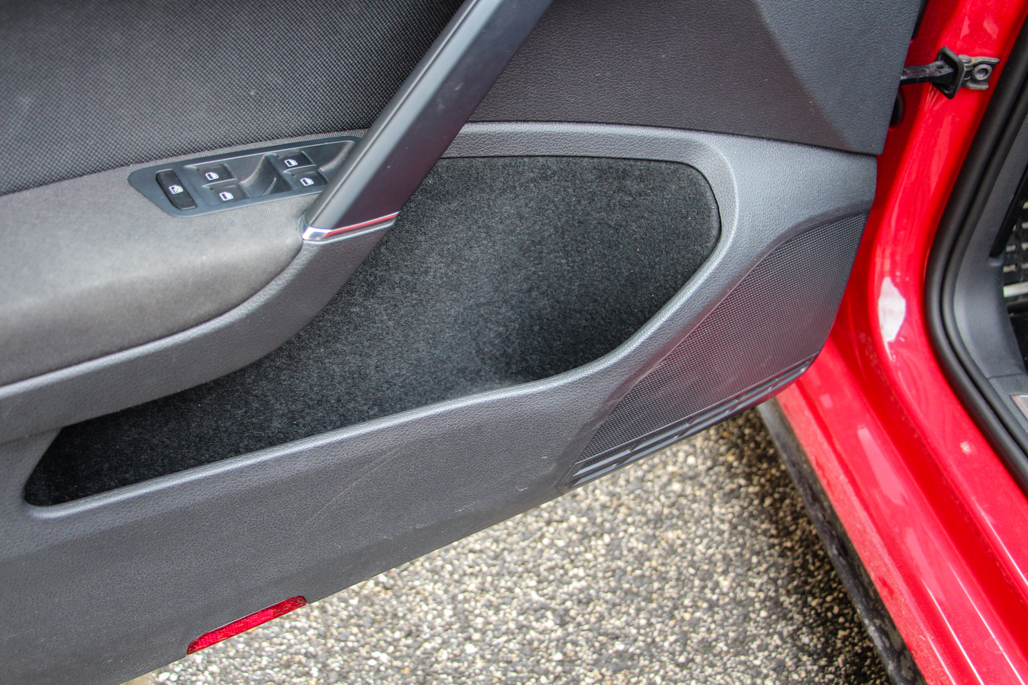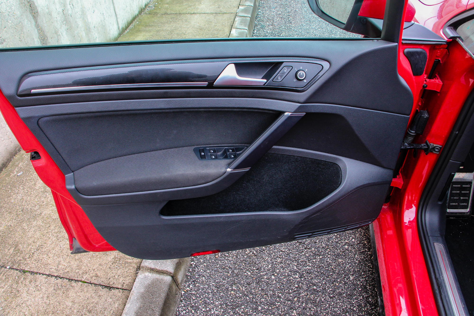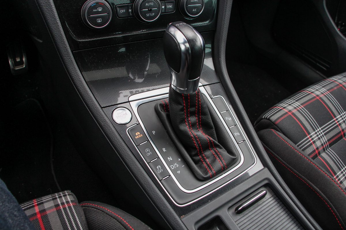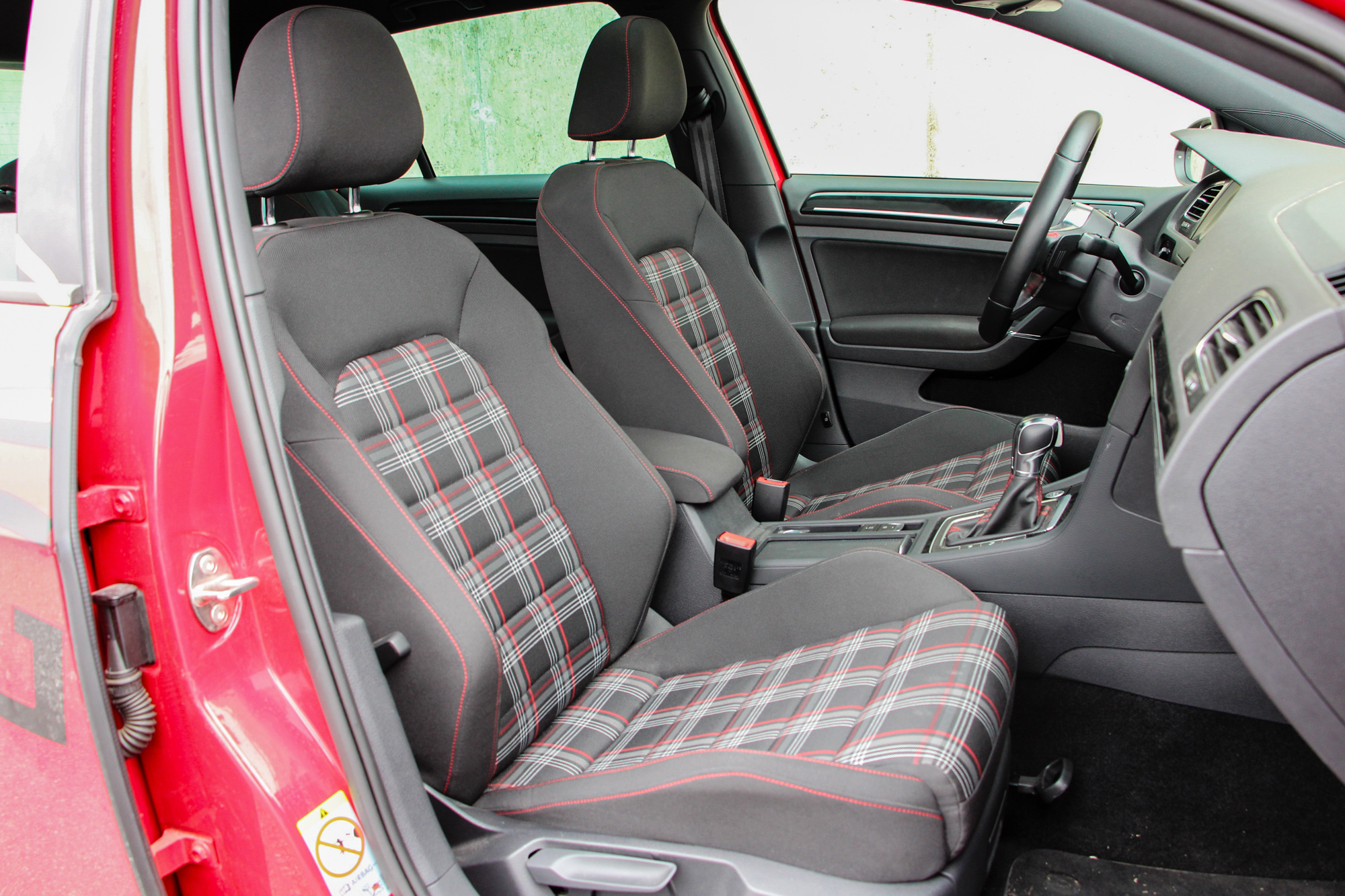 Nem csak kívül, belül is a piros szín utal a sportosságra, utóbbi esetén a varrások kapcsán. A kormány jó fogású, a DSG váltó a jól megszokott gyorsasággal kapcsol a GTI-ben