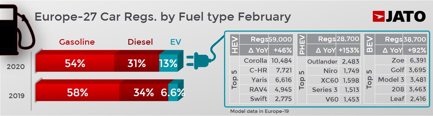 Megérkeztek az egyik legnagyobb járműpiaci elemző cég, a Jato februári statisztikái az új autók piacáról. Az Egyesült Királyság adatait is tartalmazó EU-s beszámoló nem mutat túl fényes számokat, az előző hónapban 1.063.264 új autót regisztráltak, ami 7%-os csökkenés 2019 ugyanezen időszakához képest, és a leggyengébb teljesítmény 2015 óta. Vannak azonban jó hírek is,
