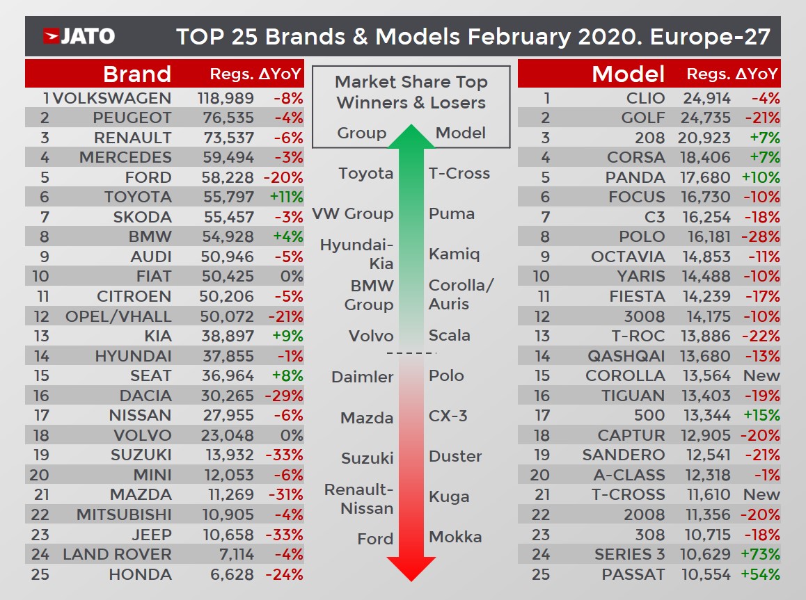 Márkákra és modellekre lebontva az adatokat további érdekességeket fedezhetünk fel, a legtöbb új autót még mindig a Volkswagen értékesítette, őket követi a Peugeot, a Renault, a Mercedes és a Ford. Nagyot lépett előre a Toyota, a piac 7%-os zsugorodása ellenére 11%-kal tudták növelni eladásaikat. Az átlagnál jóval komolyabb esést produkált a Ford (bár még ennek ellenére is az első 5 márka között vannak), az Opel, a Dacia, a Suzuki, a Mazda, a Jeep és a Honda. Piaci részesedést tekintve a Ford és a Renault/Nissan vesztette a legtöbbet, a Toyota és a Volkswagen-csoport pedig a legtöbbet nyert. A Ford gyengülő teljesítménye ellenére viszont az új Puma volt a második legtöbb piaci részesedést nyerő modell a Volkswagen T-Cross után, a Toyota Corolla/Auris páros pedig a negyedik helyre fért be ezen a listán a szárnyaló Skoda Kamiq és Scala közé. A legtöbb piaci részesedést egy év alatt az Opel Mokka és a Ford Kuga vesztette. További érdekesség, hogy nagyot csökkentek a Volkswagen Golf eladásai (bár ez valószínűleg a generációváltásnak köszönhető), így februárban a legtöbbet eladott modell a Renault Clio lett. Sokat javult a Peugeot 208 és az ezen alapuló Opel Corsa, illetve bekerült a top 10 modell közé a Fiat Panda is. Emellett nagyon népszerű lett az új 3-as BMW és a Volkswagen Passat, 73 és 54 százalékos növekedést produkáltak, ezzel a középkategória eladásainak 31%-át ez a két modell adta.