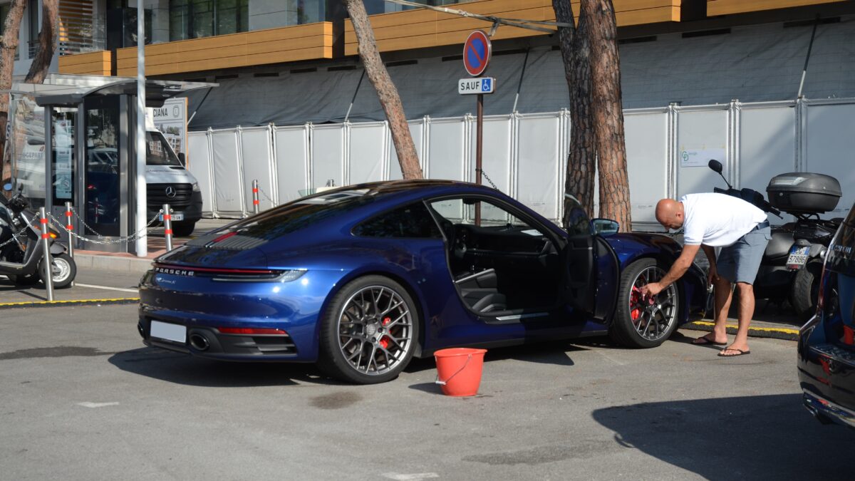 Teljesen hétköznapi látkép: egy úr vödörből mossa a Porschéját a parkolóban