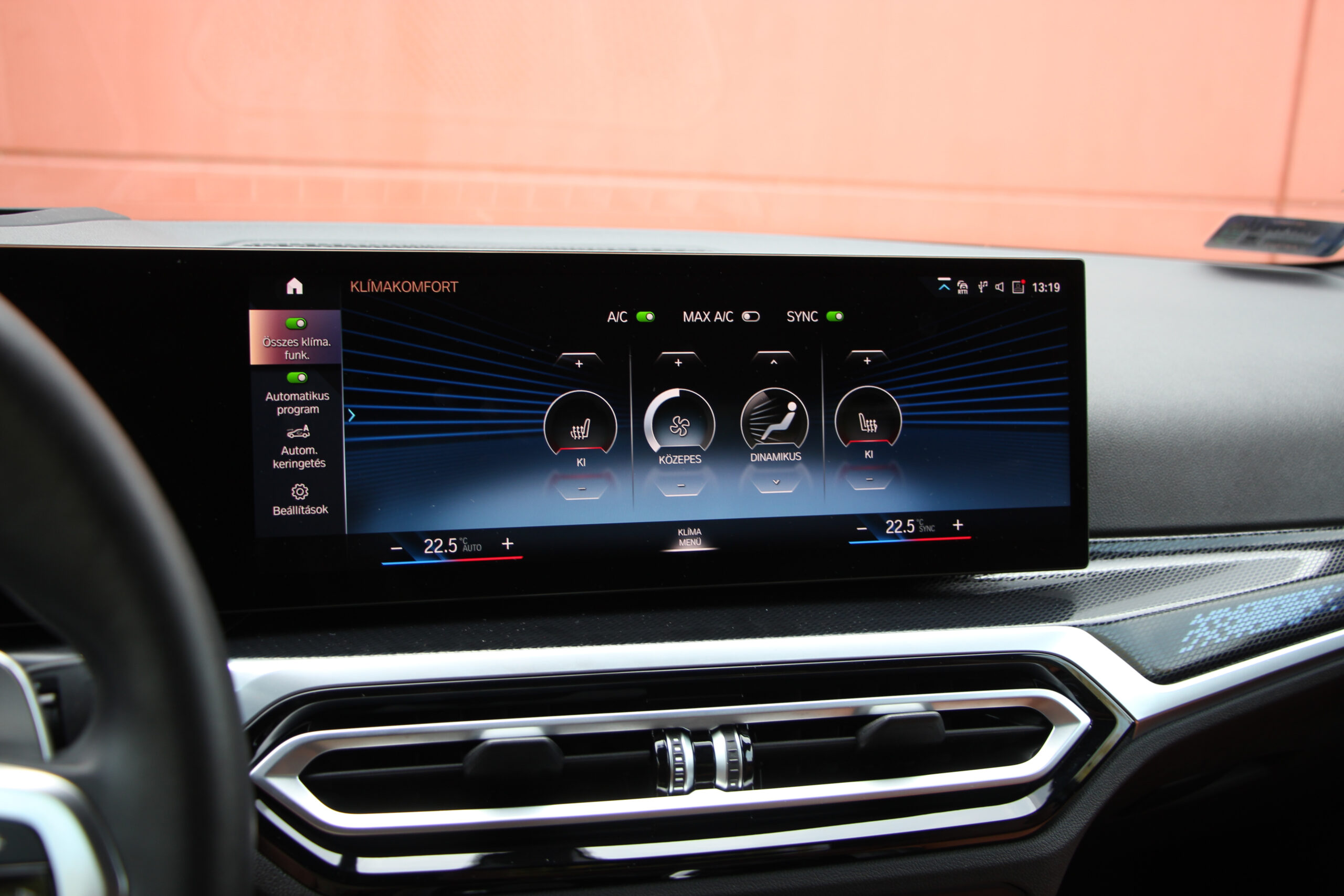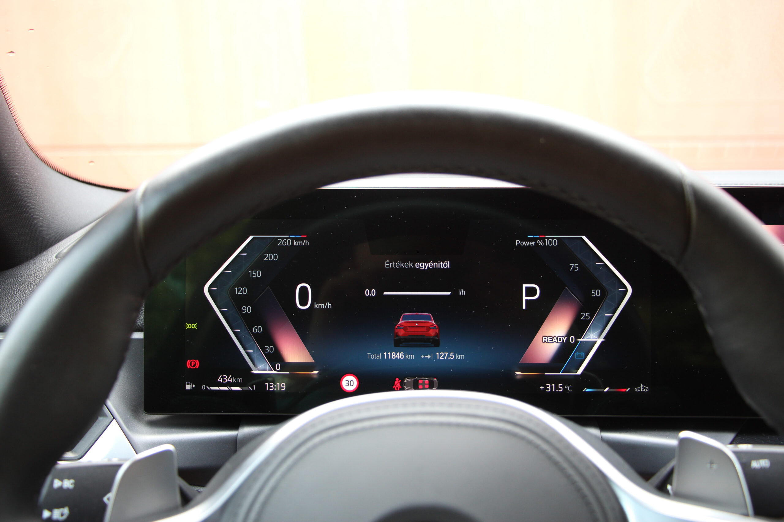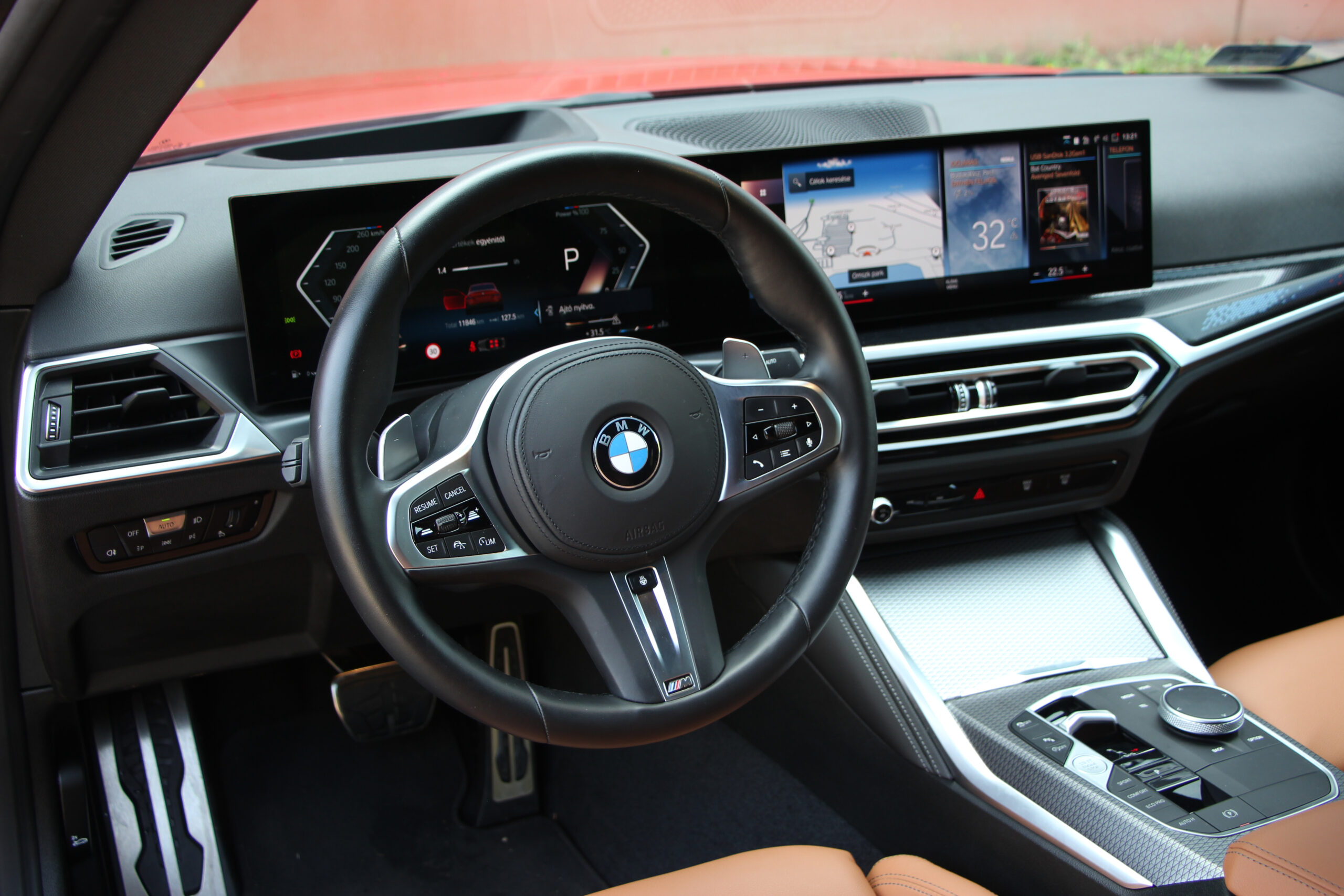 Talán mondanom sem kell, hogy az utastér a BMW-nél széles határok között személyre szabható, a tesztautókat általában kimondottan igényesen válogatják össze, így történt ez most is. A konyak műbőr sportülések elképesztően kényelmesek, jól tartanak comb és deréktájon is. Ugyanebből a színű műbőrből jutott az ajtókra is, ahol a BMW sportrészlegének színei adnak megfelelő aláfestést esténként a cirkáláshoz. A műszerfal a márkától megszokott, technokrata hangulatú a nagy digitális képernyőkkel. Továbbra is csak a kormánykerék vastagságába tudok belekötni, ezt már igazán elengedhetnék a bajorok. Viszont a rövidségéhez képest használhatók a hátsó ülések, persze hosszabb távra ide ne ültesetek felnőtteket, sőt, a 390 literes csomagtér se kicsi. Na jó, azért annyira nem is kicsi, mert 4,5 méter hosszú, a tengelytávolsága pedig 2,74 méter, szóval ez a 3-as sorozat platformjára épül, de annál viszont tényleg szűkösebb.