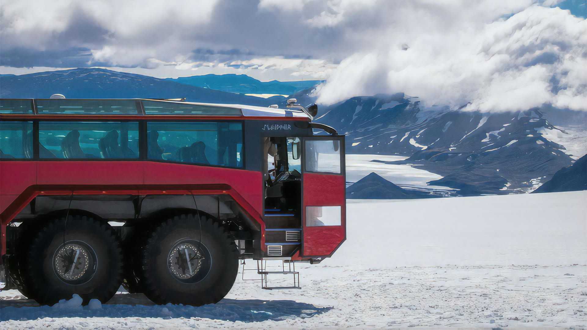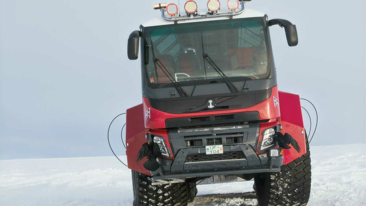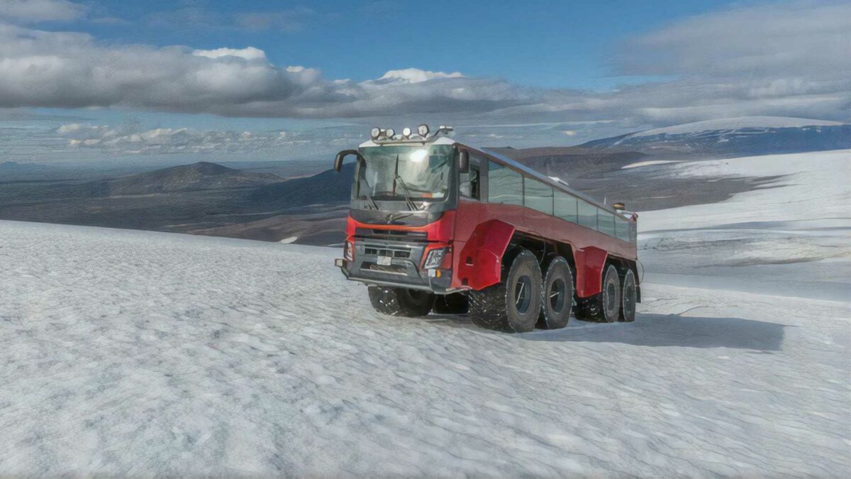Az olvadó gleccserek megközelítése nem könnyű feladata, ahol a terepjárók már feladnák, ott könnyűszerrel robog tovább a nyolckerekű szörnyeteg.